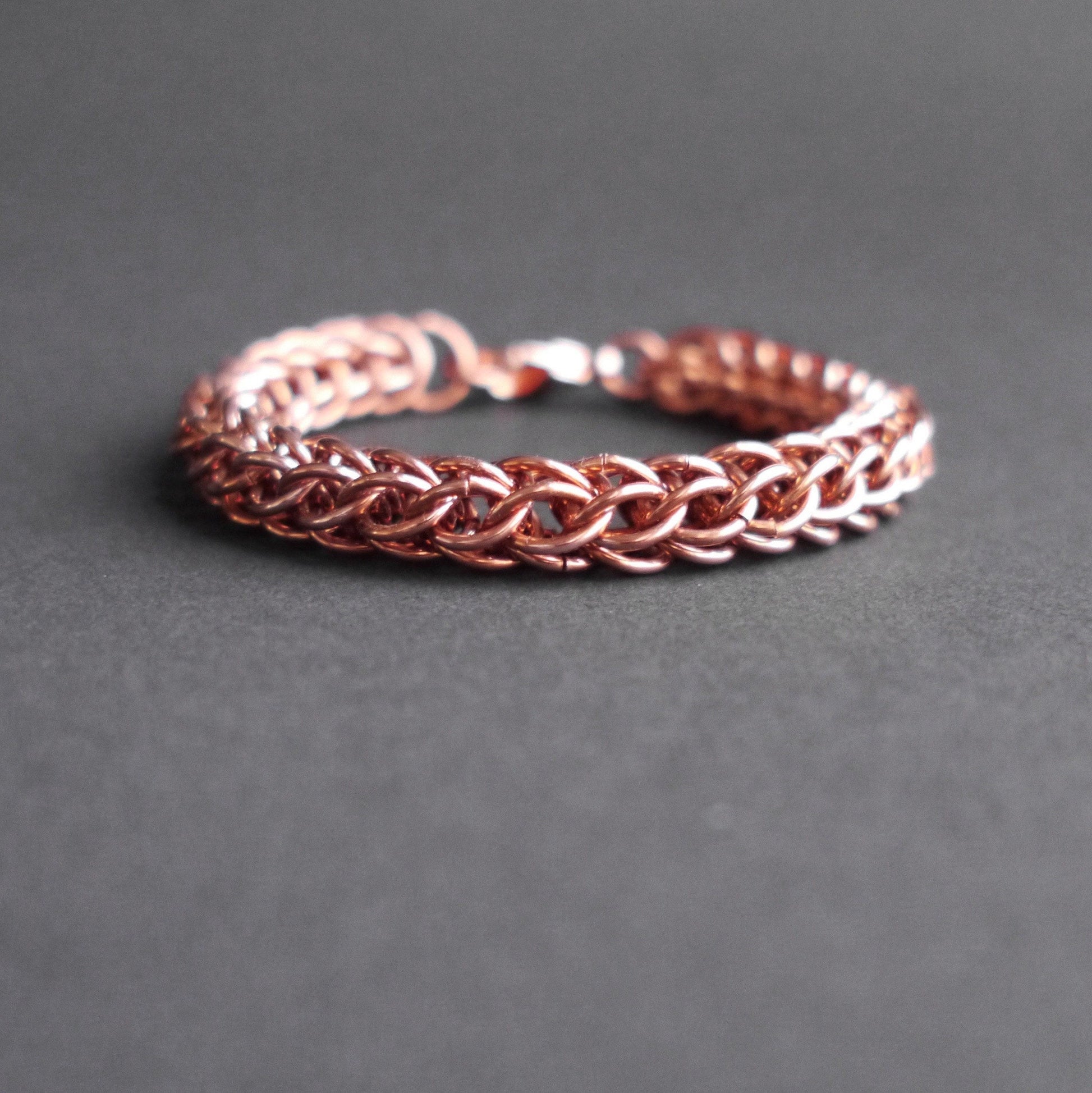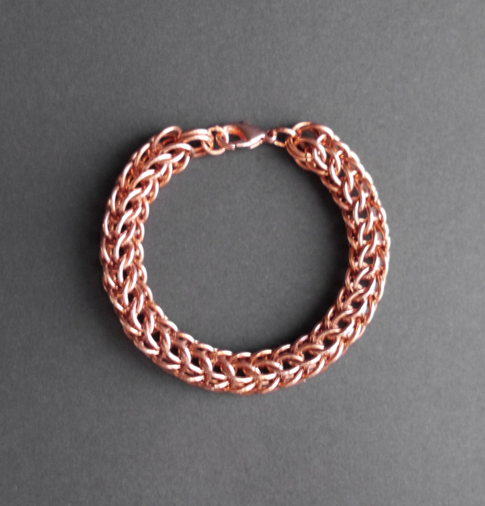 These intricate chainmaille bracelets are handcrafted in our studio from recycled copper wire. The meticulous weaving of hundreds of tiny rings makes these bracelets incredibly sturdy and exceptionally comfortable to wear. They are truly timeless and stylish for all genders. This Full Persian 6-in-1 weave bracelet has a width of 10mm and is crafted from 16 gauge recycled copper wire, and closes with a copper lobster clasp.