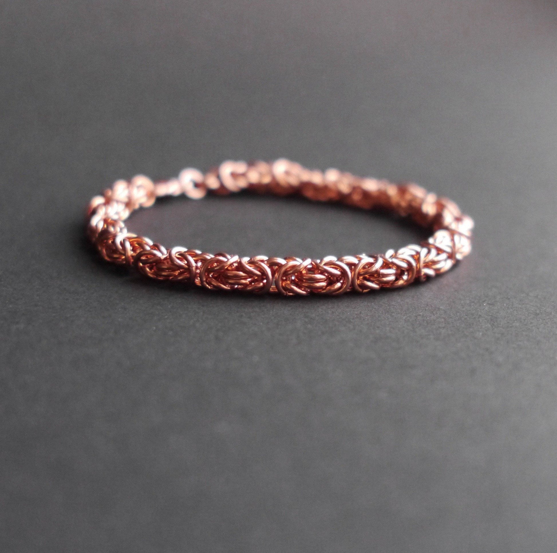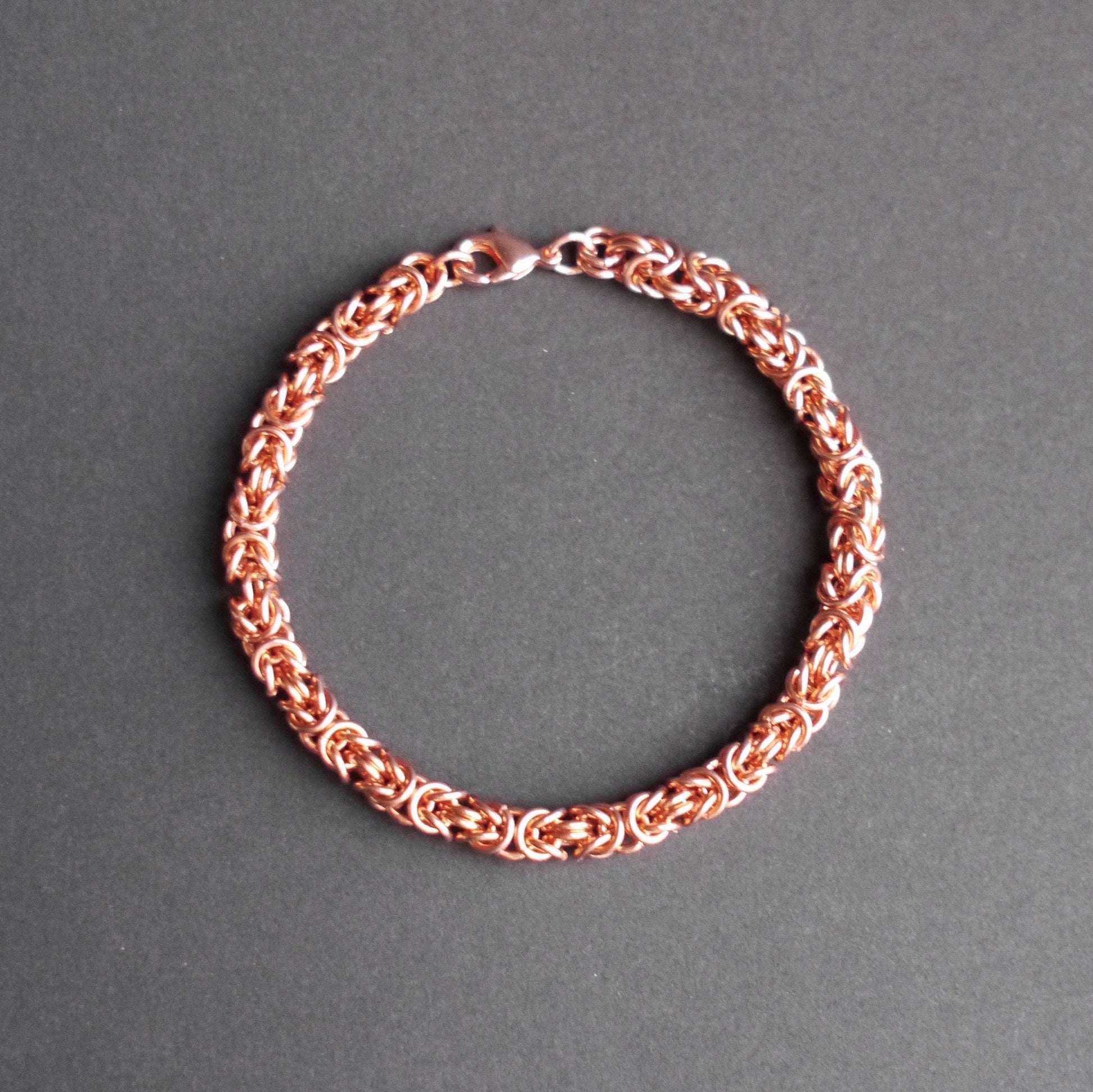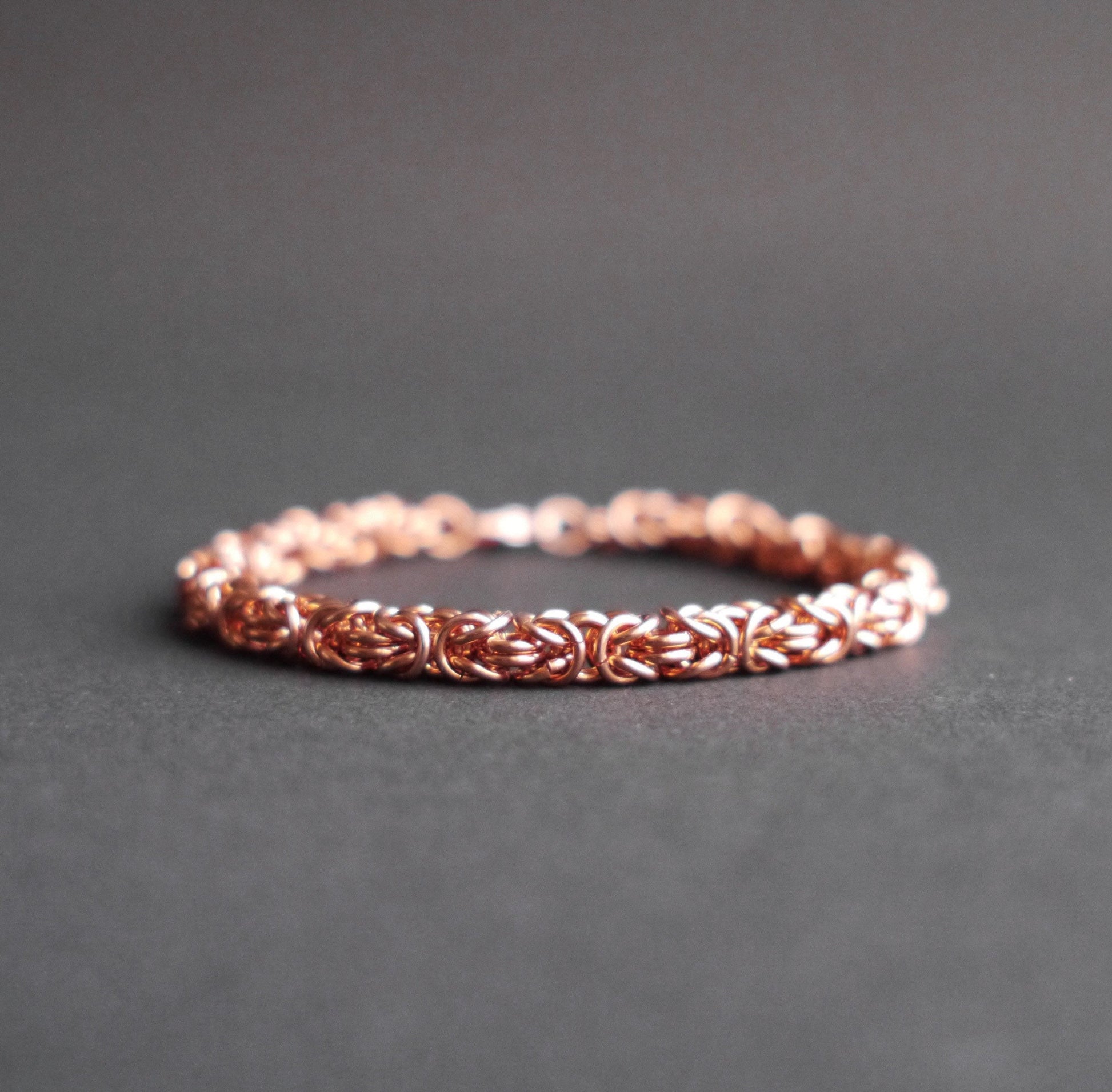 These intricate chainmaille bracelets are handcrafted in our studio from recycled copper wire. The meticulous weaving of hundreds of tiny rings makes these bracelets incredibly sturdy and exceptionally comfortable to wear. They are truly timeless and stylish for all genders. This Byzantine weave bracelet is crafted from 18 gauge recycled copper wire, has a width of 6mm, and closes with a lobster clasp.