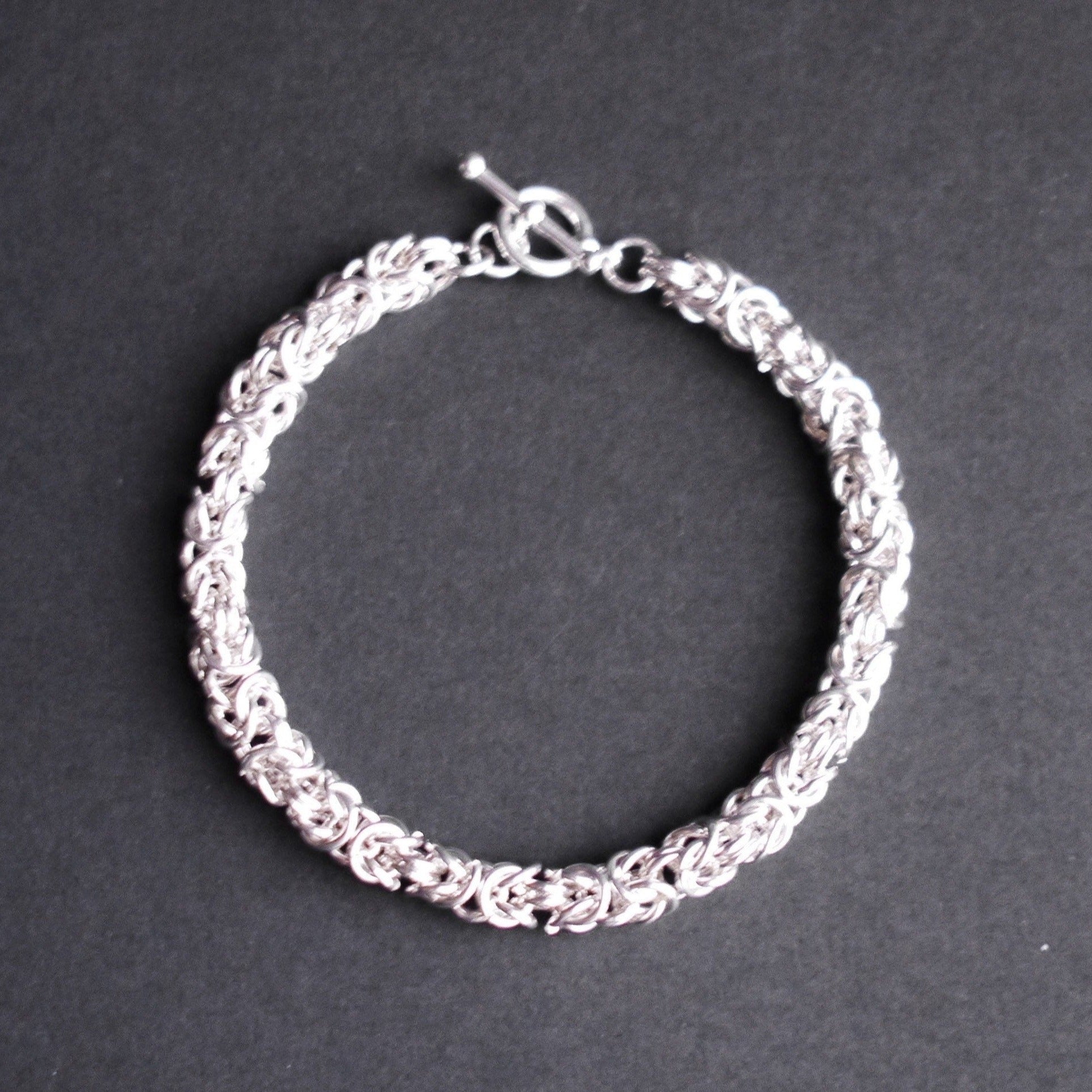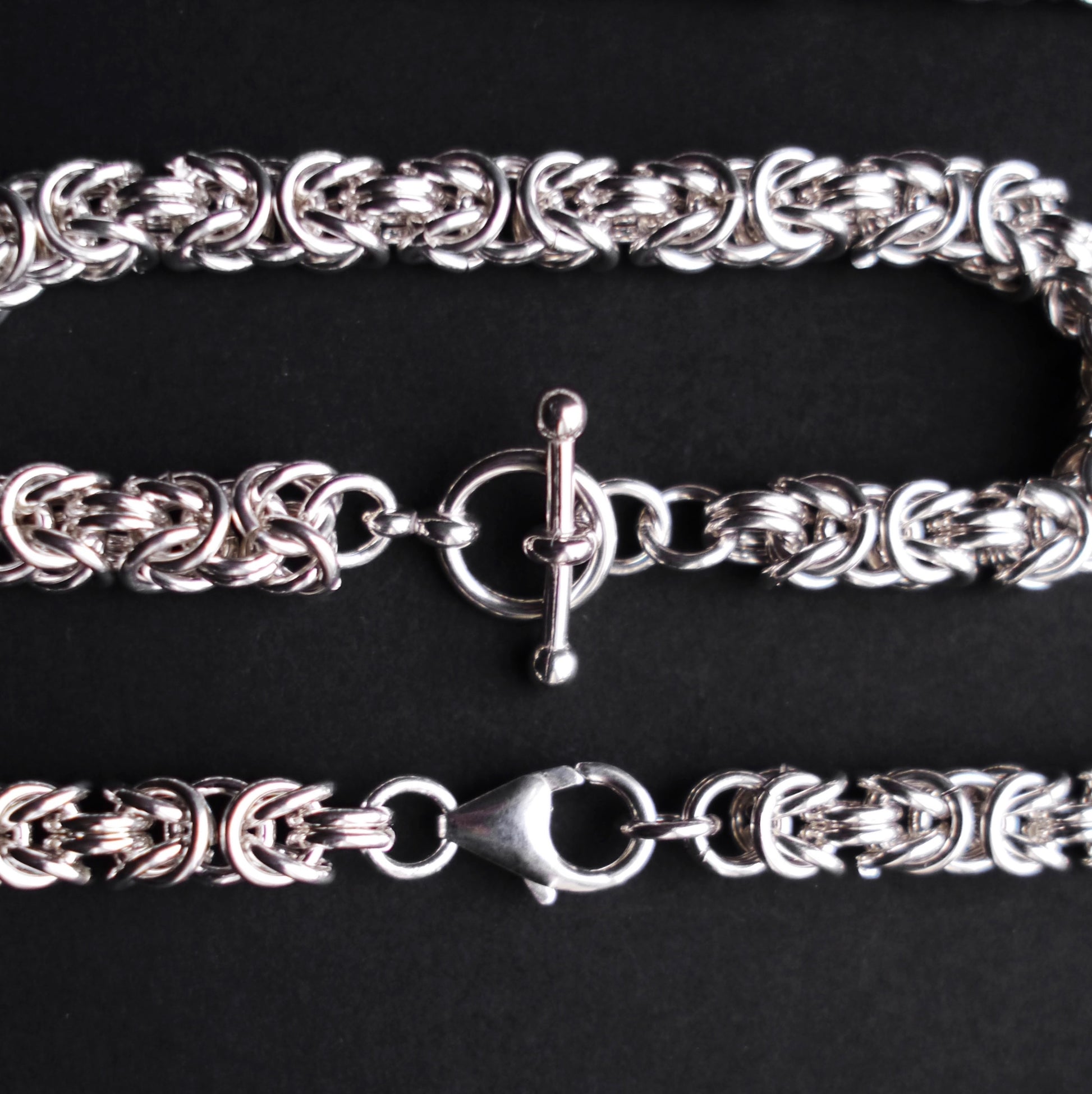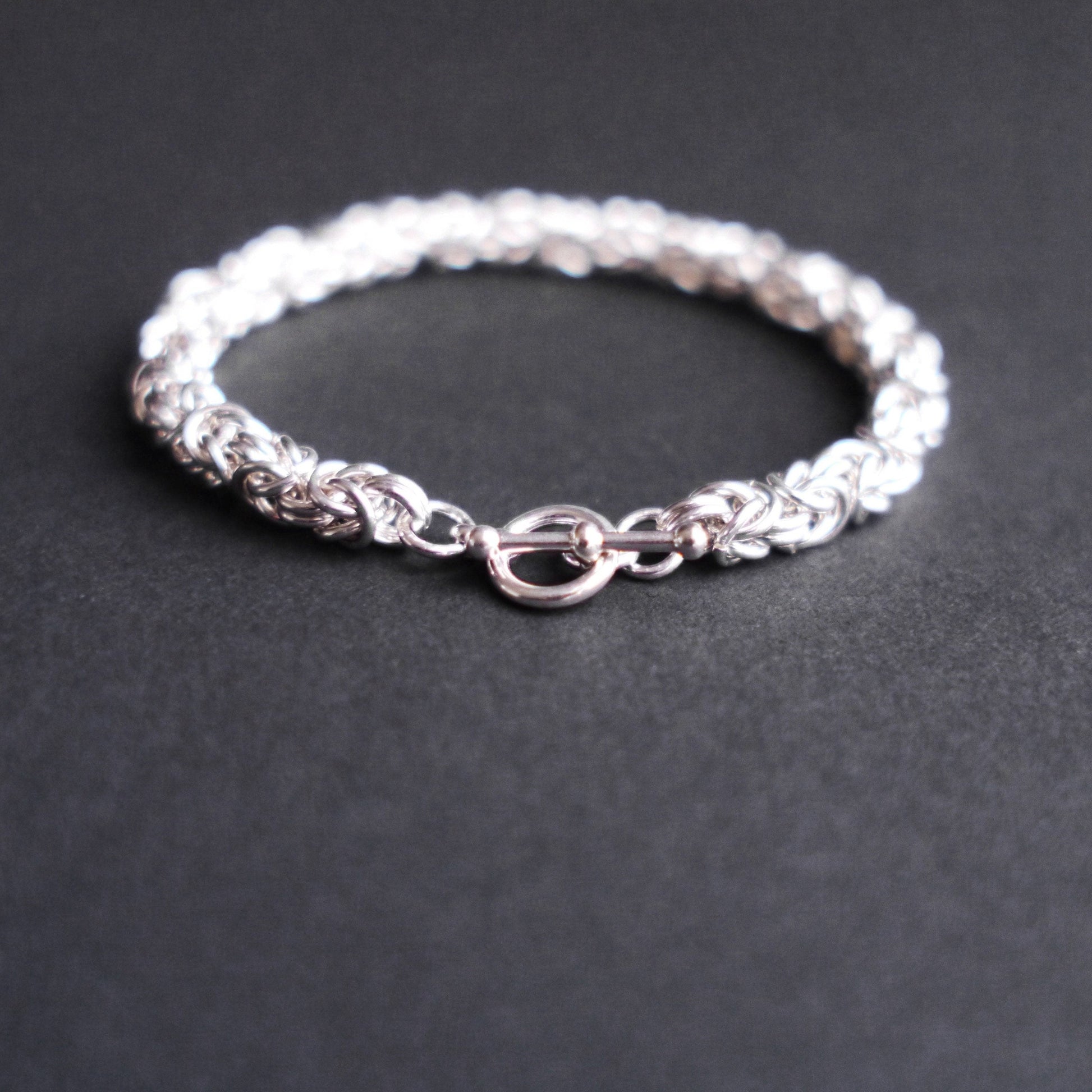 These intricate chainmaille bracelets are handcrafted in our studio from recycled sterling silver wire. The meticulous weaving of hundreds of tiny rings makes these bracelets incredibly sturdy and exceptionally comfortable to wear. This Byzantine weave bracelet has a width of 6mm and is crafted from 18 gauge sterling silver wire. It can be customized with either a toggle clasp or a lobster clasp in the order options. If you are looking for a slightly larger diameter Byzantine weave, check out our 5mm and 7mm Byzantine bracelet listings!