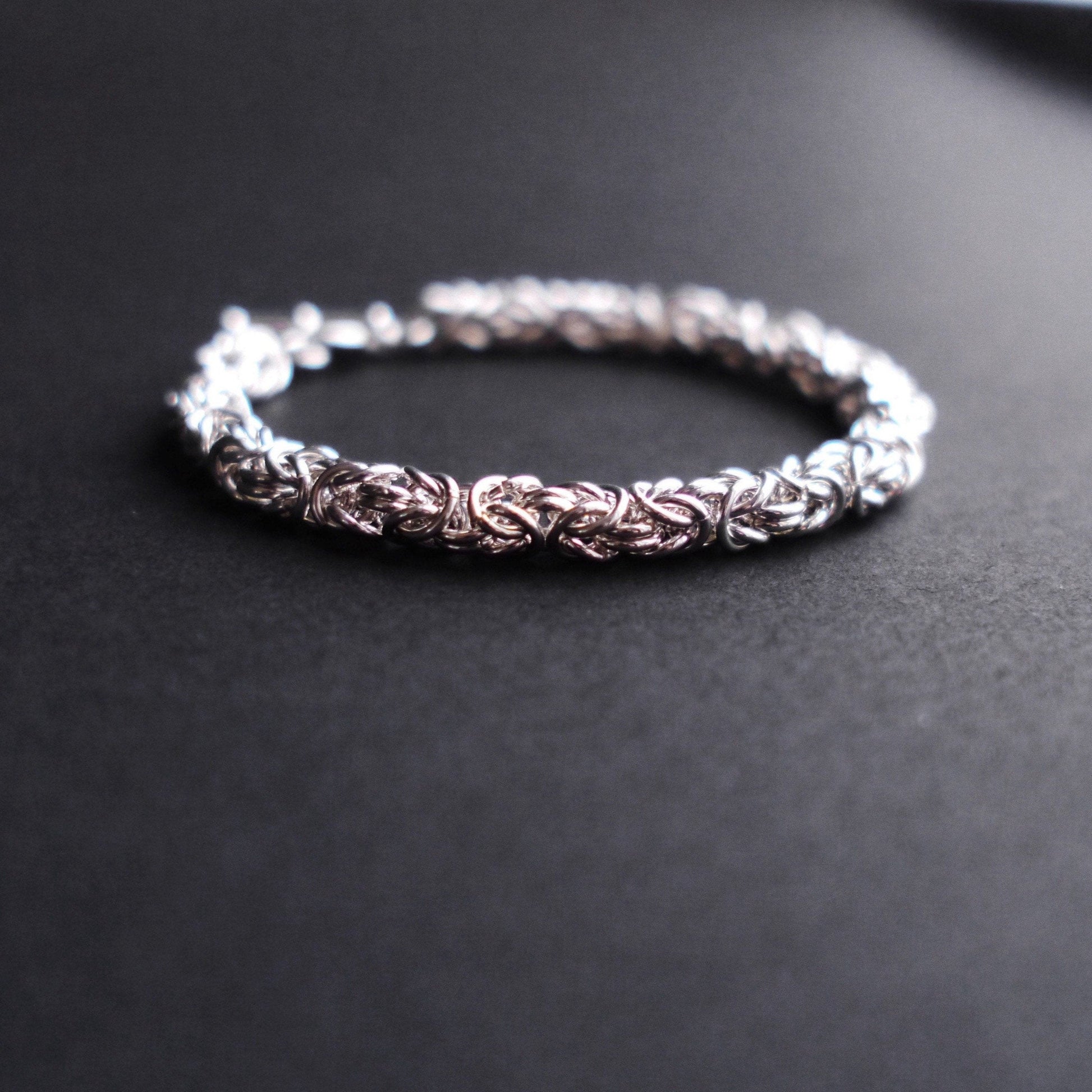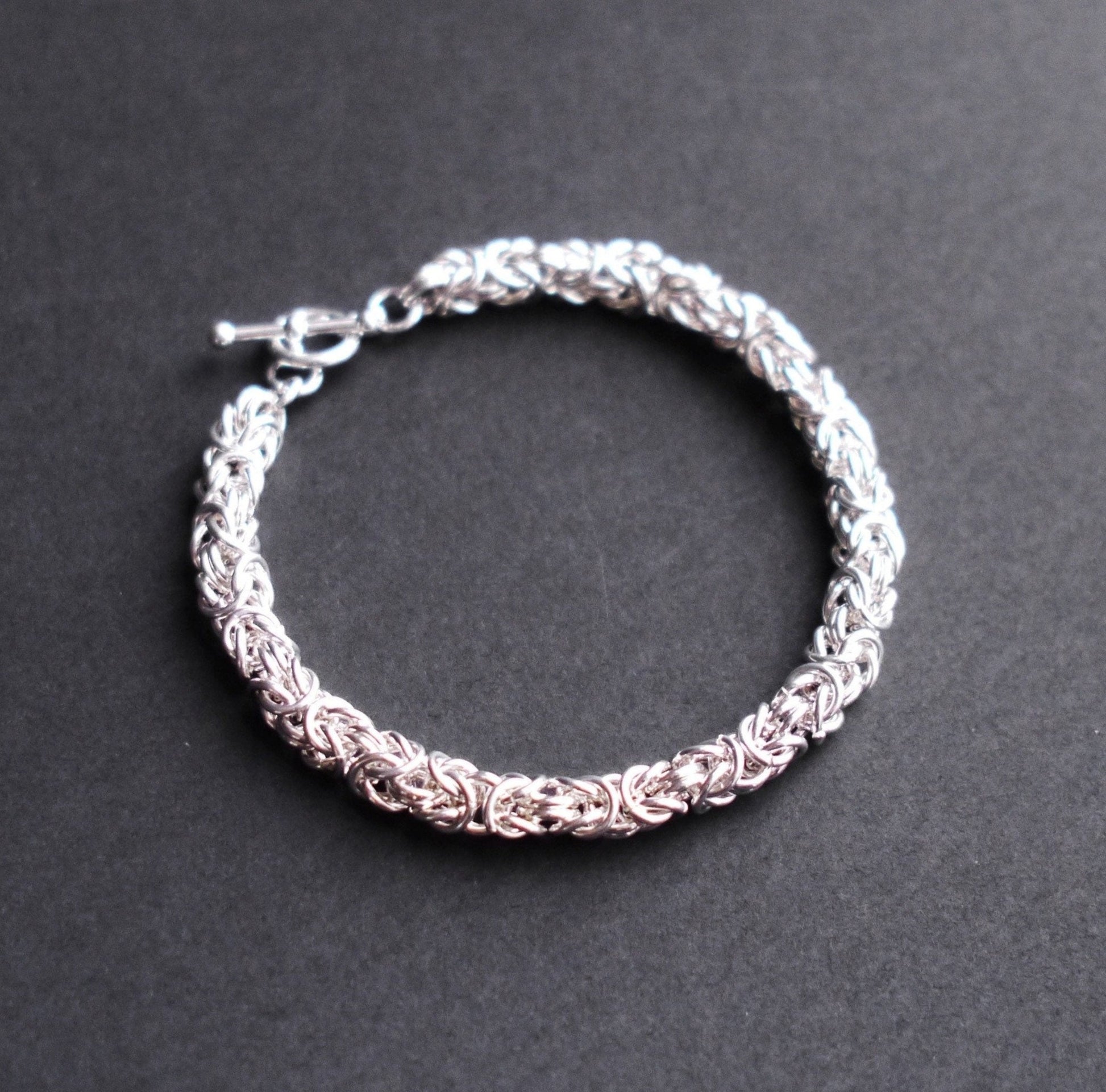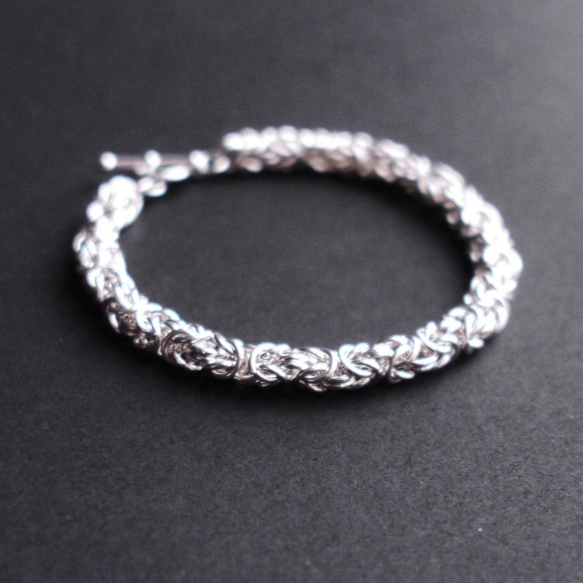 These intricate chainmaille bracelets are handcrafted in our studio from recycled sterling silver wire. The meticulous weaving of hundreds of tiny rings makes these bracelets incredibly sturdy and exceptionally comfortable to wear. This Byzantine weave bracelet has a width of 6mm and is crafted from 18 gauge sterling silver wire. It can be customized with either a toggle clasp or a lobster clasp in the order options. If you are looking for a slightly larger diameter Byzantine weave, check out our 5mm and 7mm Byzantine bracelet listings!