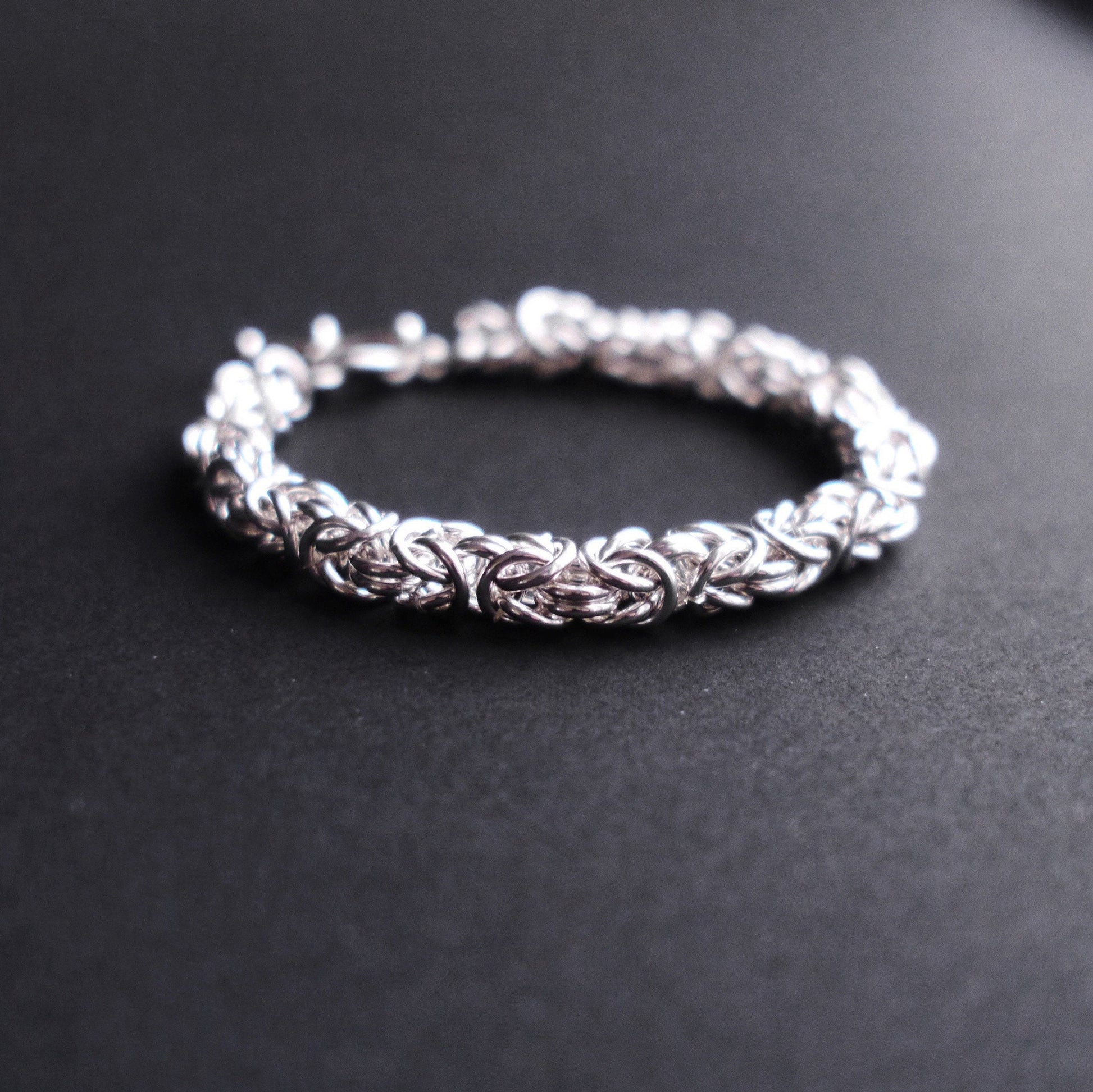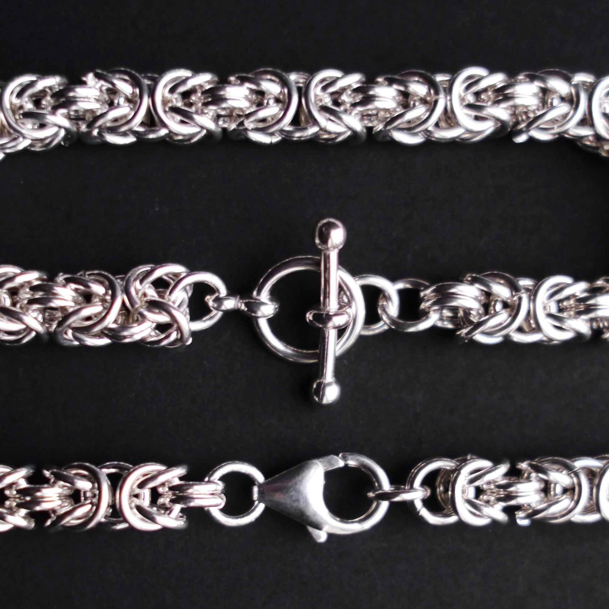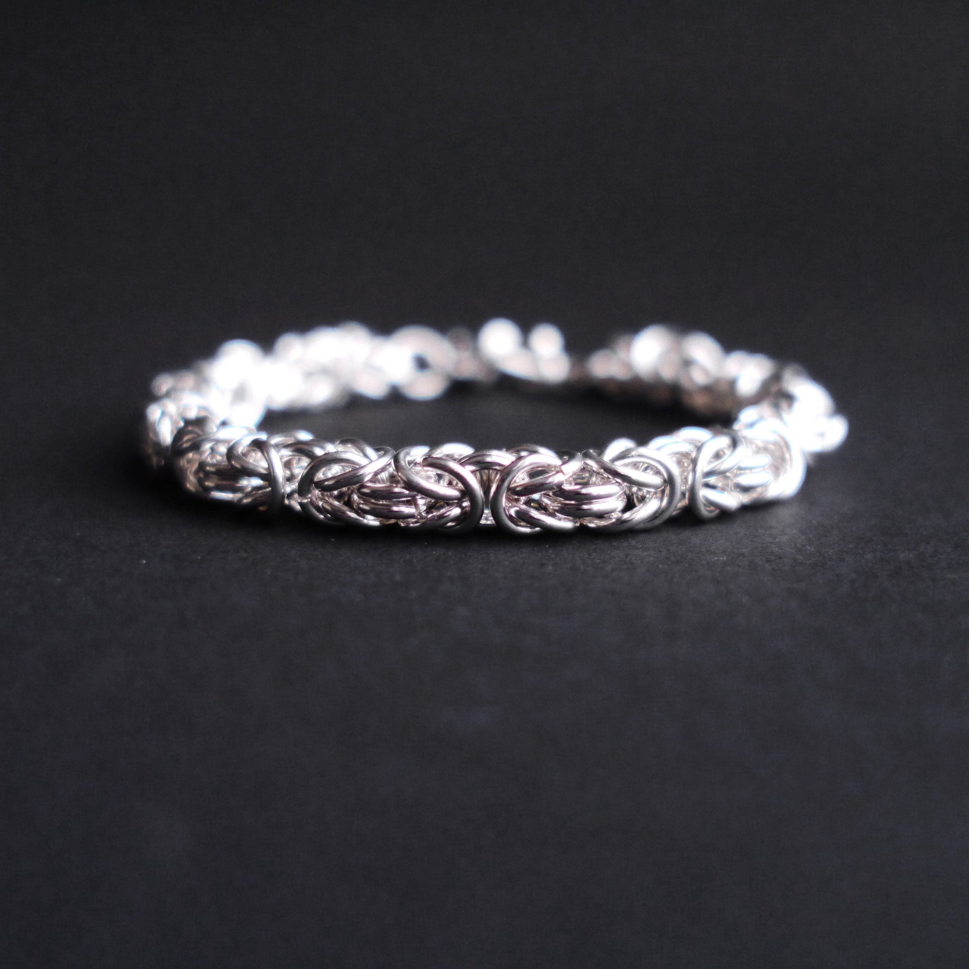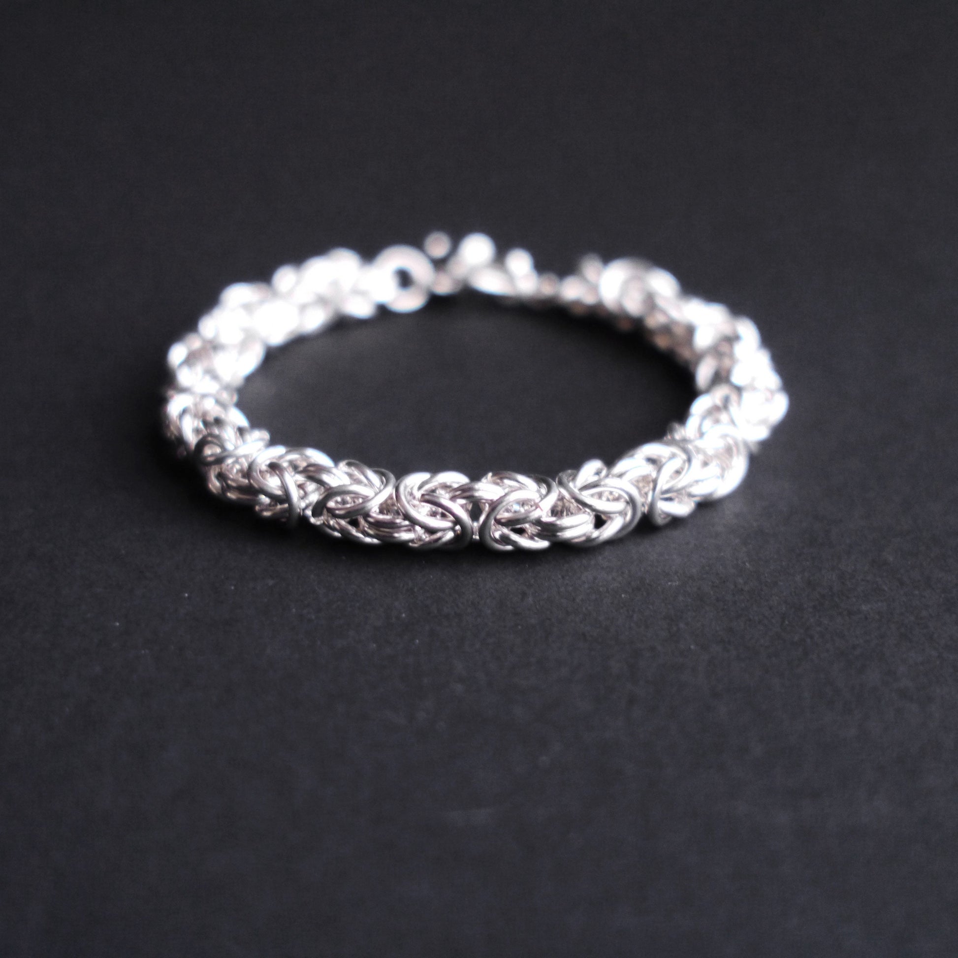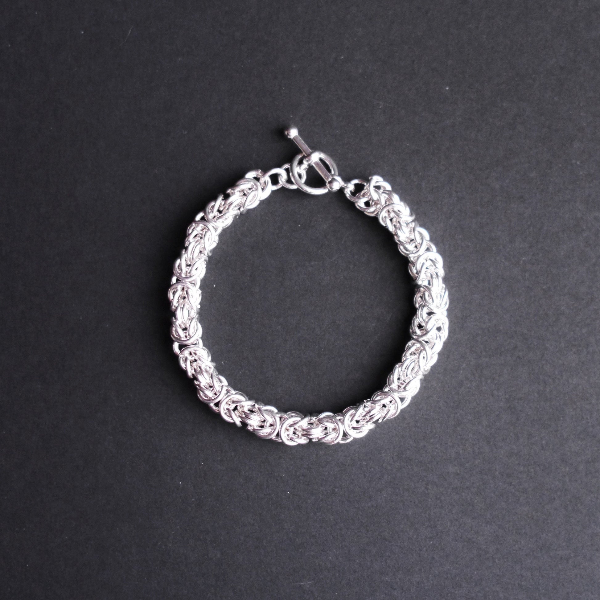 These intricate chainmaille bracelets are handcrafted in our studio from recycled sterling silver wire. The meticulous weaving of hundreds of tiny rings makes these bracelets incredibly sturdy and exceptionally comfortable to wear. This Byzantine weave bracelet has a width of 7mm and is crafted from 16 gauge sterling silver wire. It can be customized with either a toggle clasp or a lobster clasp in the order options. If you are looking for a slightly smaller diameter Byzantine weave, check out our 5mm and 6mm Byzantine chainmaille bracelet listings!