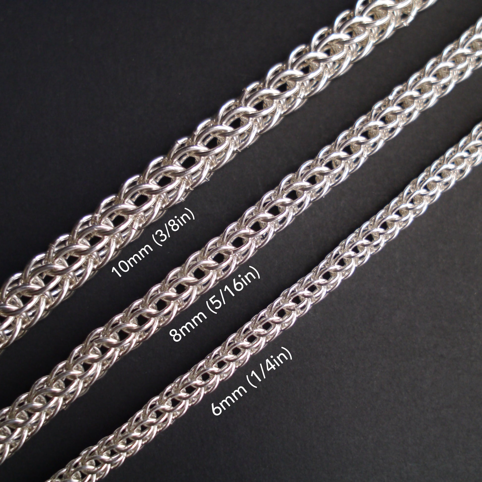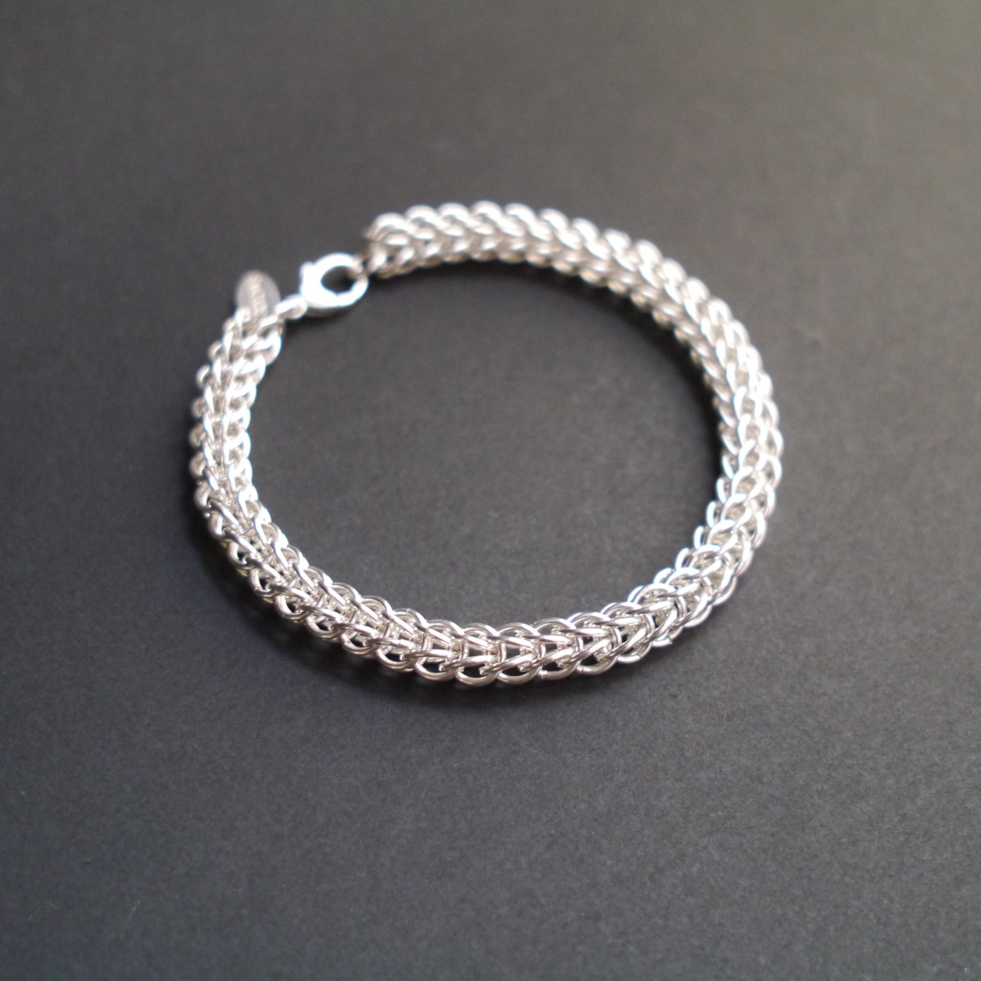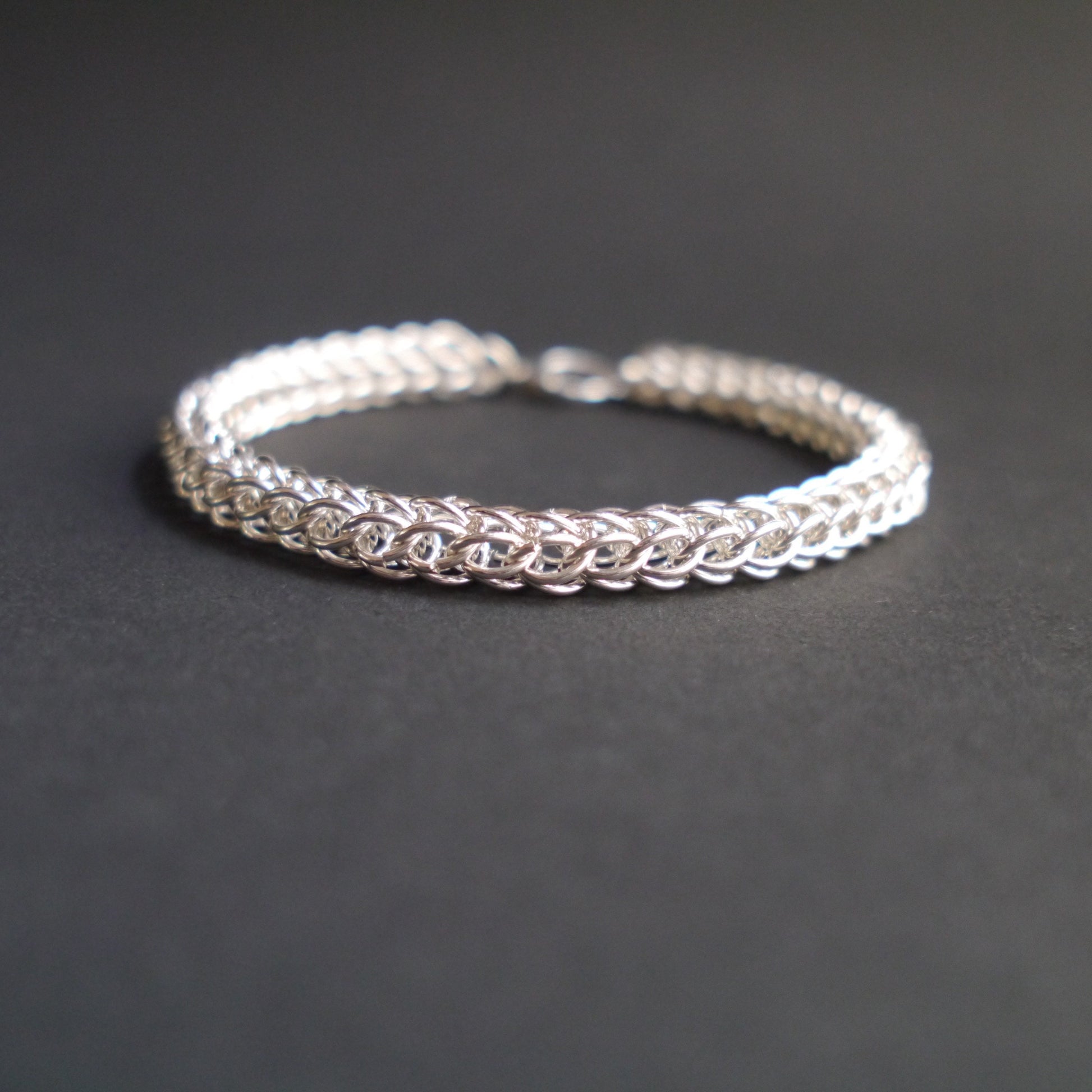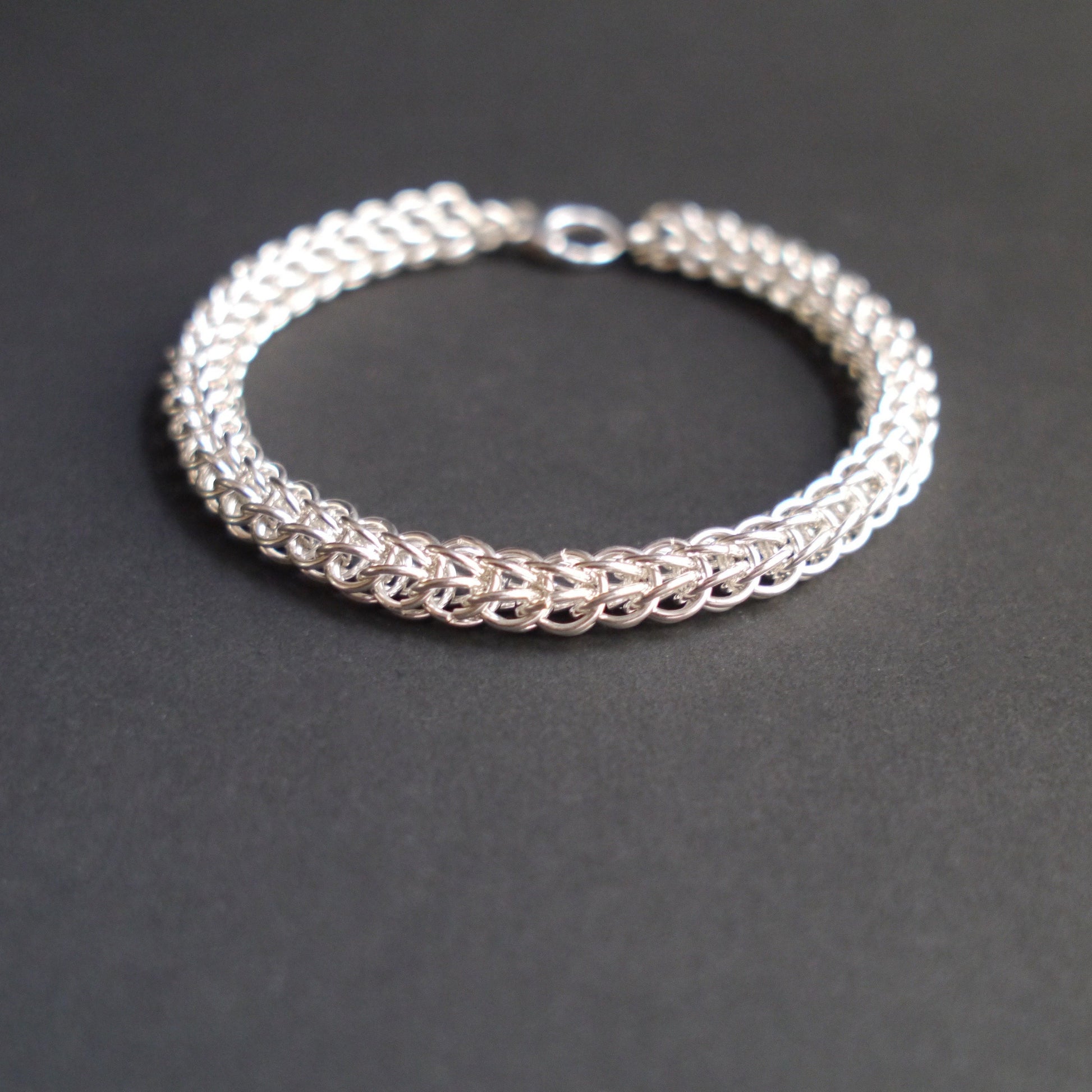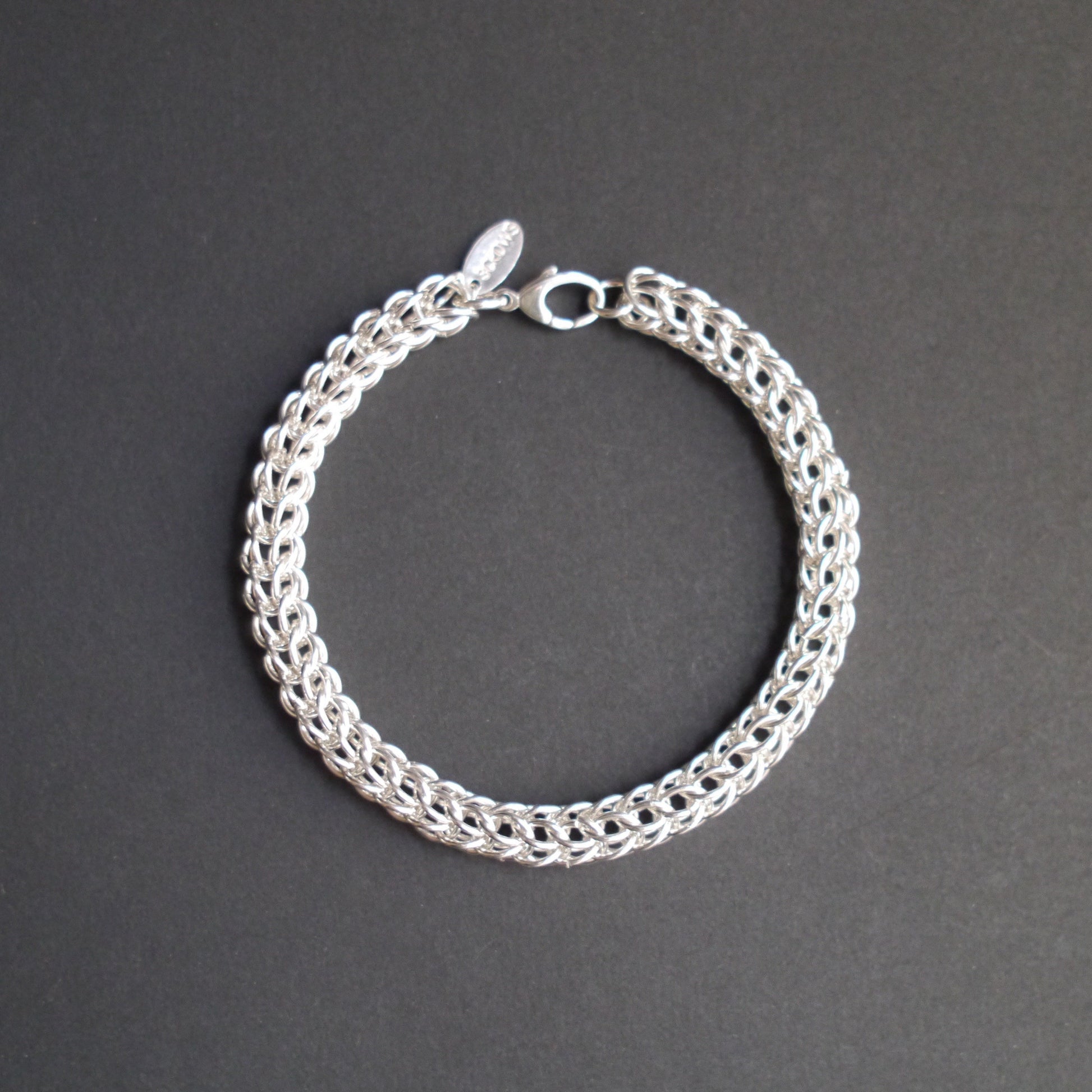 These intricate chainmaille bracelets are handcrafted in our studio from recycled sterling silver wire. The meticulous weaving of hundreds of tiny rings makes these bracelets incredibly sturdy and exceptionally comfortable to wear. This Byzantine weave bracelet has a width of 8mm and is crafted from 18 gauge sterling silver wire. It can be customized with either a toggle clasp or a lobster clasp in the order options. If you are looking for a slightly larger or smaller diameter bracelet, check out our 6mm and 10mm full Persian chain maille listings!