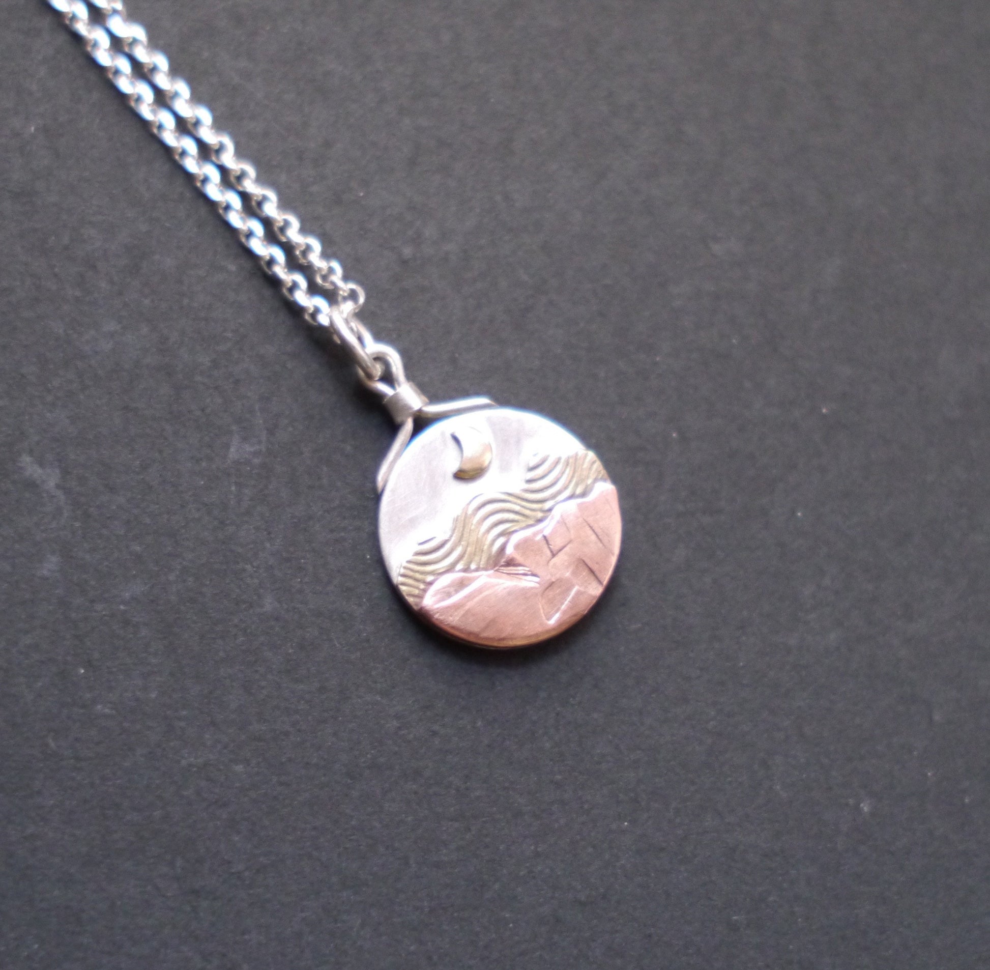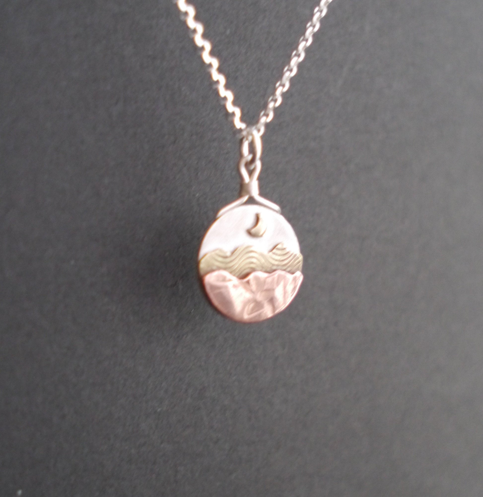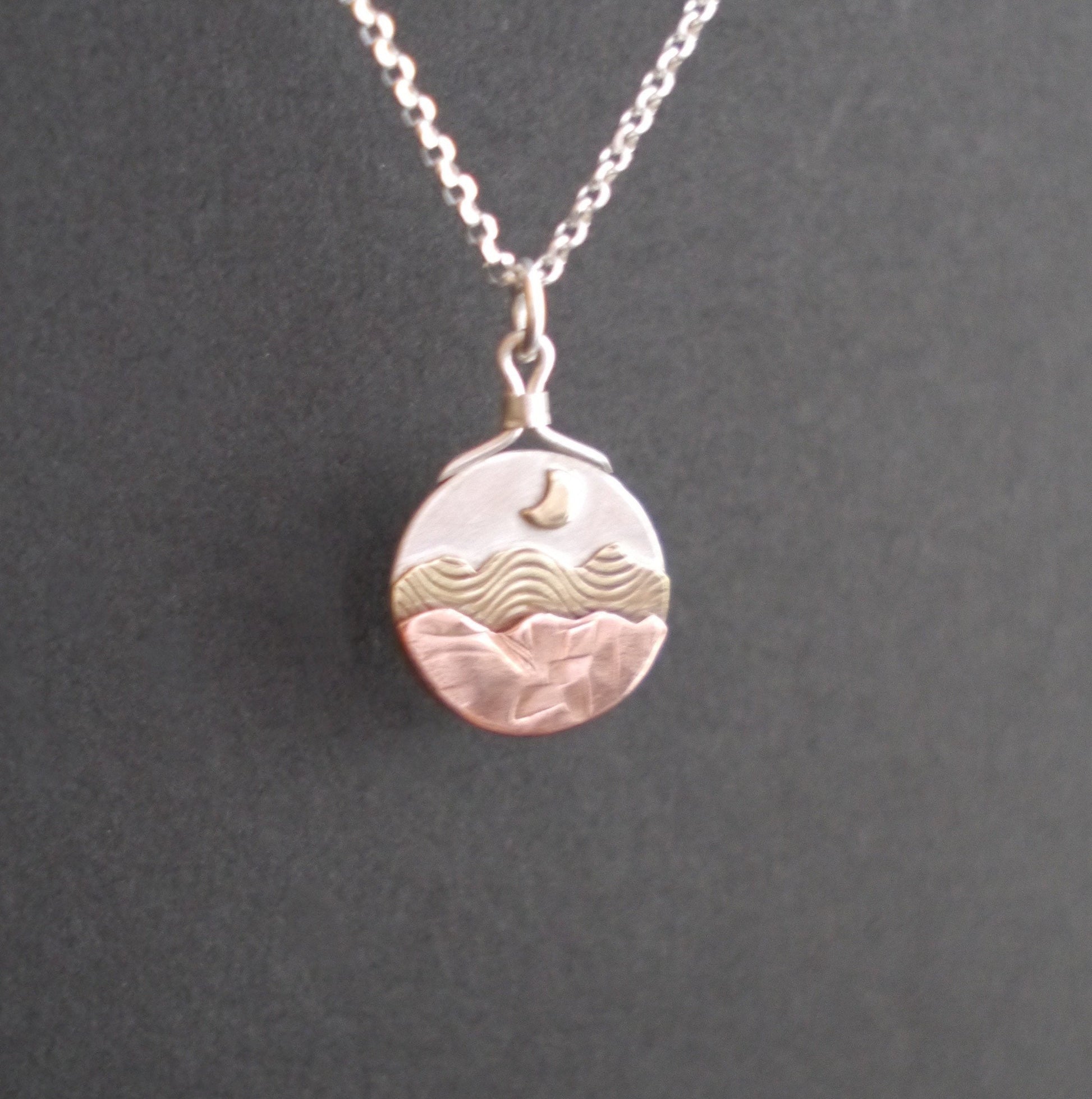 A miniature mountain landscape rests beneath the moonlit sky in these mixed-metal pendants, allowing you to carry the mountains with you wherever you go. Each handcrafted pendant features a unique mountain landscape created from layers of recycled copper and sterling silver, with a tiny golden sun or moon of brass hanging low in the sky. Each pendant is topped with a handmade bail and is embellished with a simple logo mark on the back.