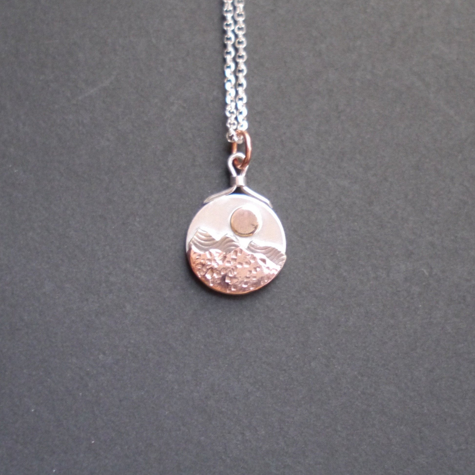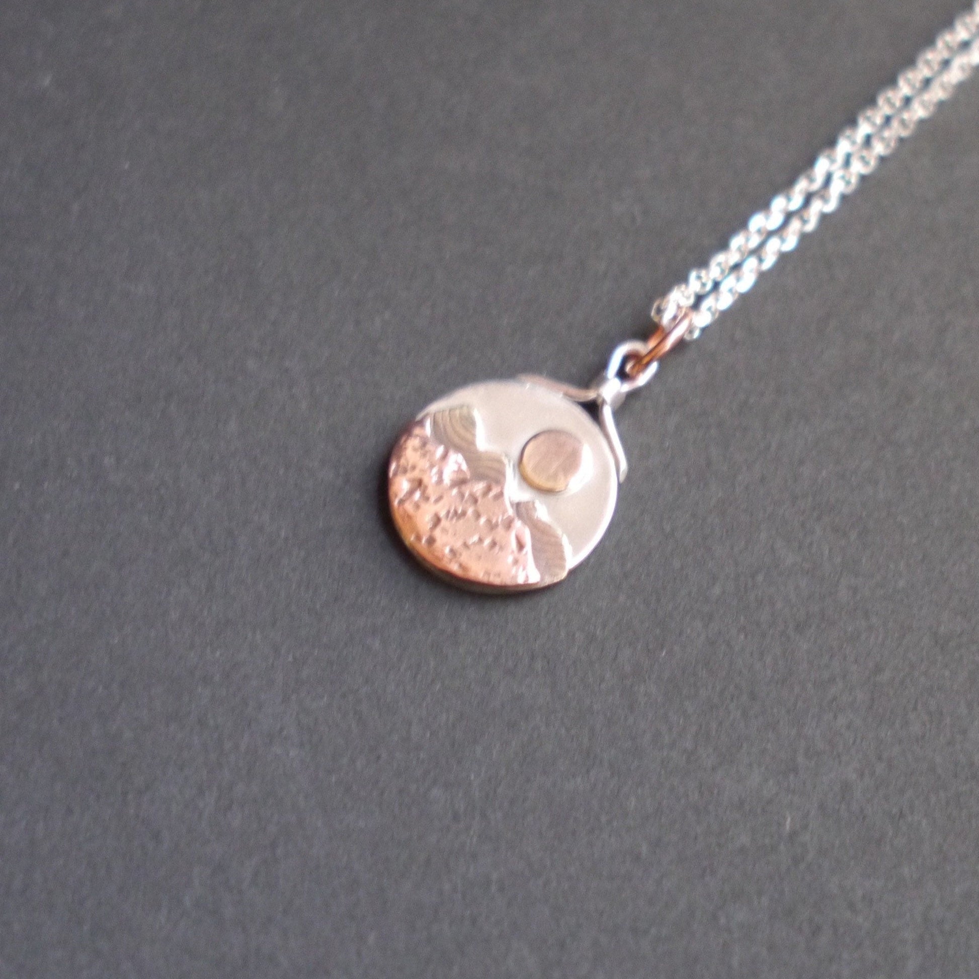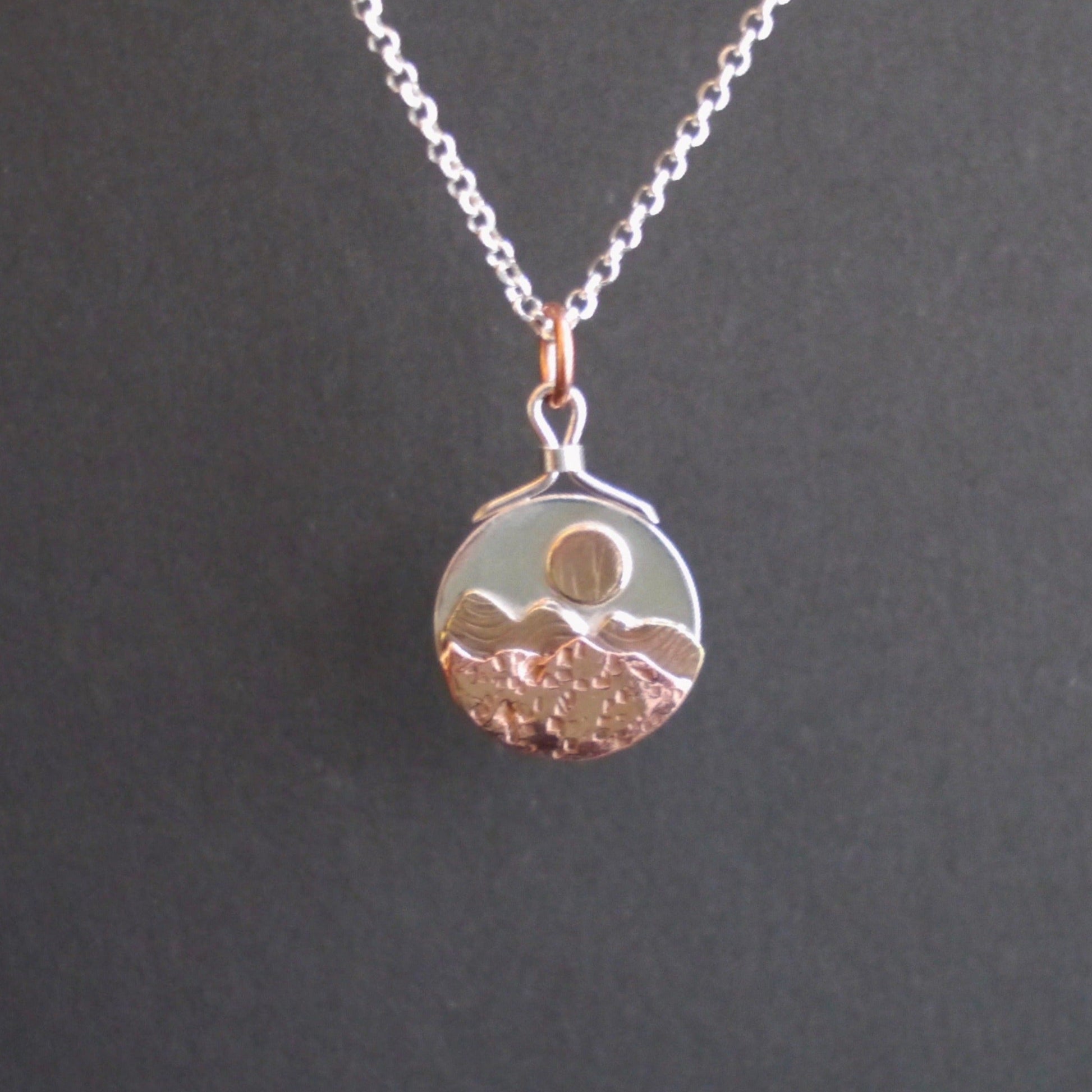 A miniature mountain landscape rests beneath the sunlit sky in these mixed-metal pendants, allowing you to carry the mountains with you wherever you go. Each handcrafted pendant features a unique mountain landscape created from layers of recycled copper and sterling silver, with a tiny golden sun or moon of brass hanging low in the sky. Each pendant is topped with a handmade bail and is embellished with a simple logo mark on the back.