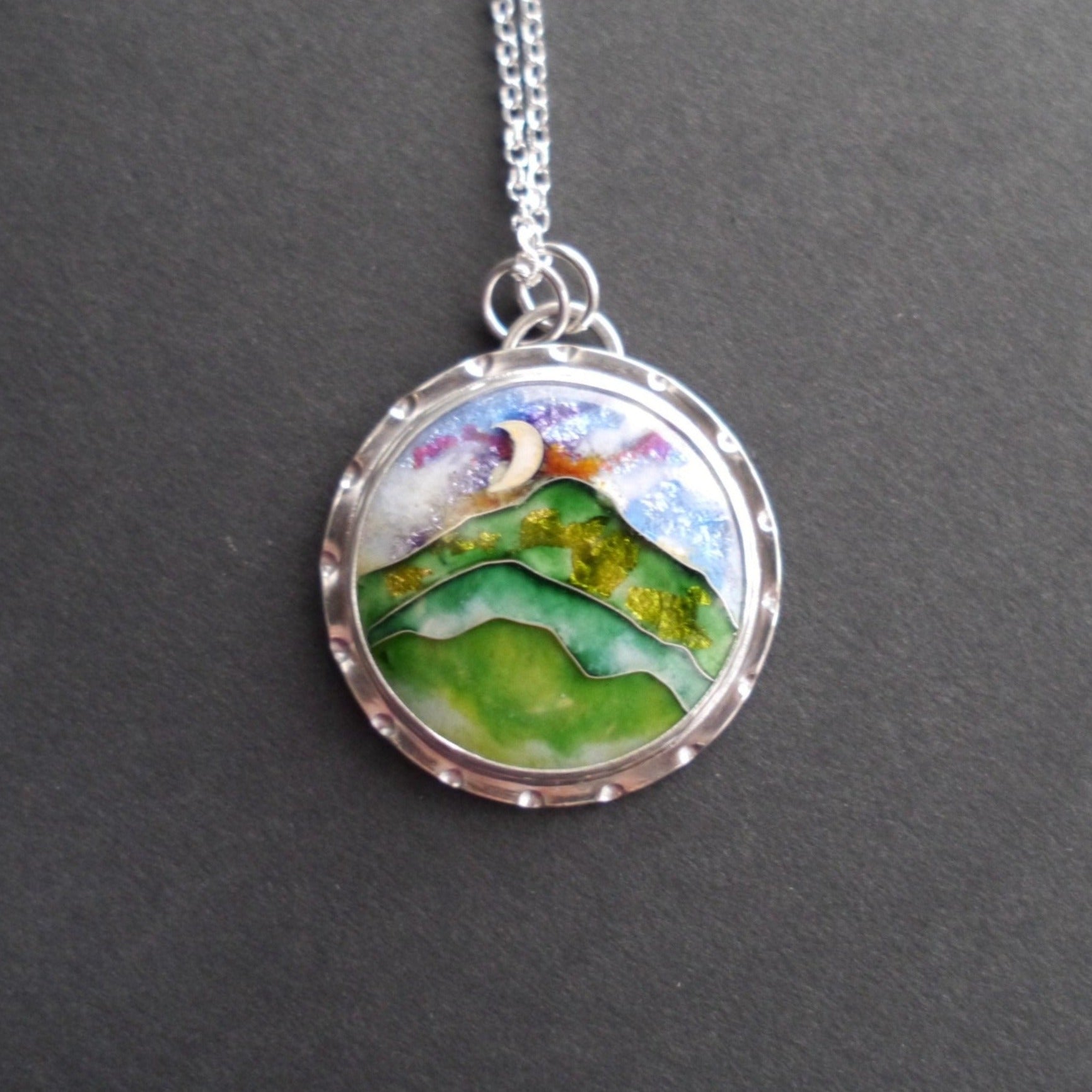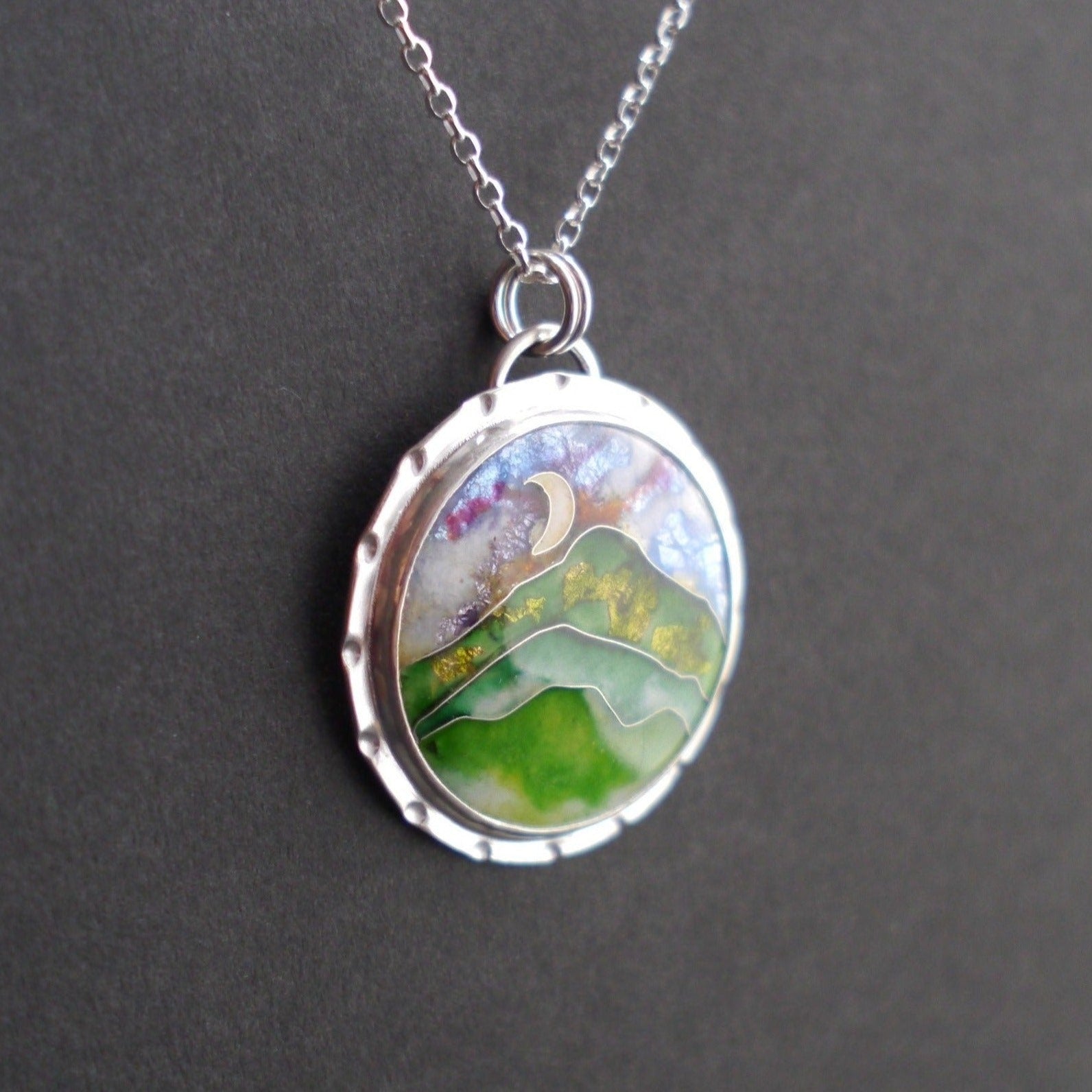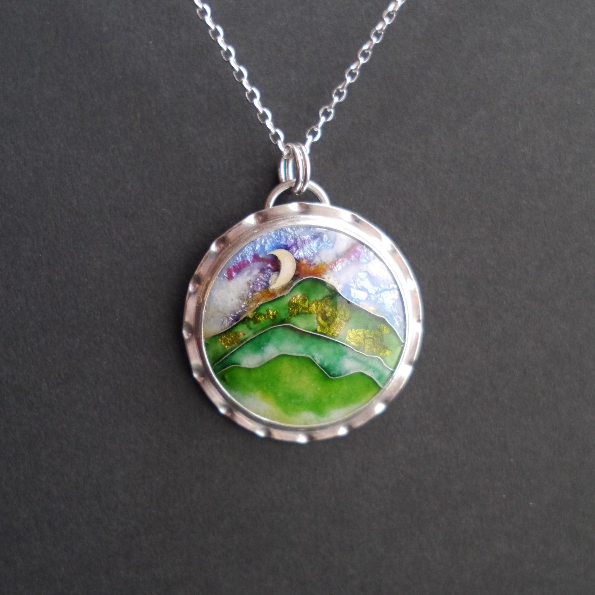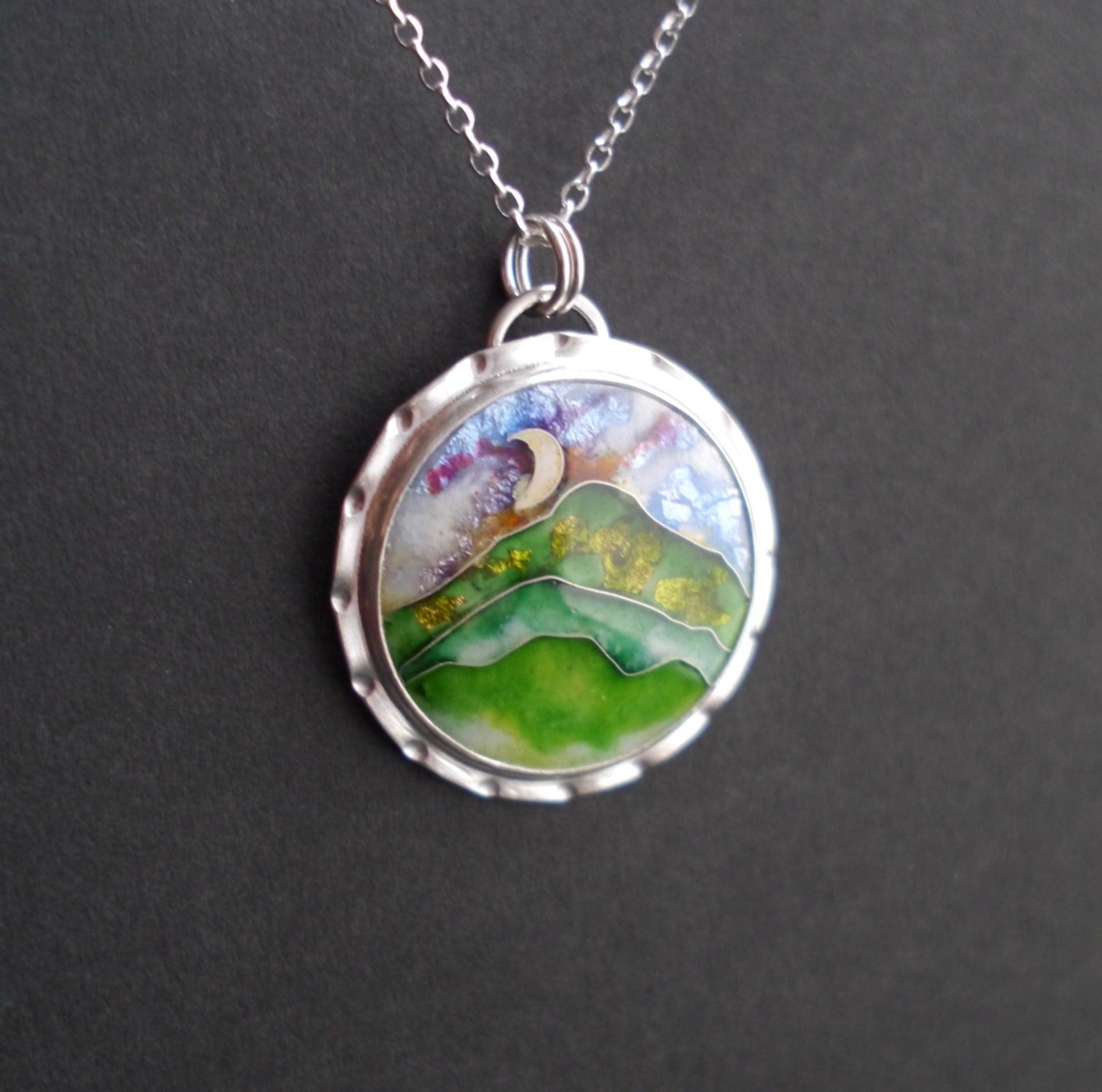 These vibrant cloisonné mountain landscapes are handcrafted from sterling silver and hand-painted with glass enamels. Cloisonné is an ancient metalworking technique using small fine silver wires and colorful glass enamels to create intricate designs. The small wires are bent into shapes to create small cells. The small cells are then carefully filled with grains of finely ground glass enamels and fired in a kiln. Subsequent coats of finely ground glass are applied and fired until a vibrant, original design is achieved.
