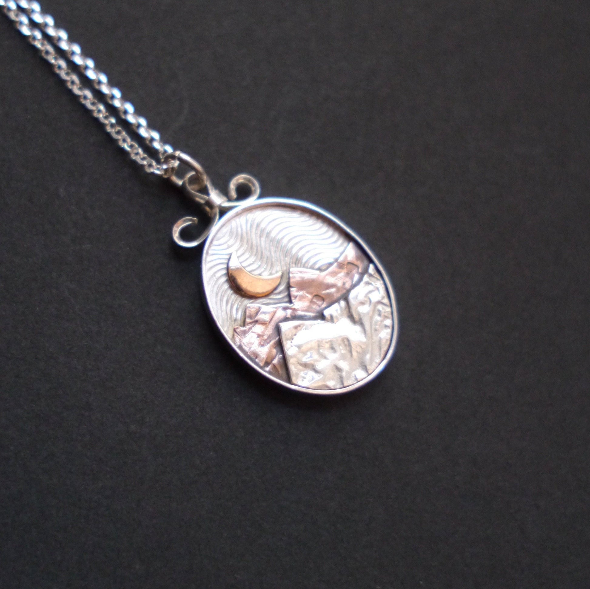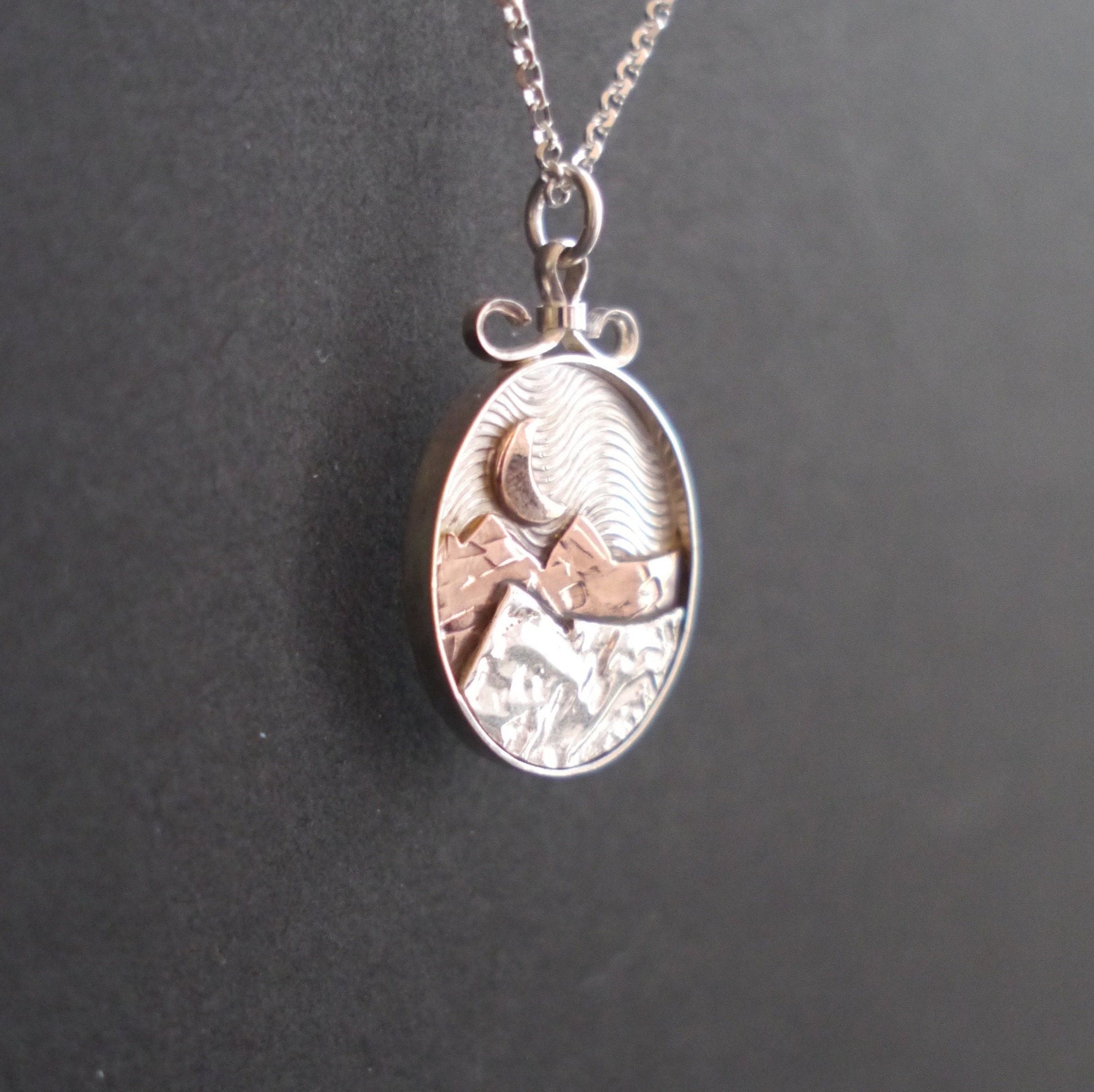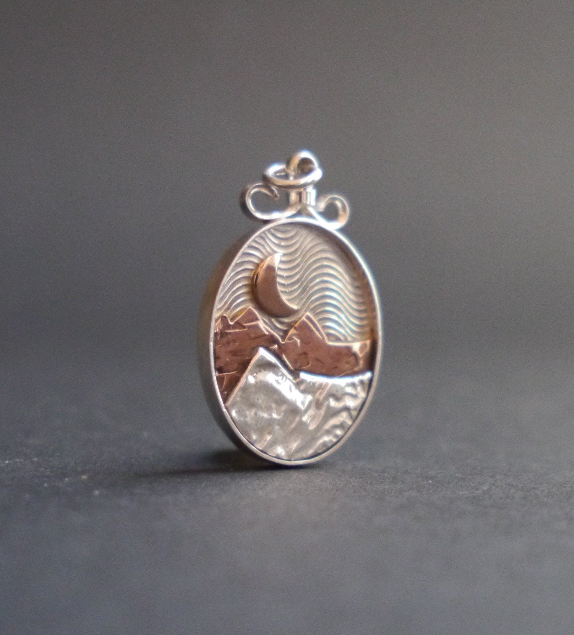 These glowing mixed-metal pendants allow you to carry the mountains with you wherever you go. Each handcrafted pendant features a unique mountain landscape created from layers of recycled copper and jeweler's brass, with a golden sun or moon hanging low in the sky. The deep sterling silver bezel creates a shadowbox effect and a light patina emphasizes the textures. Each pendant is topped with a handmade bail and is embellished with at Three Crows logo on the back.