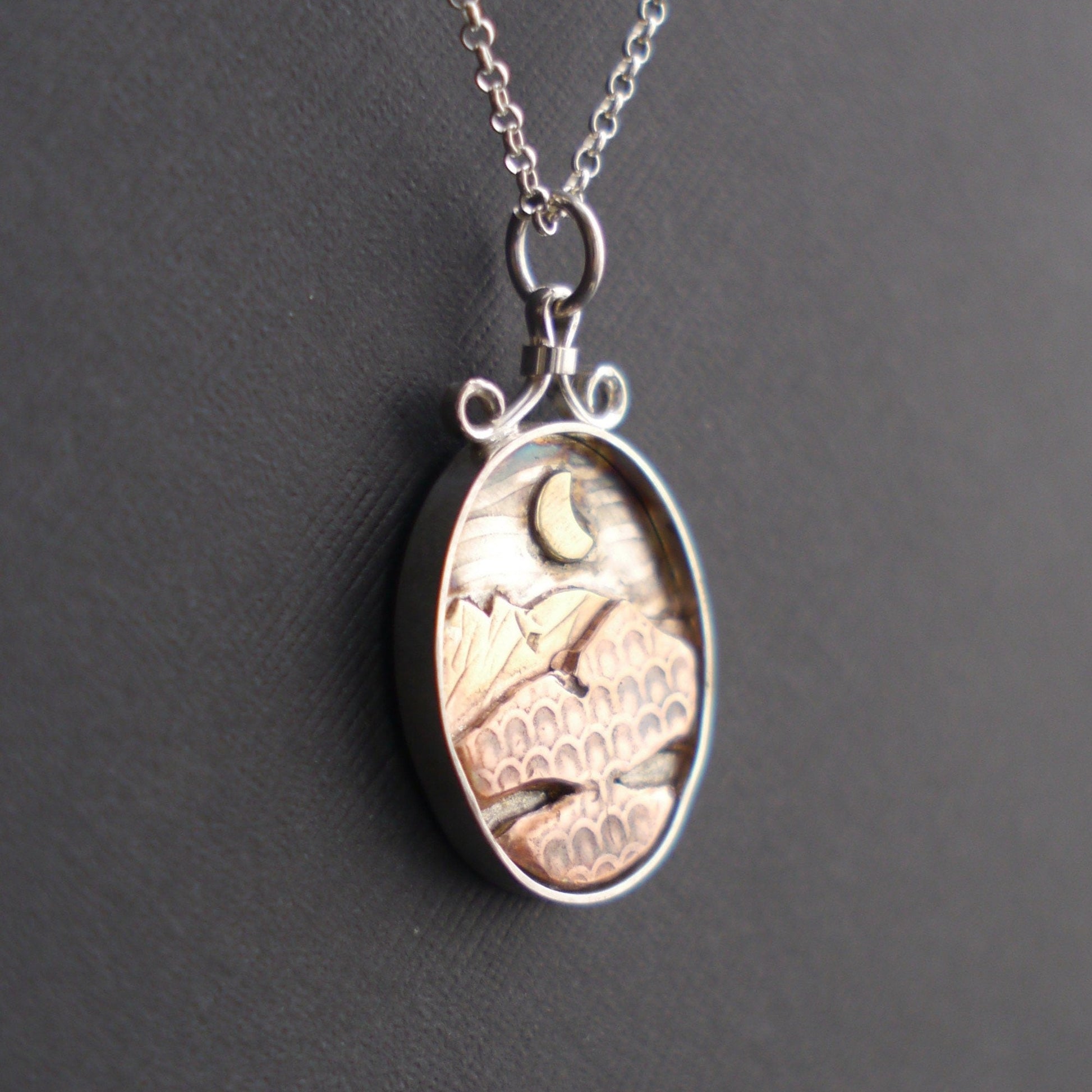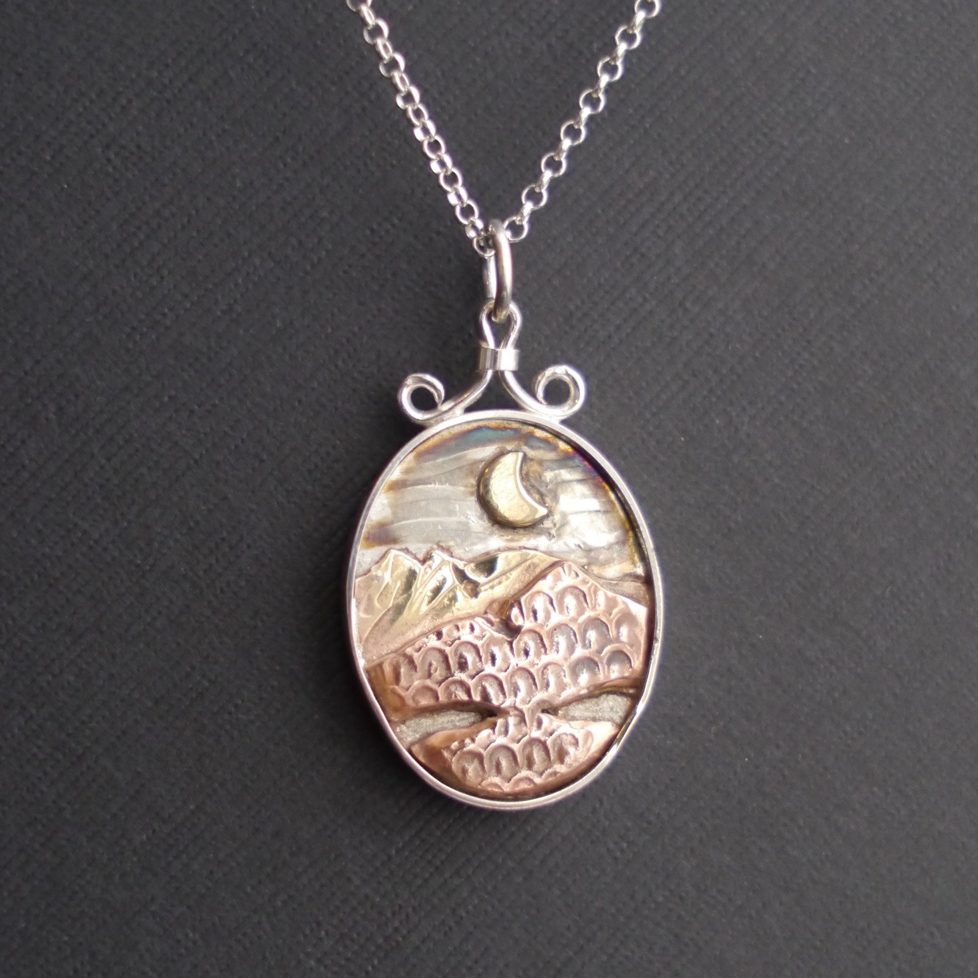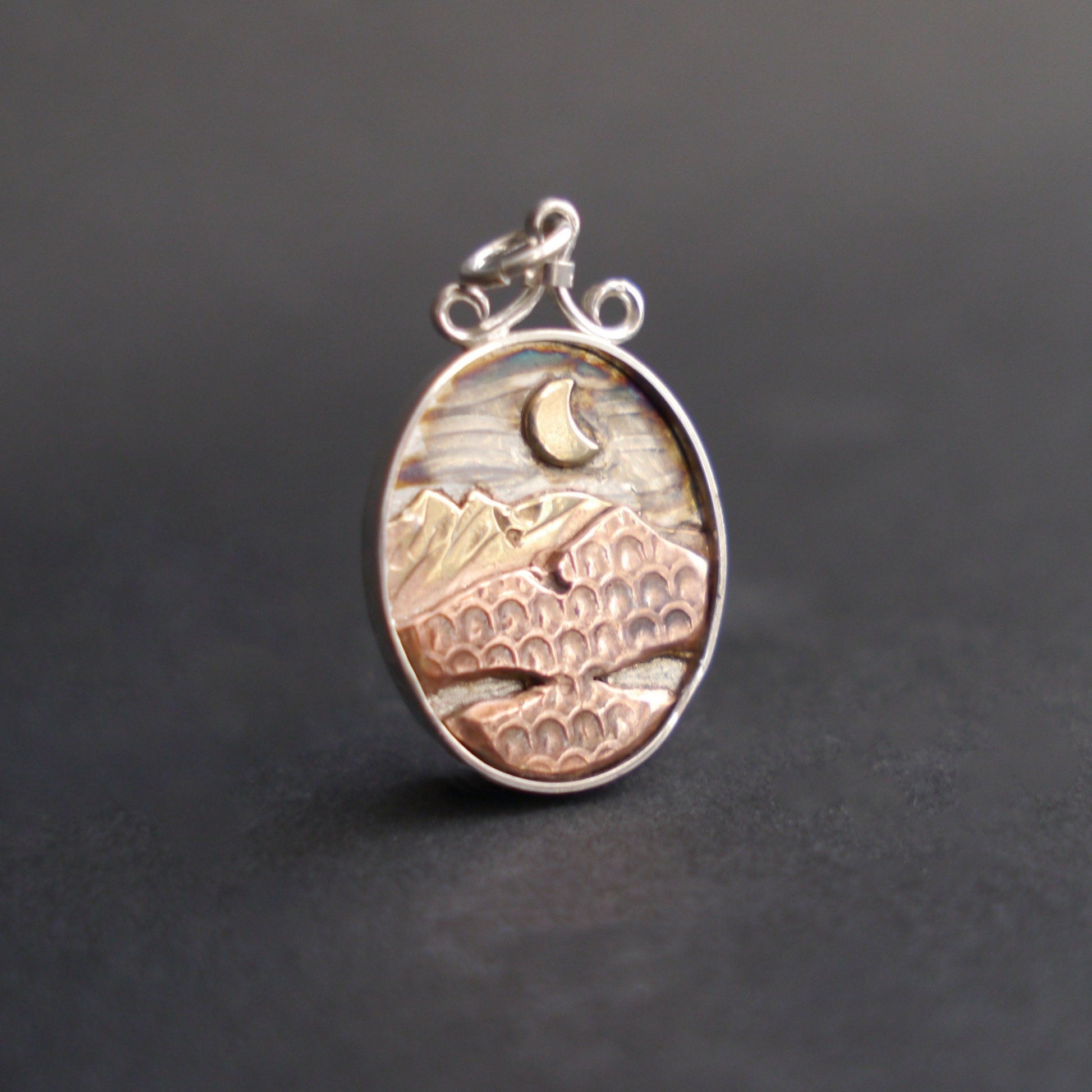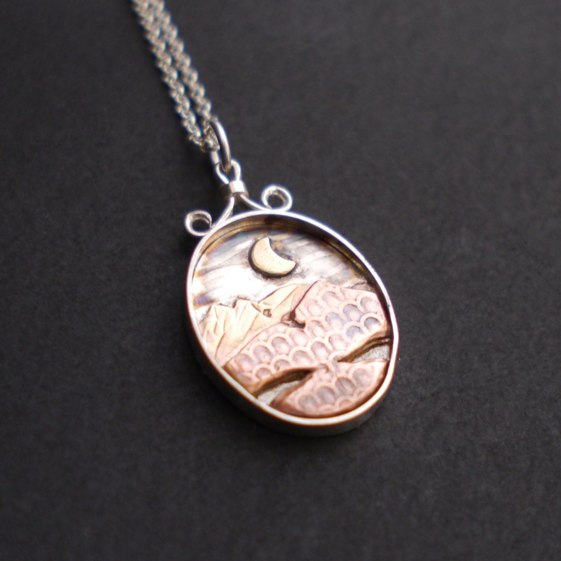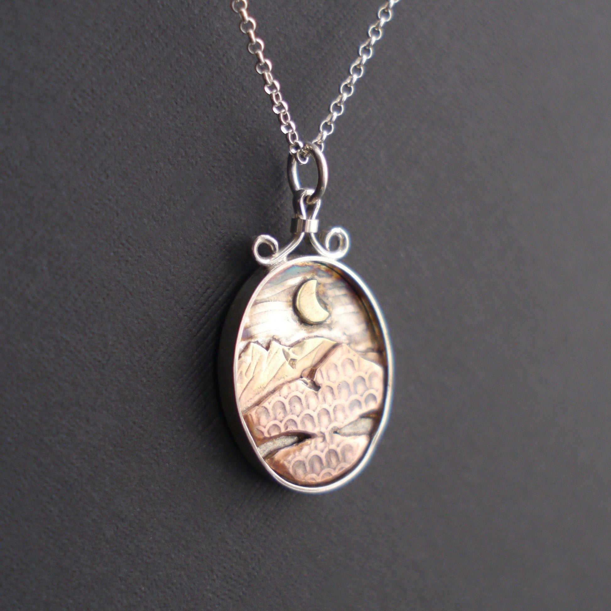 These glowing mixed-metal pendants allow you to carry the mountains with you wherever you go. Each handcrafted pendant features a unique mountain landscape created from layers of recycled copper and jeweler's brass, with a golden sun or moon hanging low in the sky. The deep sterling silver bezel creates a shadowbox effect, and a light patina emphasizes the textures. Each pendant is topped with a handmade bail and is embellished with a small logo on the back.
