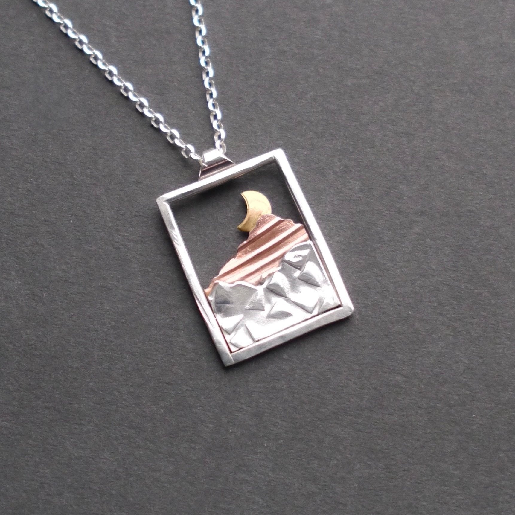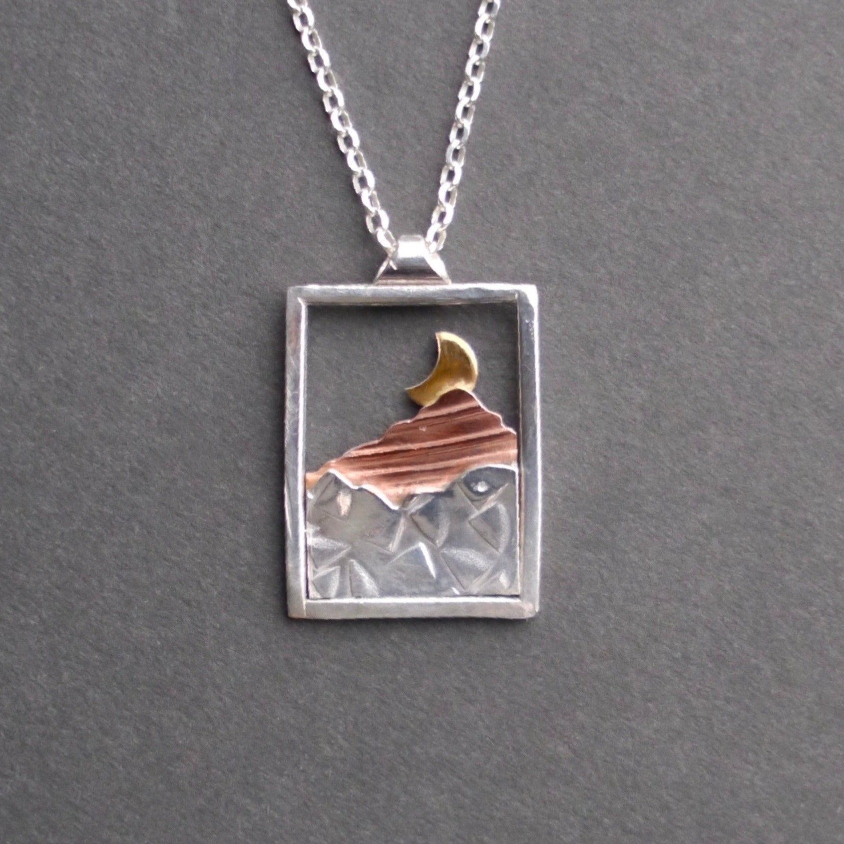 These glowing mixed-metal pendants allow you to carry the mountains with you wherever you go. Each handcrafted pendant features a unique mountain landscape forged from recycled copper and jeweler's brass layers, with a golden sun or moon hanging low in the sky. The deep sterling silver frame creates a window effect and a light patina emphasizes the textures. Each pendant is topped with a handmade bail and embellished with the Three Crows logo.