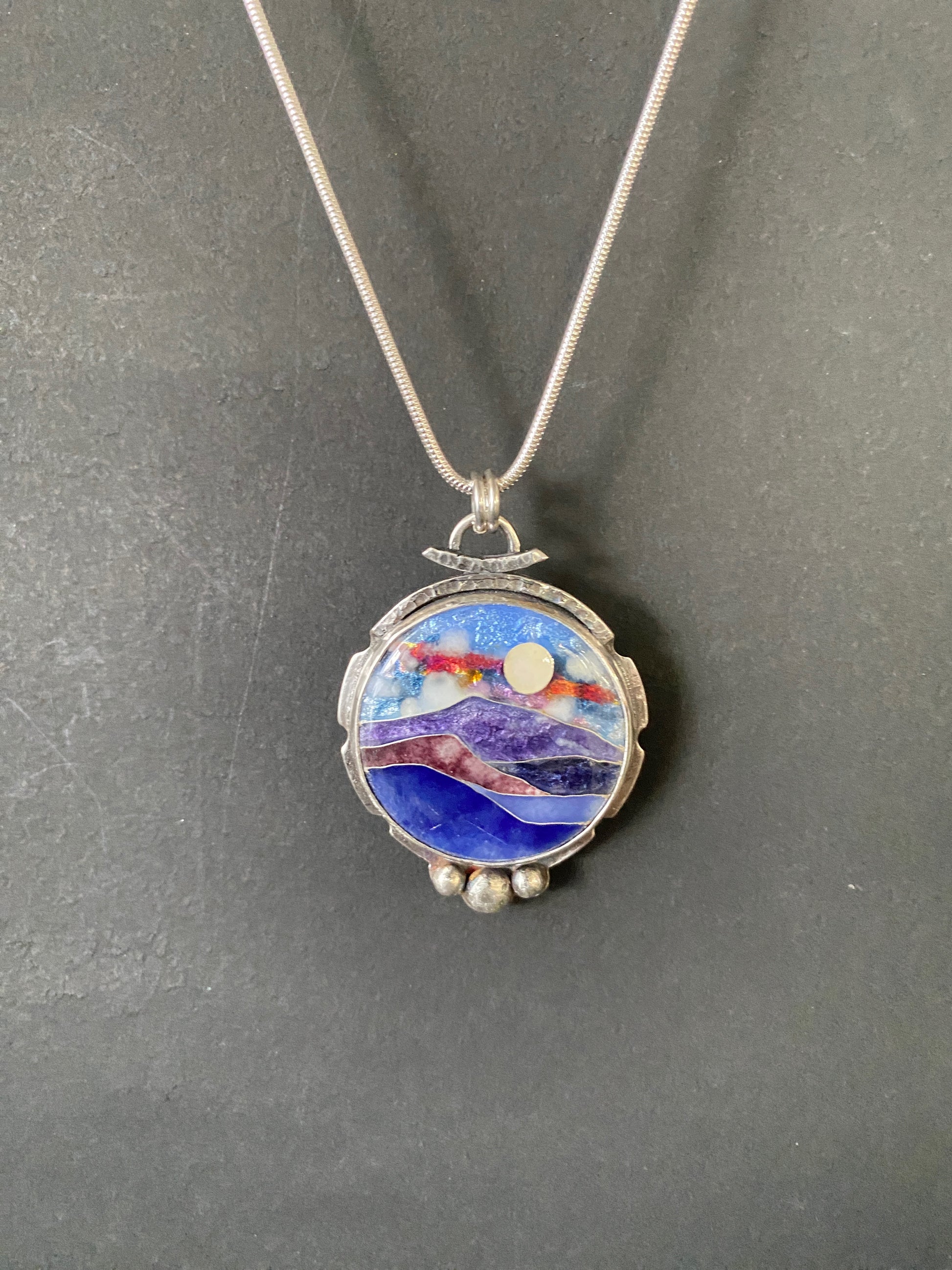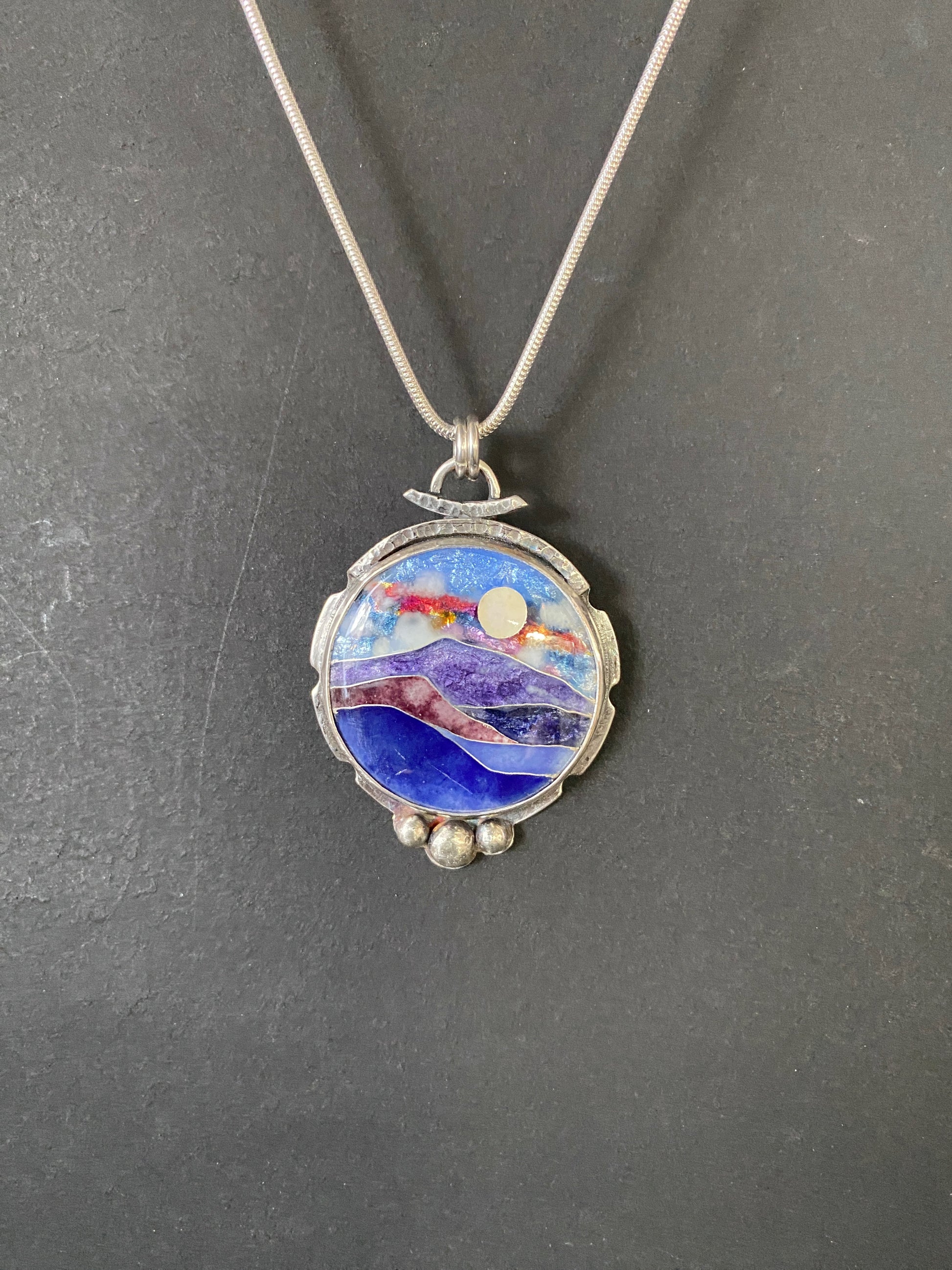 These cloisonné mountain pendants capture the glowing skies and rolling ridgelines of the Blue Ridge Mountains in luminous color. Each piece is handcrafted in sterling silver and hand-painted with layers of glass enamel, making every pendant a one-of-a-kind wearable landscape.