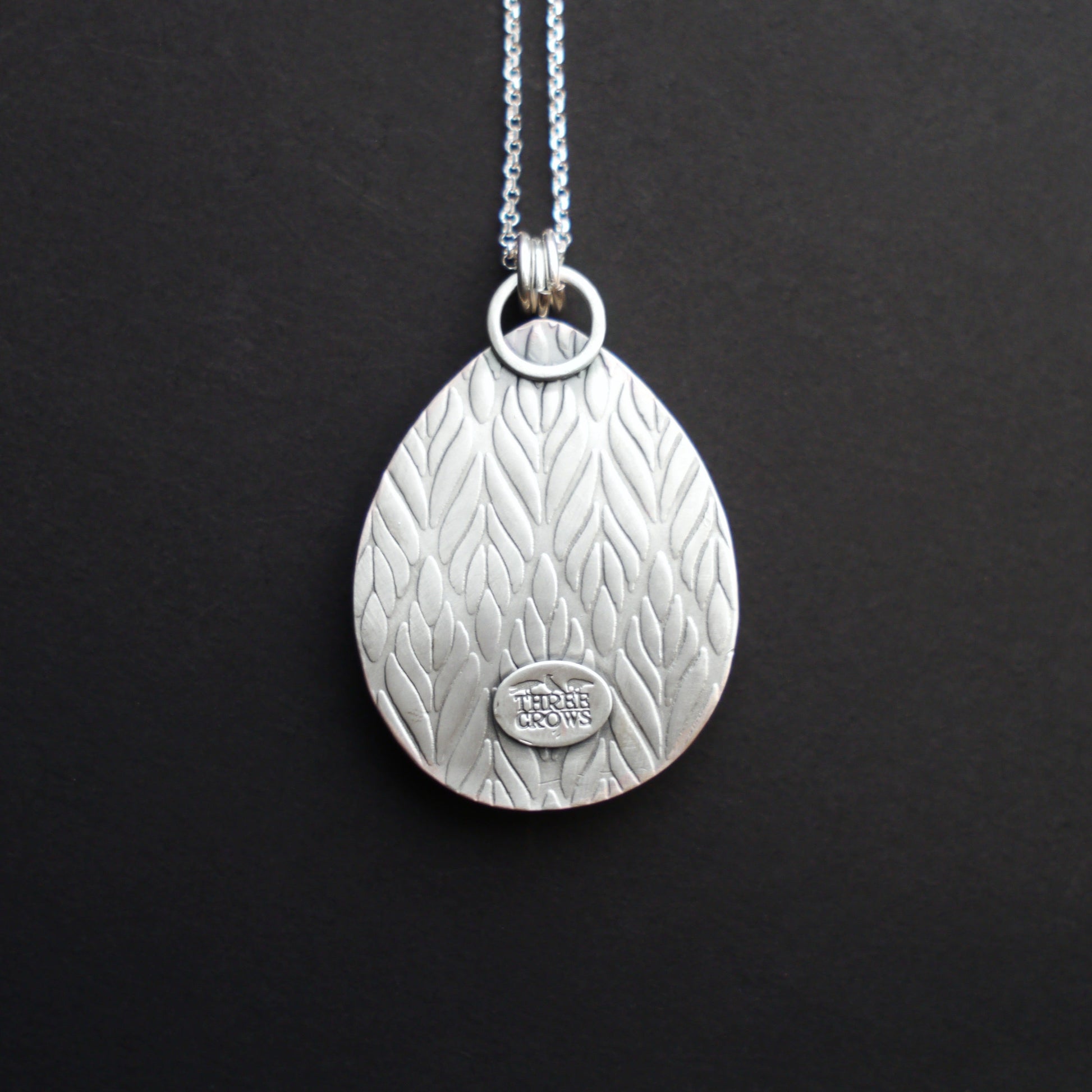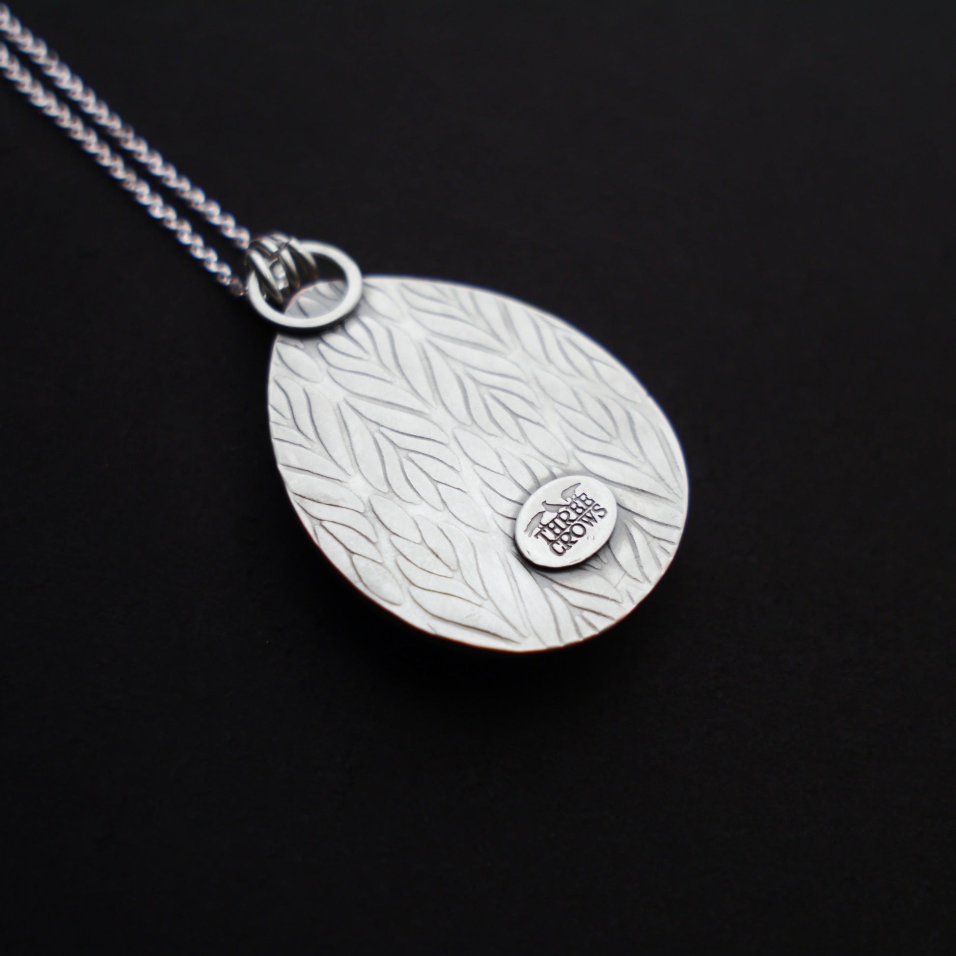 The pendant's night sky is complemented by the enchanting cool flash of labradorite, adding a touch of mystique to its beauty. Turn the pendant around to discover a delicately embellished leaf texture and a charming logo plate.