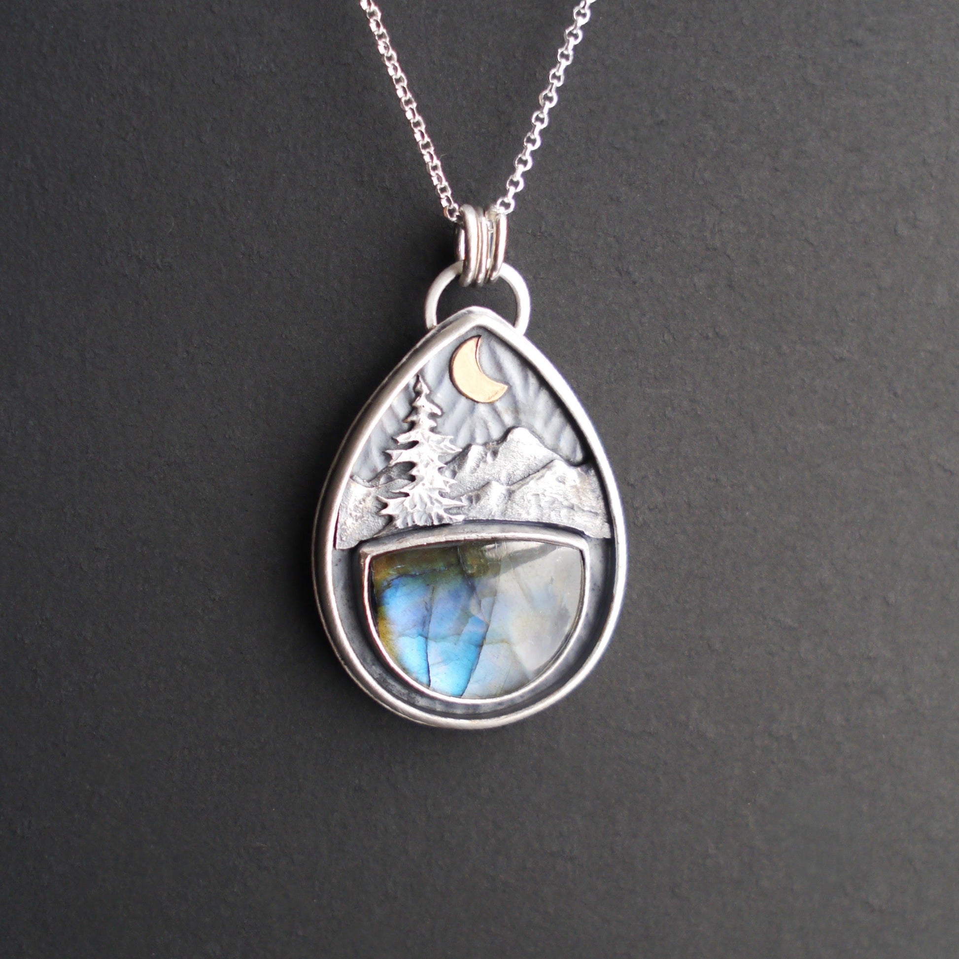 Indulge in the artistry of nature with this handcrafted statement pendant. Sterling silver mountain ranges and evergreen trees come to life beneath a gleaming gold crescent moon, forming a mesmerizing rolling landscape. Each mountain and tree is meticulously textured, capturing the essence of the great outdoors.