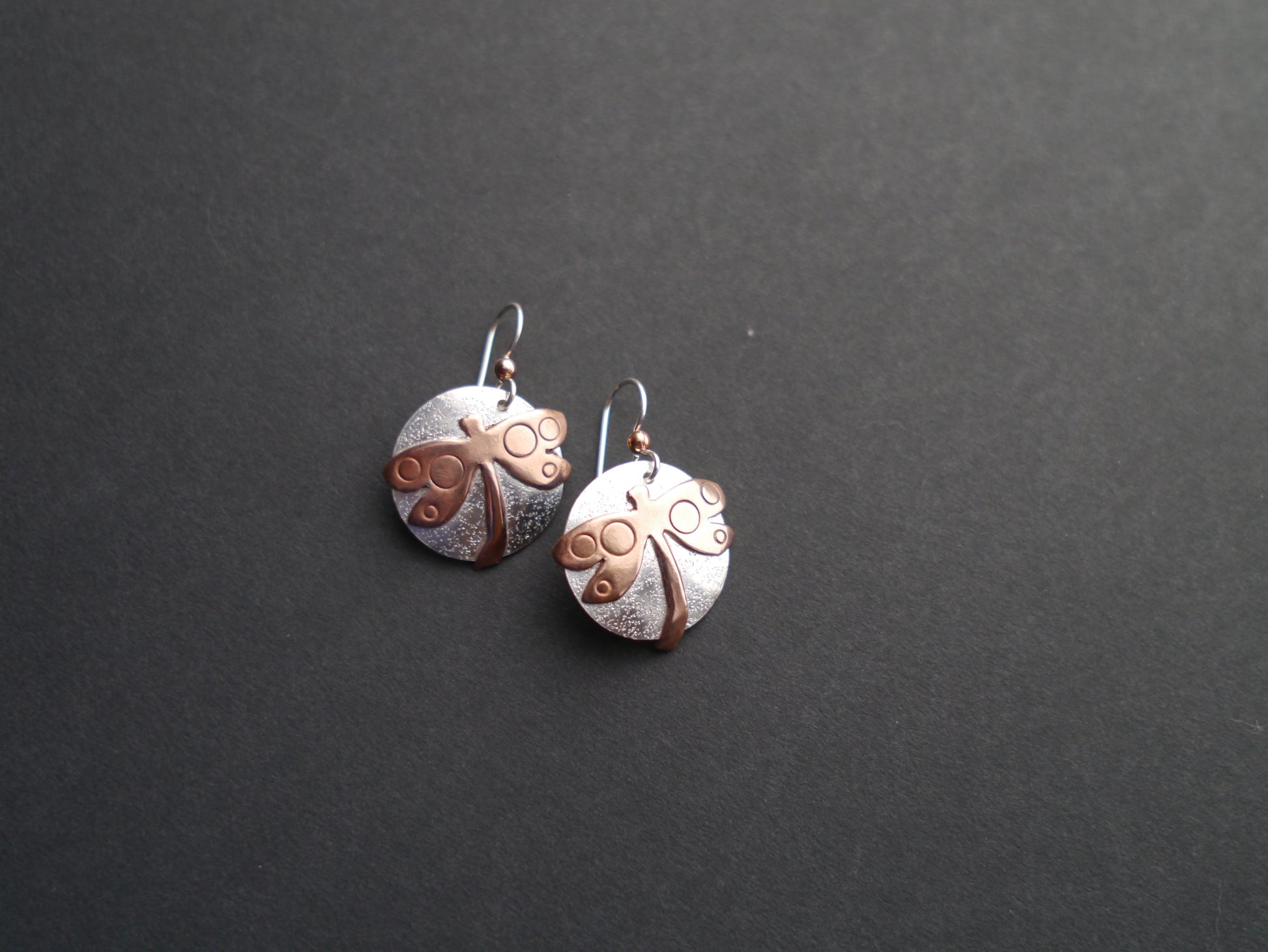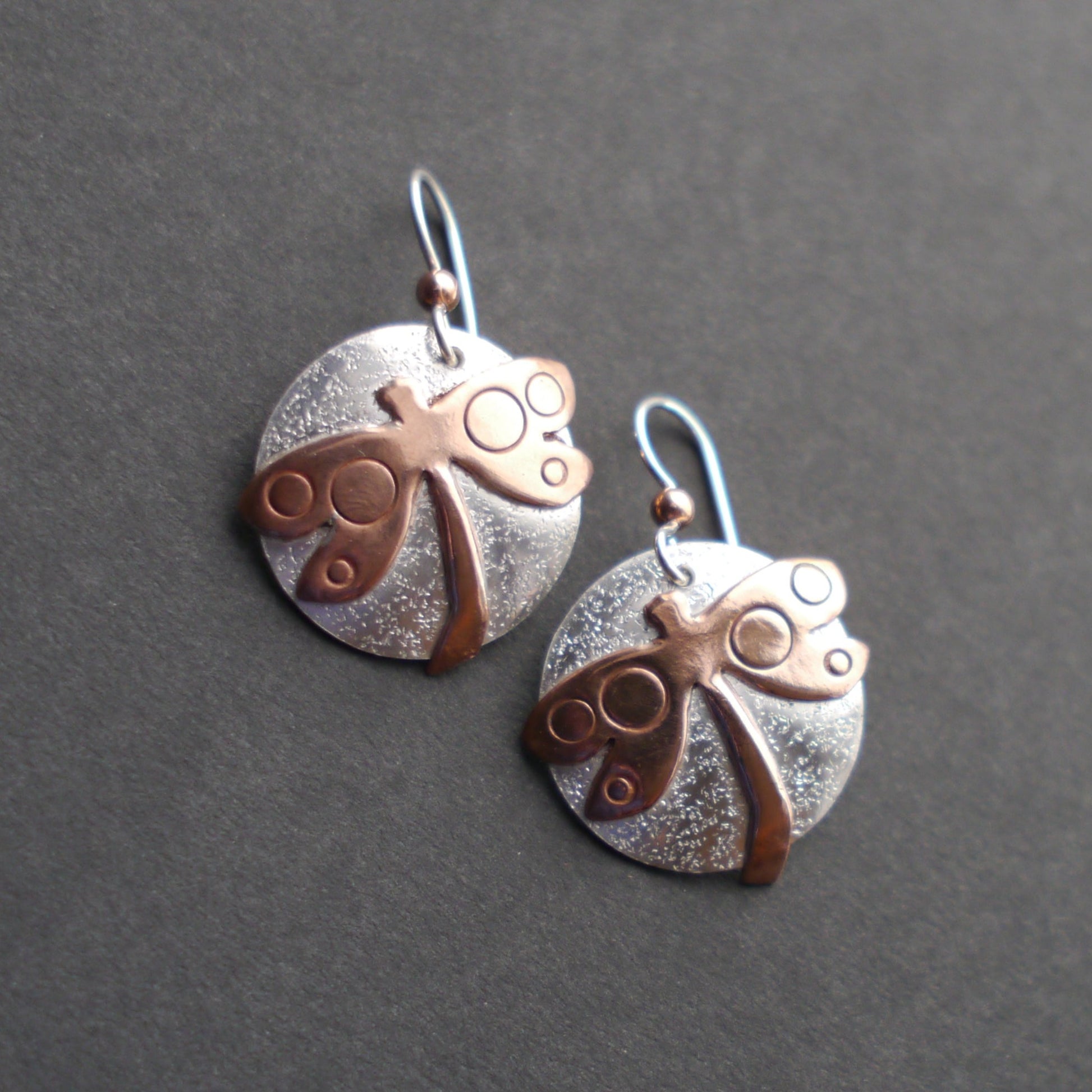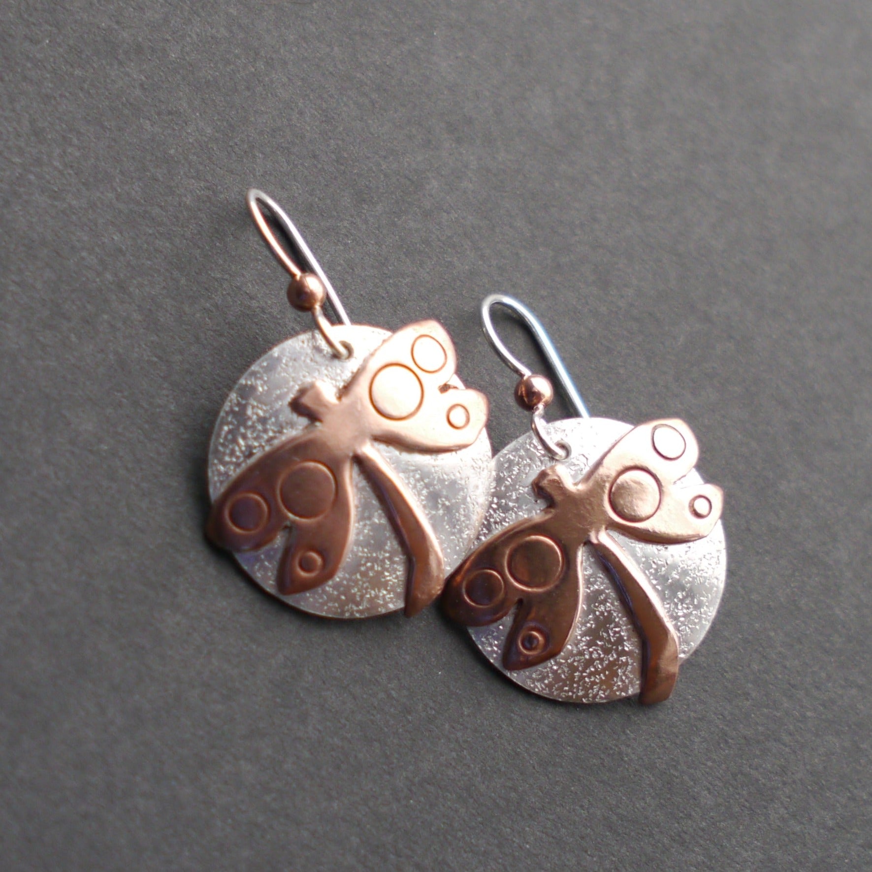 Take flight with our whimsical Dragonfly Dangle Earrings, a delightful ode to nature's wonders. Handcrafted with care, these playful dragonflies are lovingly sculpted from recycled copper, embodying our commitment to sustainable craftsmanship. Suspended from round textured sterling silver disks, these earrings exude a touch of elegance while embracing the earth. Let these charming dragonflies dance on your ears, adding a dash of fun and a sprinkle of magic to your steps. A perfect gift for the nature-loving soul seeking whimsy in her accessories.