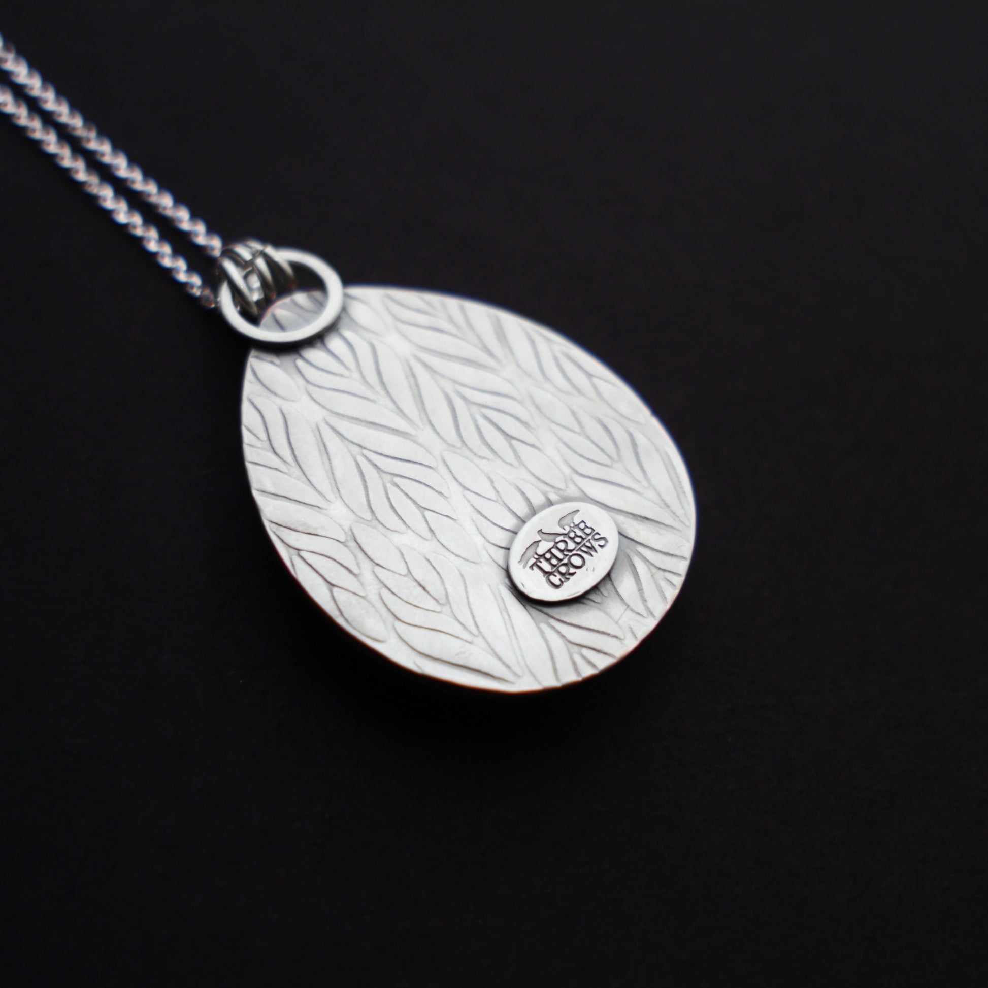 The pendant's night sky is complemented by the enchanting cool flash of labradorite, adding a touch of mystique to its beauty. Turn the pendant around to discover a delicately embellished leaf texture and a charming logo plate.