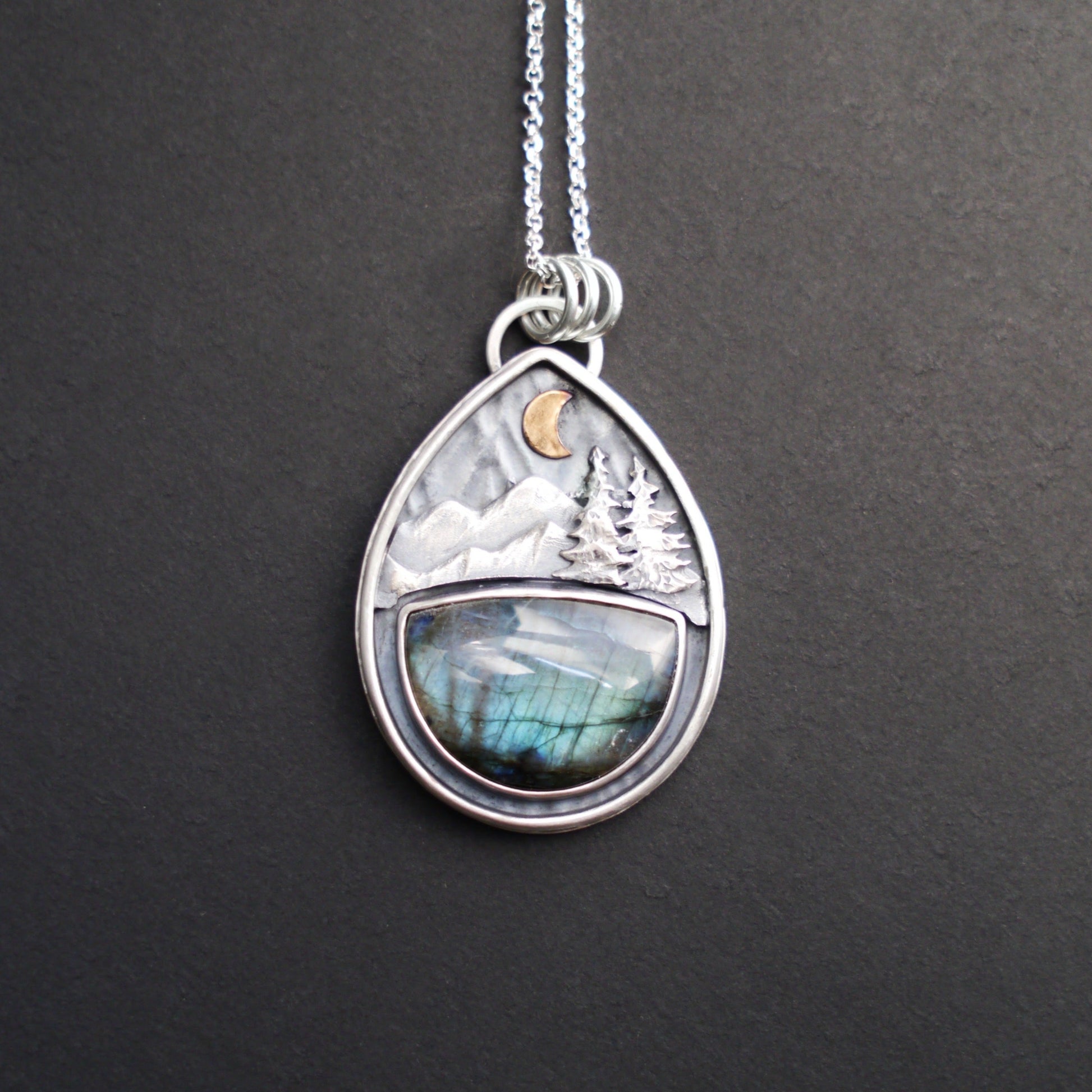 Indulge in the artistry of nature with this handcrafted statement pendant. Sterling silver mountain ranges and evergreen trees come to life beneath a gleaming gold crescent moon, forming a mesmerizing rolling landscape. Each mountain and tree is meticulously textured, capturing the essence of the great outdoors.