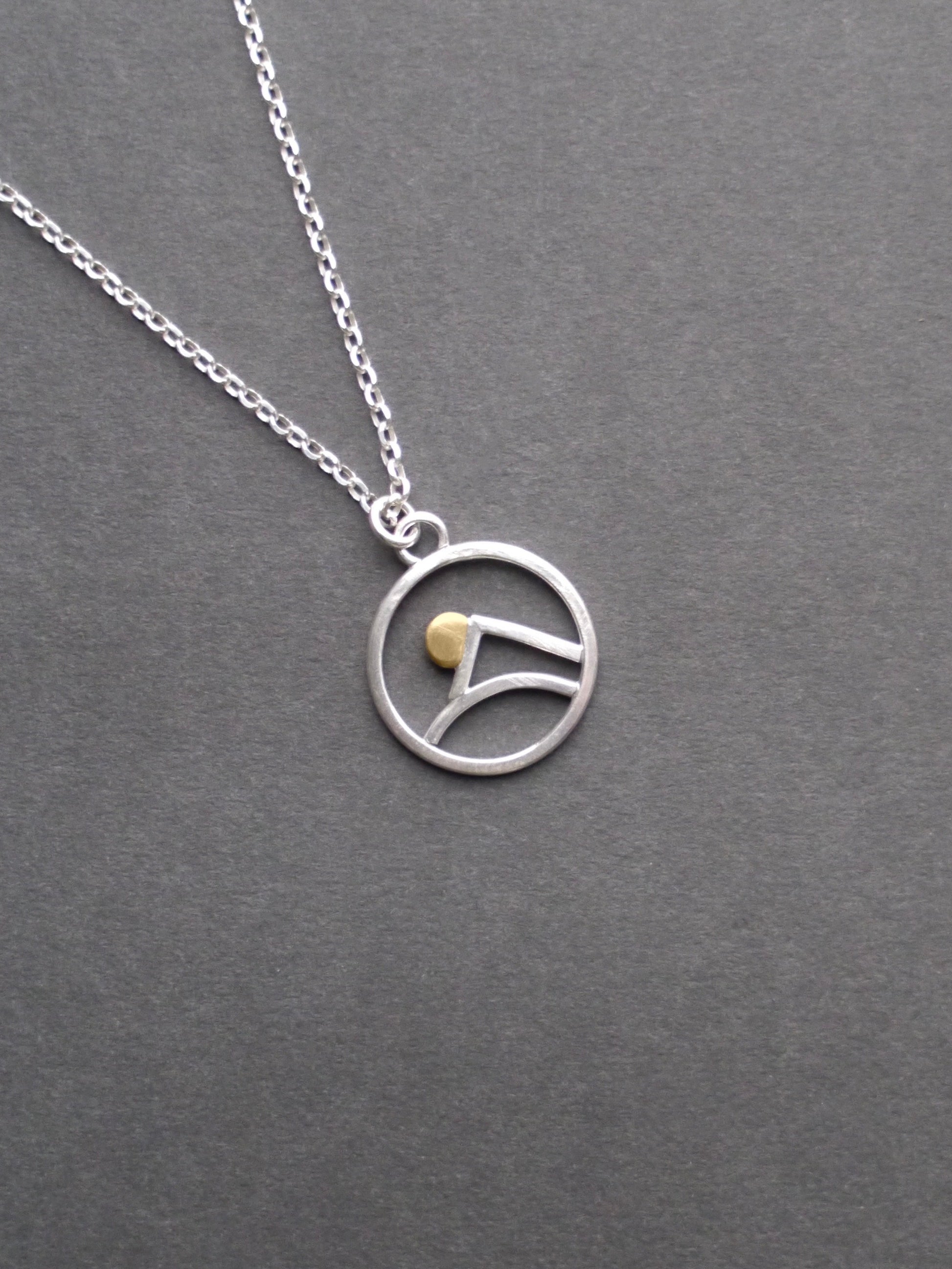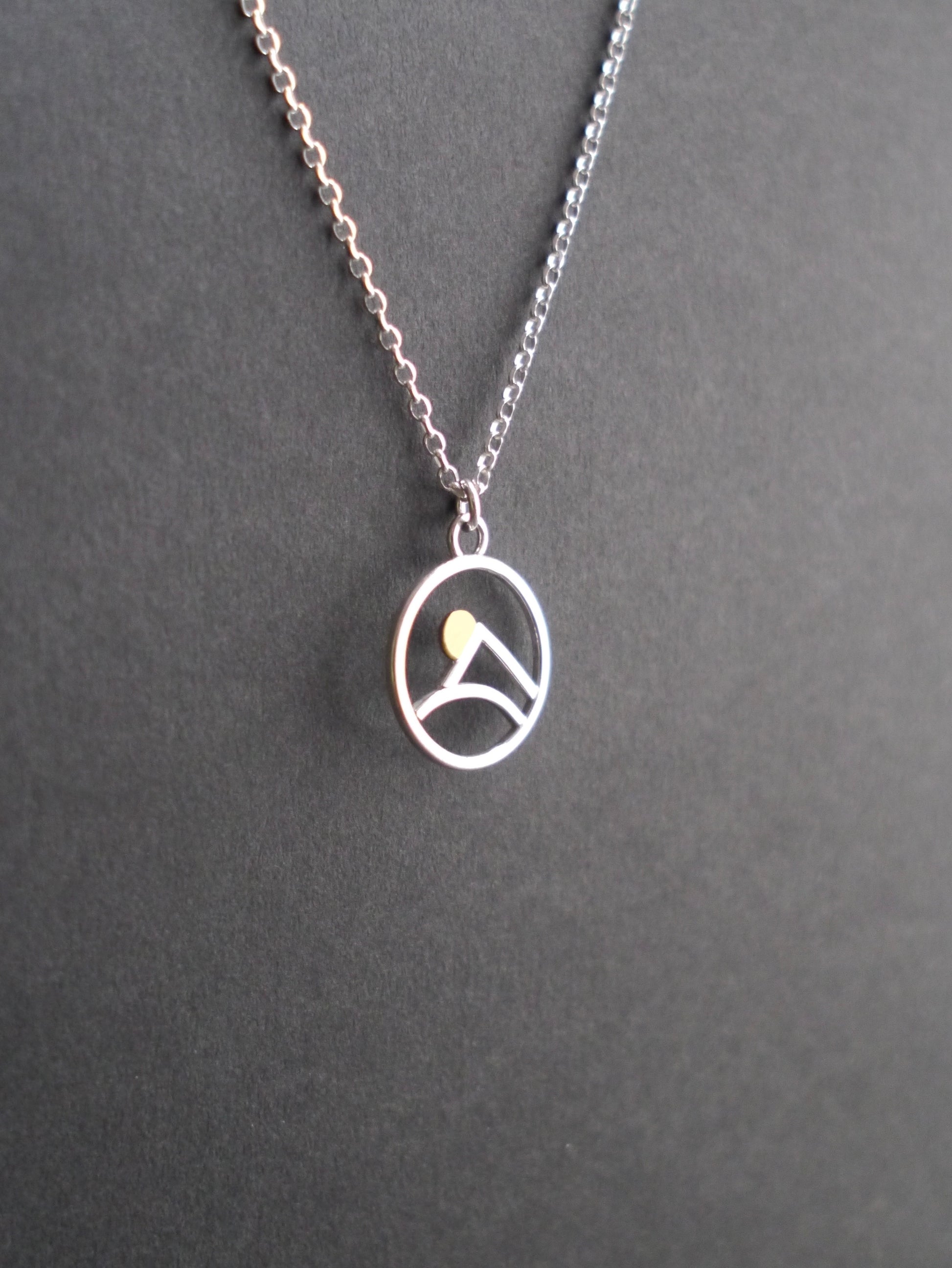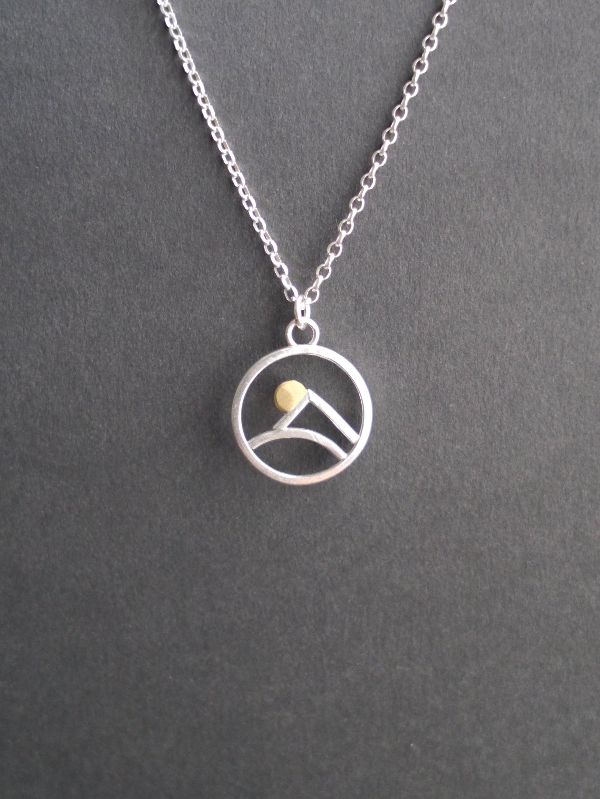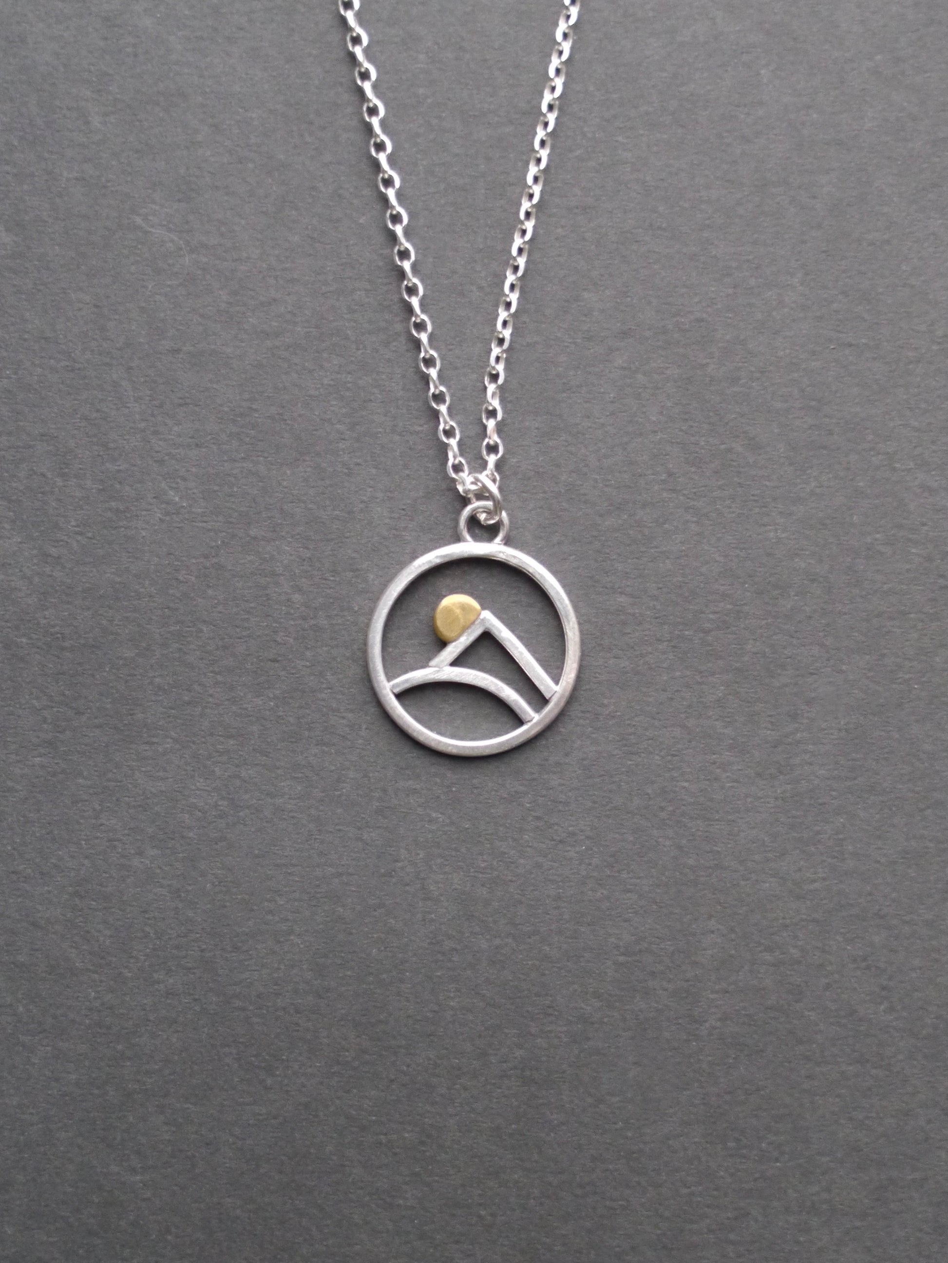 In these mixed-metal pendants, a minimalist mountain landscape rests beneath the sunlit or moonlit sky. Each handcrafted pendant features a unique mini mountain landscape created from sterling silver square wire, with a tiny brass sun or moon hanging low in the sky. Each pendant is topped with a handmade bail.