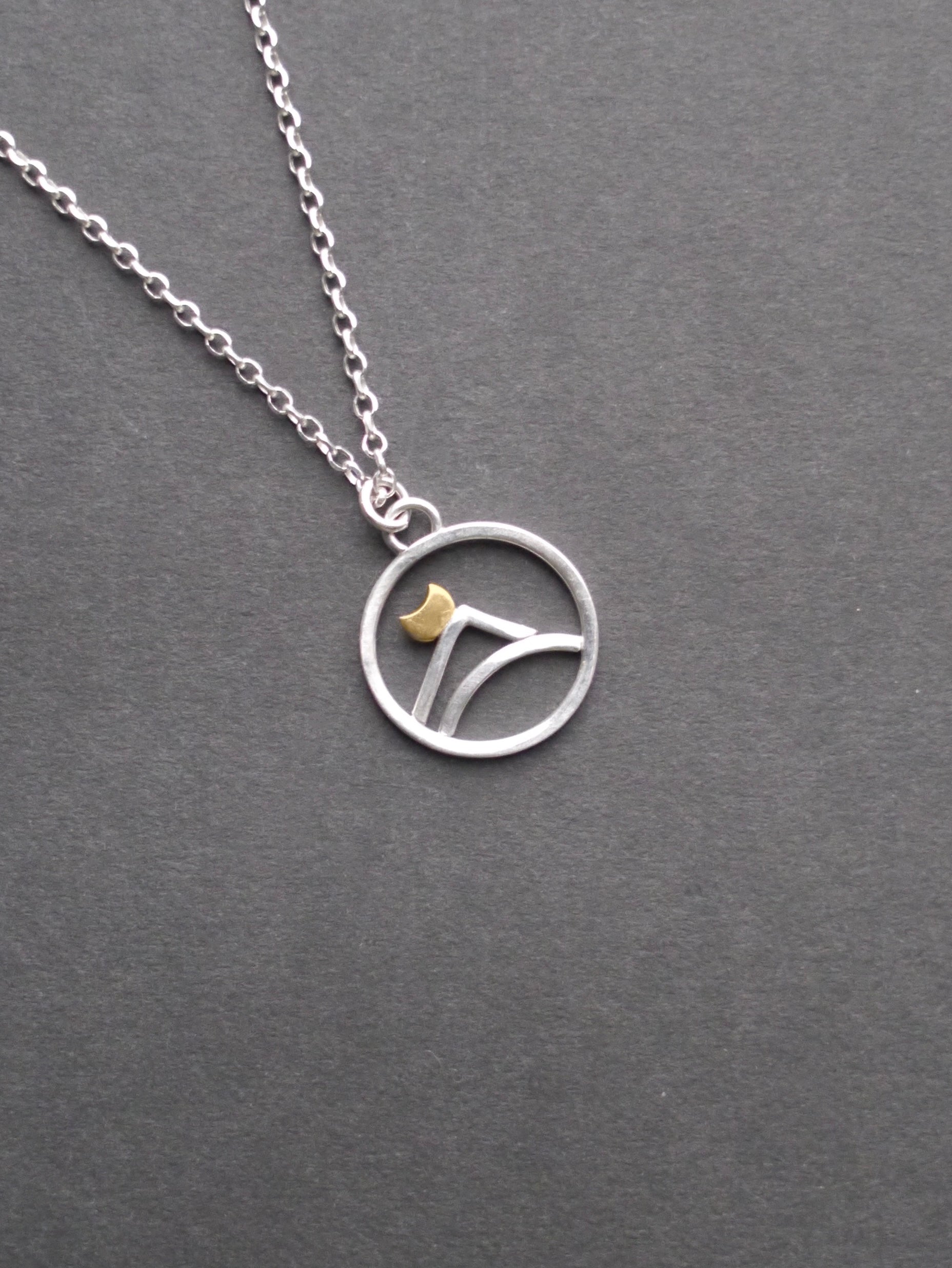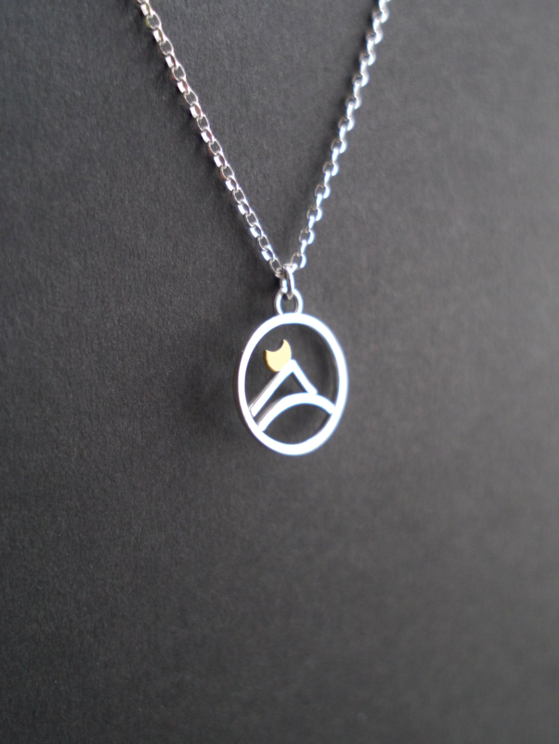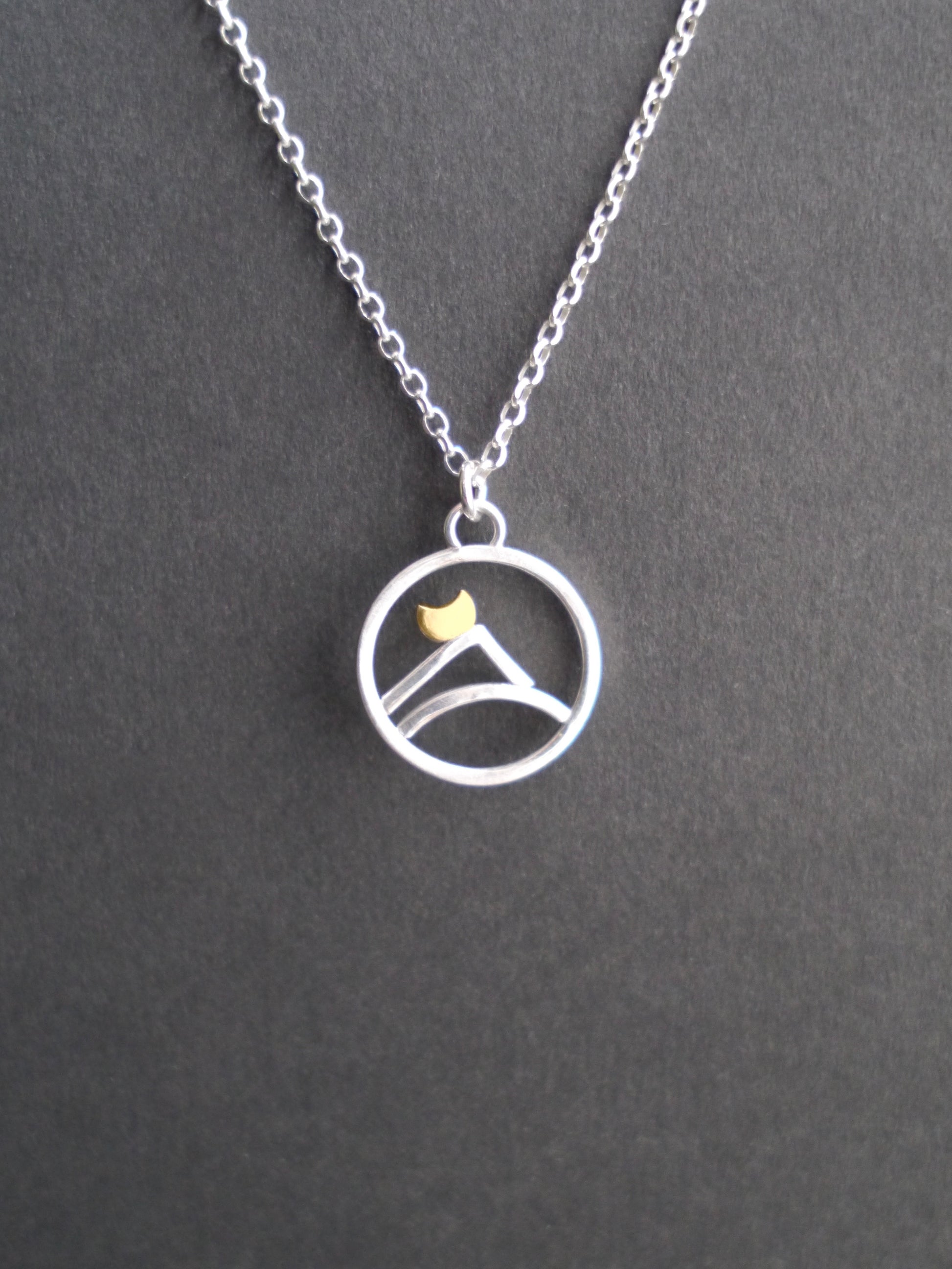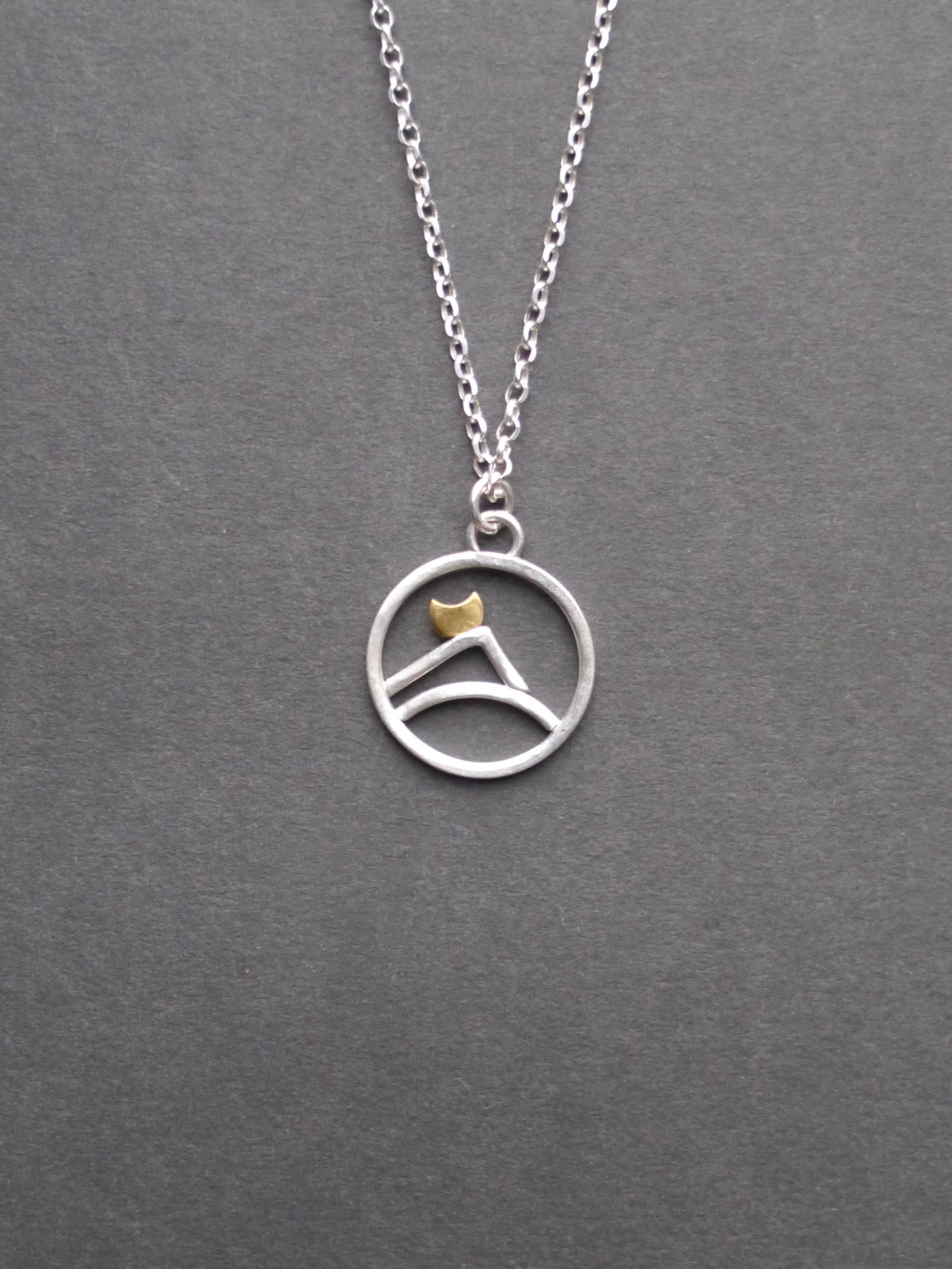 In these mixed-metal pendants, a minimalist mountain landscape rests beneath the sunlit or moonlit sky. Each handcrafted pendant features a unique mini mountain landscape created from sterling silver square wire, with a tiny brass sun or moon hanging low in the sky. Each pendant is topped with a handmade bail.