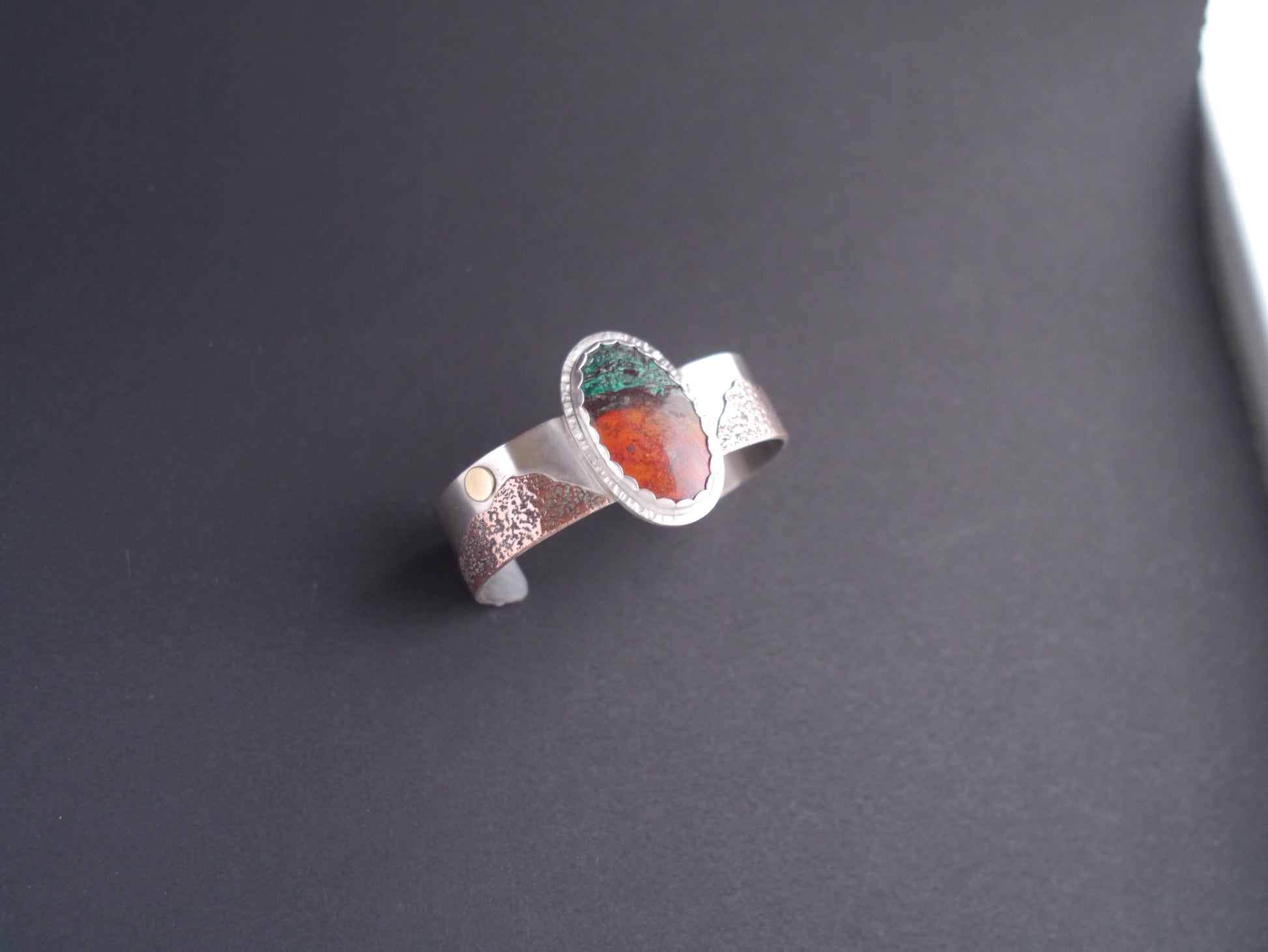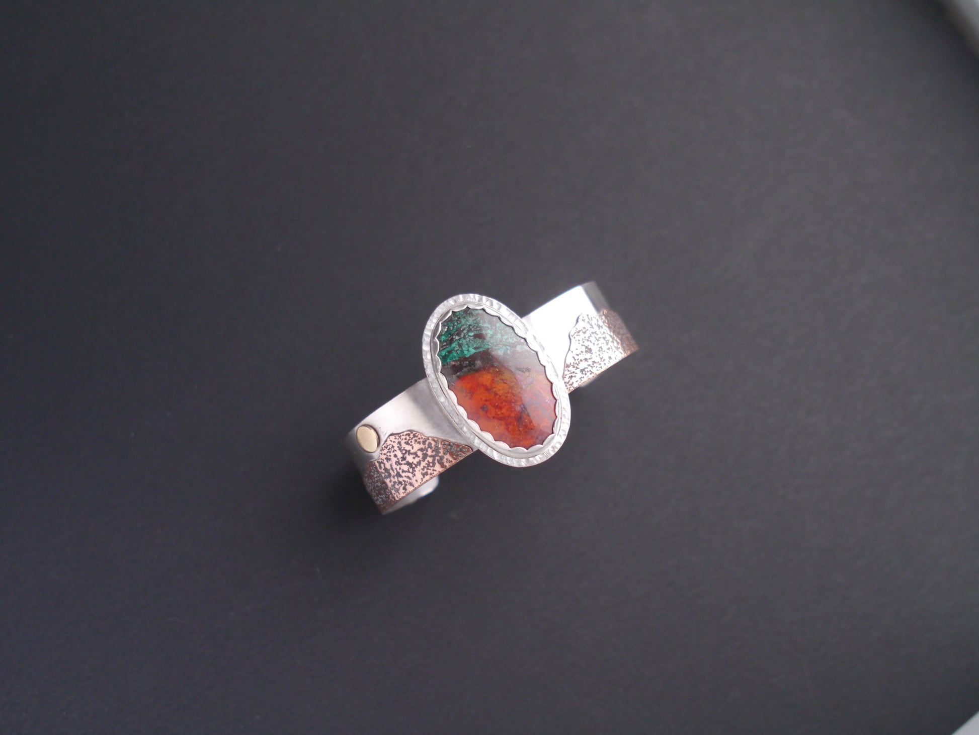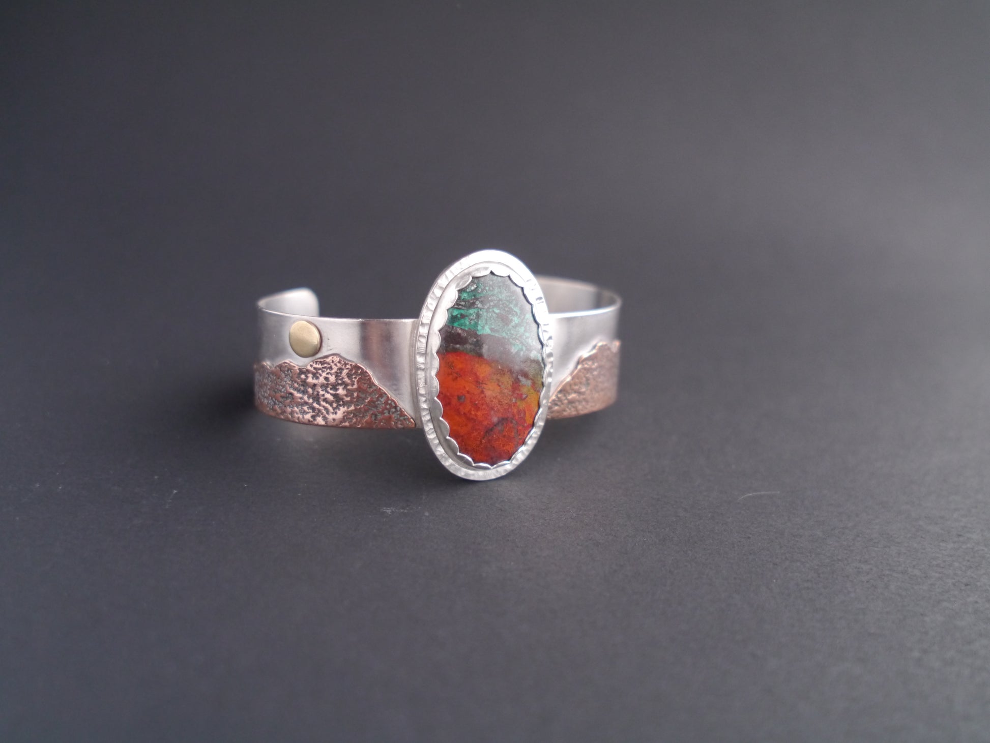 The stone is set in a fine silver scalloped bezel and bordered with a hammered sterling silver frame that adds depth and structure. A wide sterling silver cuff anchors the design, featuring textured copper mountain ranges beneath a glowing brass moon. An antiqued finish highlights the details, giving the piece a rugged yet refined presence.