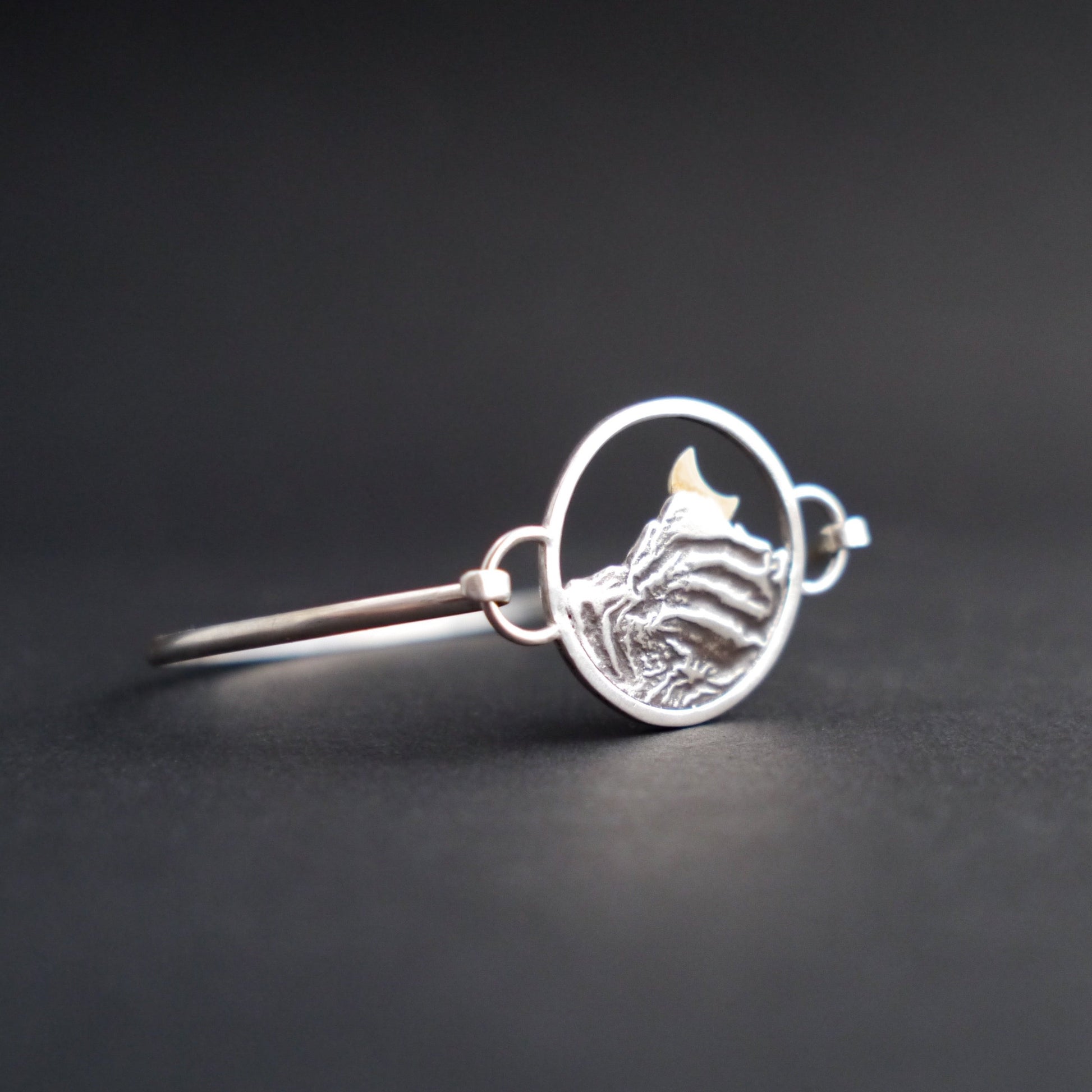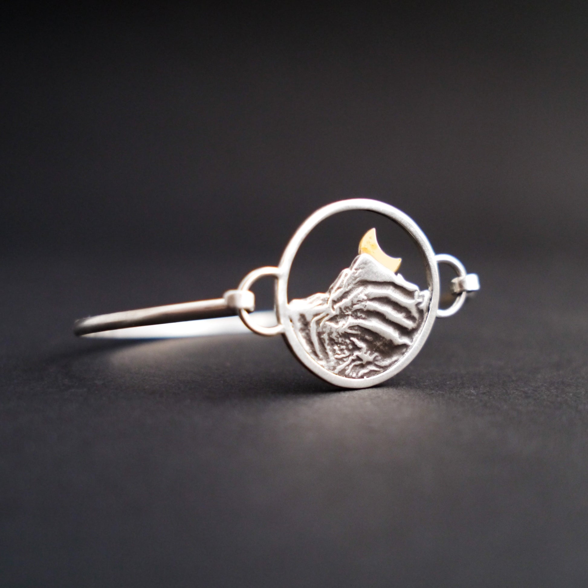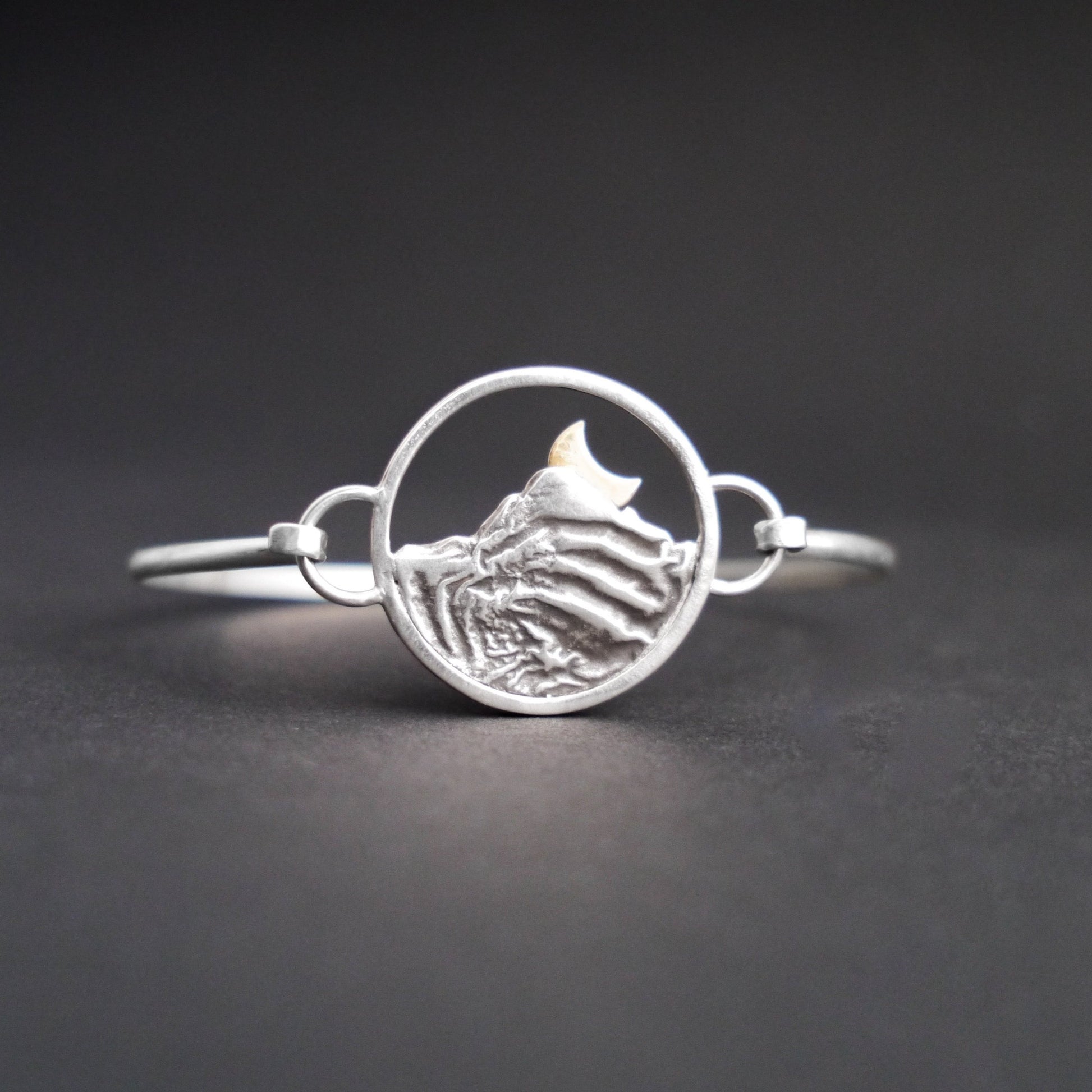 Carry the spirit of the mountains with you with our Rocky Mountain Vistas Bracelet. Featuring a round, intricately detailed mountain landscape, this bracelet is crafted with a sleek sterling silver band that wraps comfortably around your wrist. The tension clasp ensures a secure and stylish fit, making it easy to wear every day. This bracelet is a perfect blend of elegance and rugged beauty, ideal for anyone who feels connected to the outdoors and wants to keep that connection close at hand.