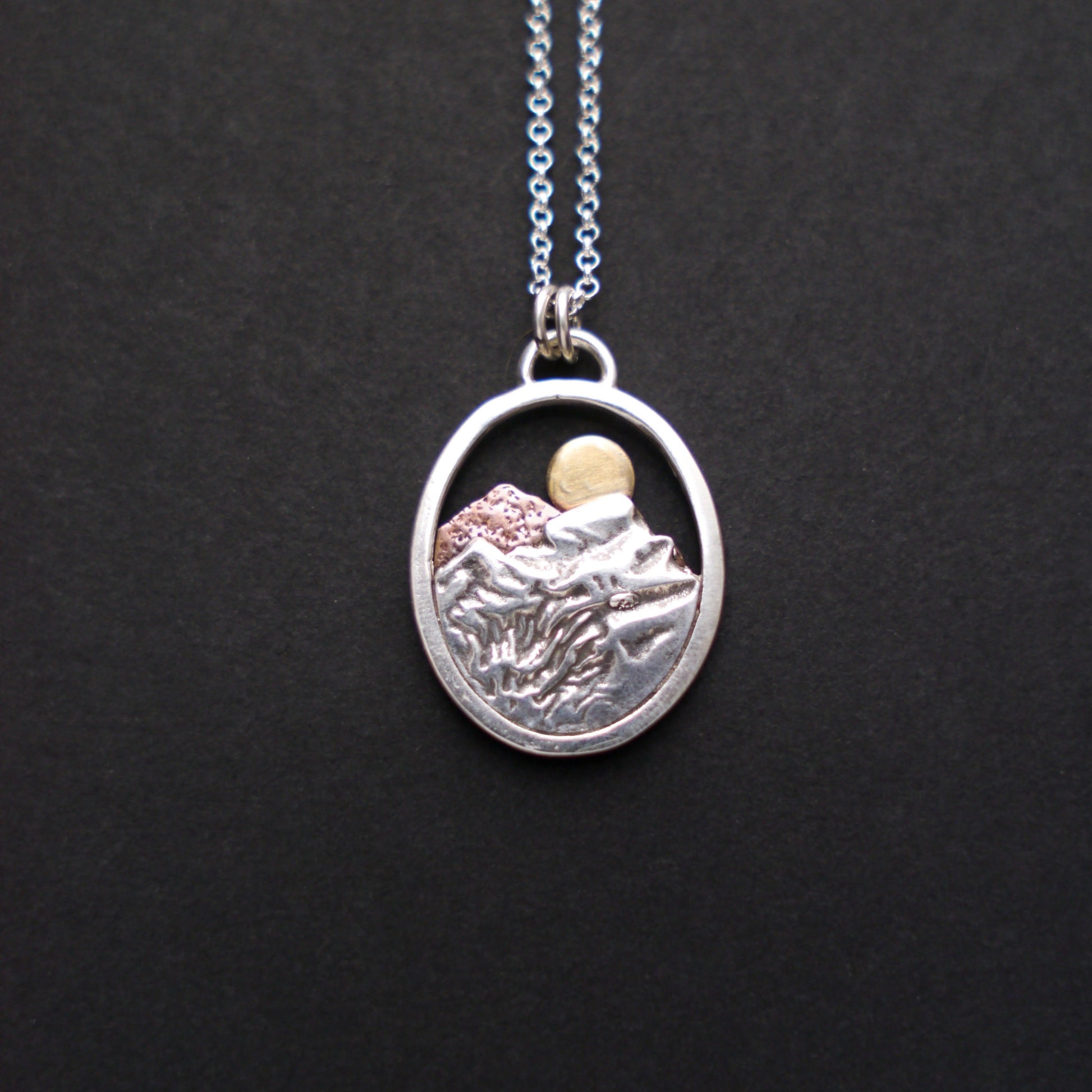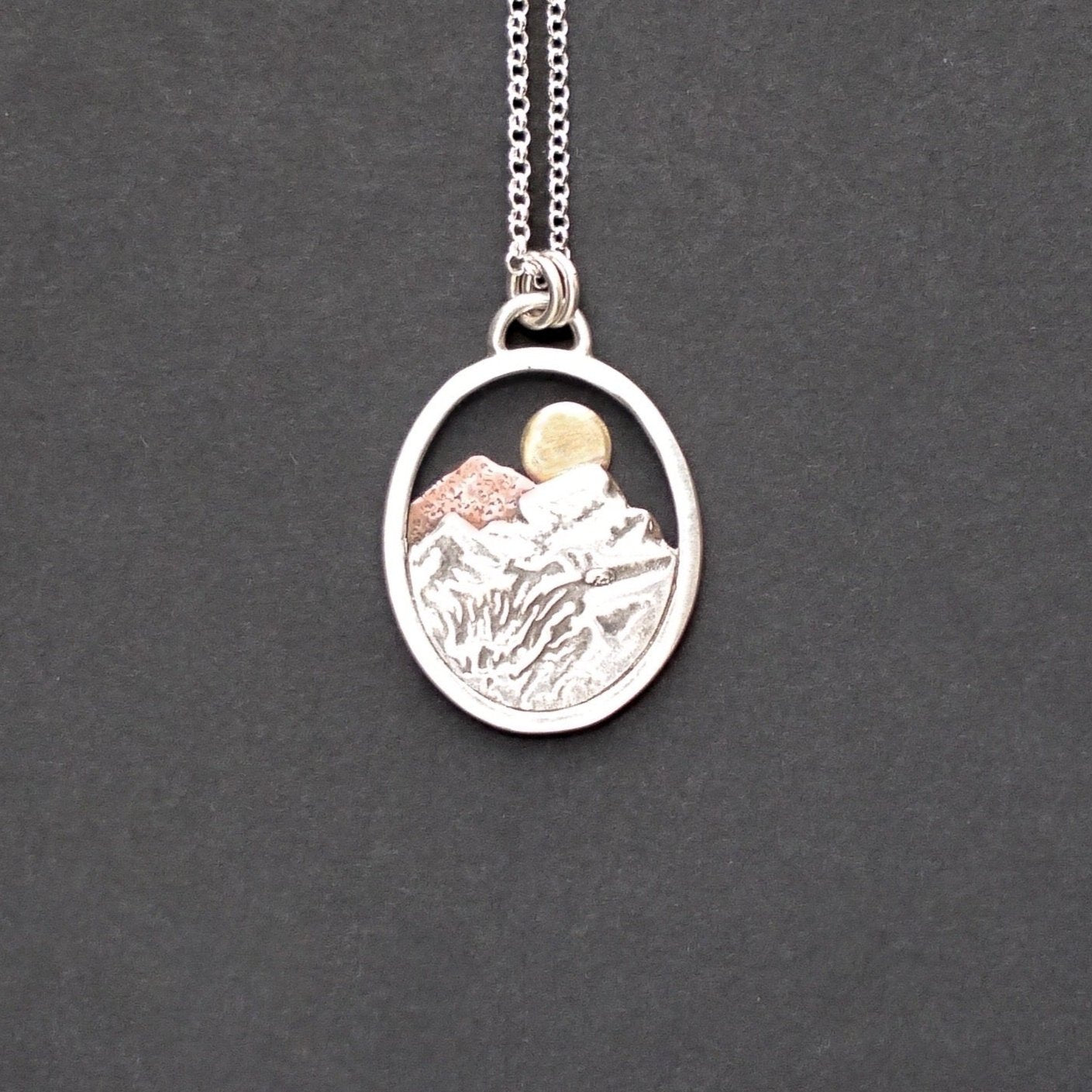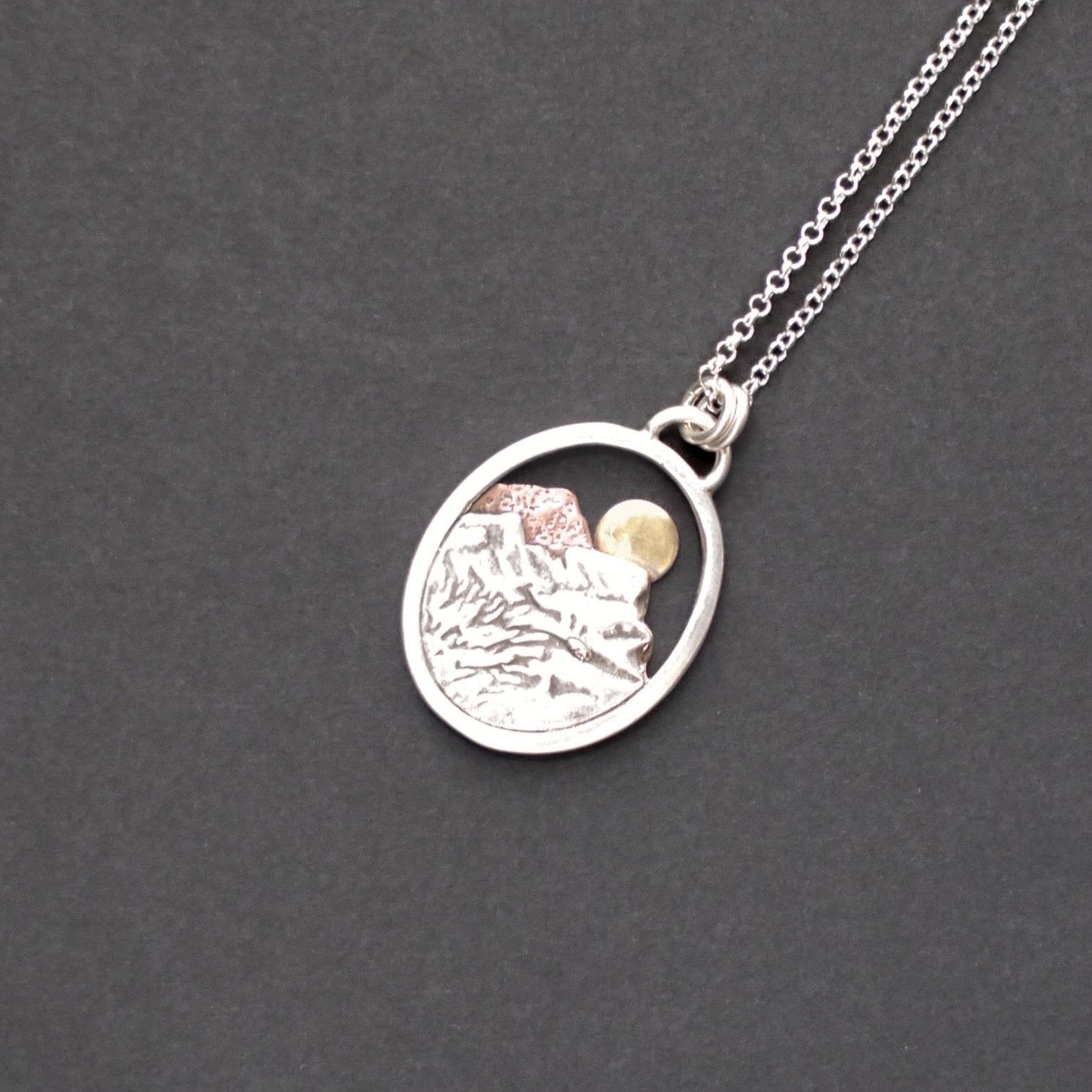 Capture the serene beauty of mountain landscapes with our Small Oval Mountain Pendants. Each pendant features a meticulously crafted scene made from sterling silver or a combination of sterling silver and recycled copper, depicting rugged peaks under a gleaming brass moon. These small, elegant ovals frame nature’s majesty in a wearable work of art, perfect for those who carry a love for the outdoors close to their heart. Whether worn solo or layered, these pendants bring a touch of the wild into your everyday style.