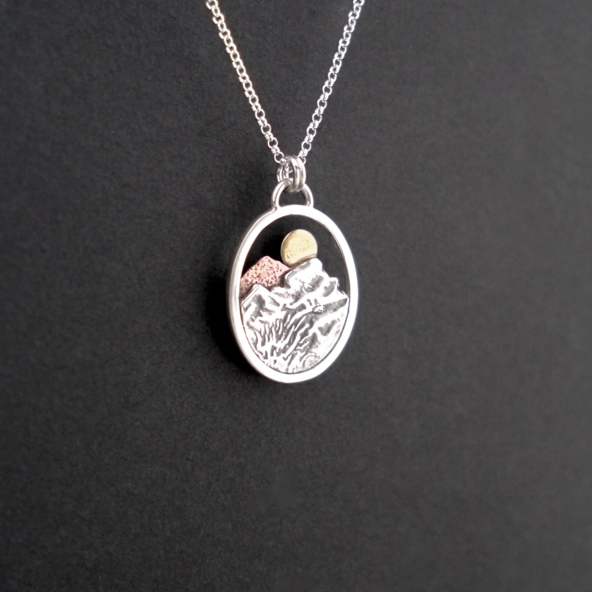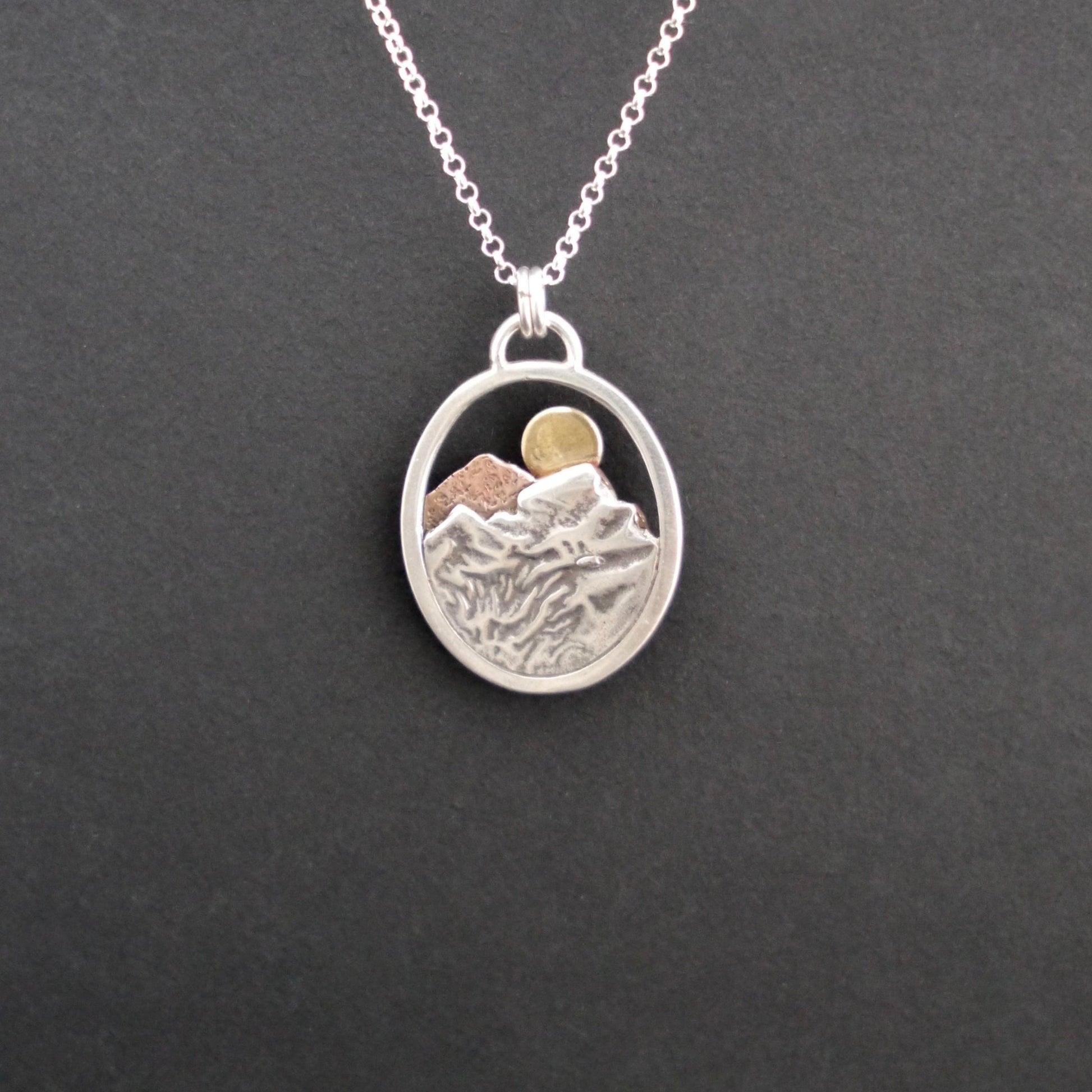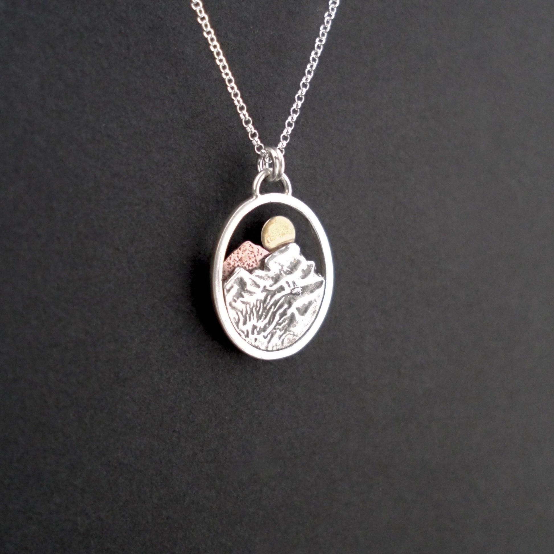 Capture the serene beauty of mountain landscapes with our Small Oval Mountain Pendants. Each pendant features a meticulously crafted scene made from sterling silver or a combination of sterling silver and recycled copper, depicting rugged peaks under a gleaming brass moon. These small, elegant ovals frame nature’s majesty in a wearable work of art, perfect for those who carry a love for the outdoors close to their heart. Whether worn solo or layered, these pendants bring a touch of the wild into your everyday style.