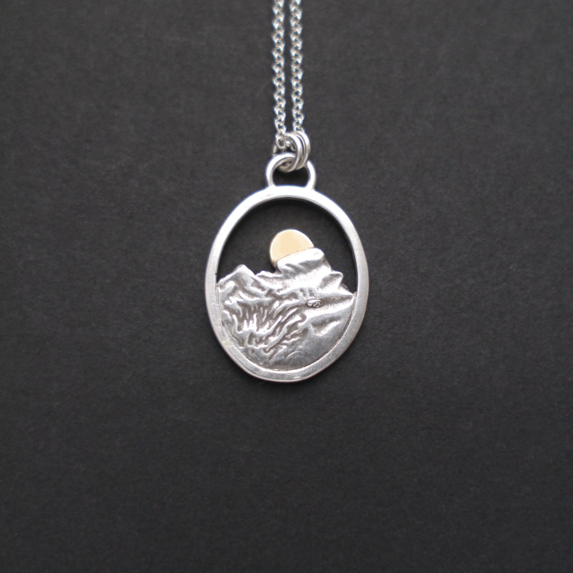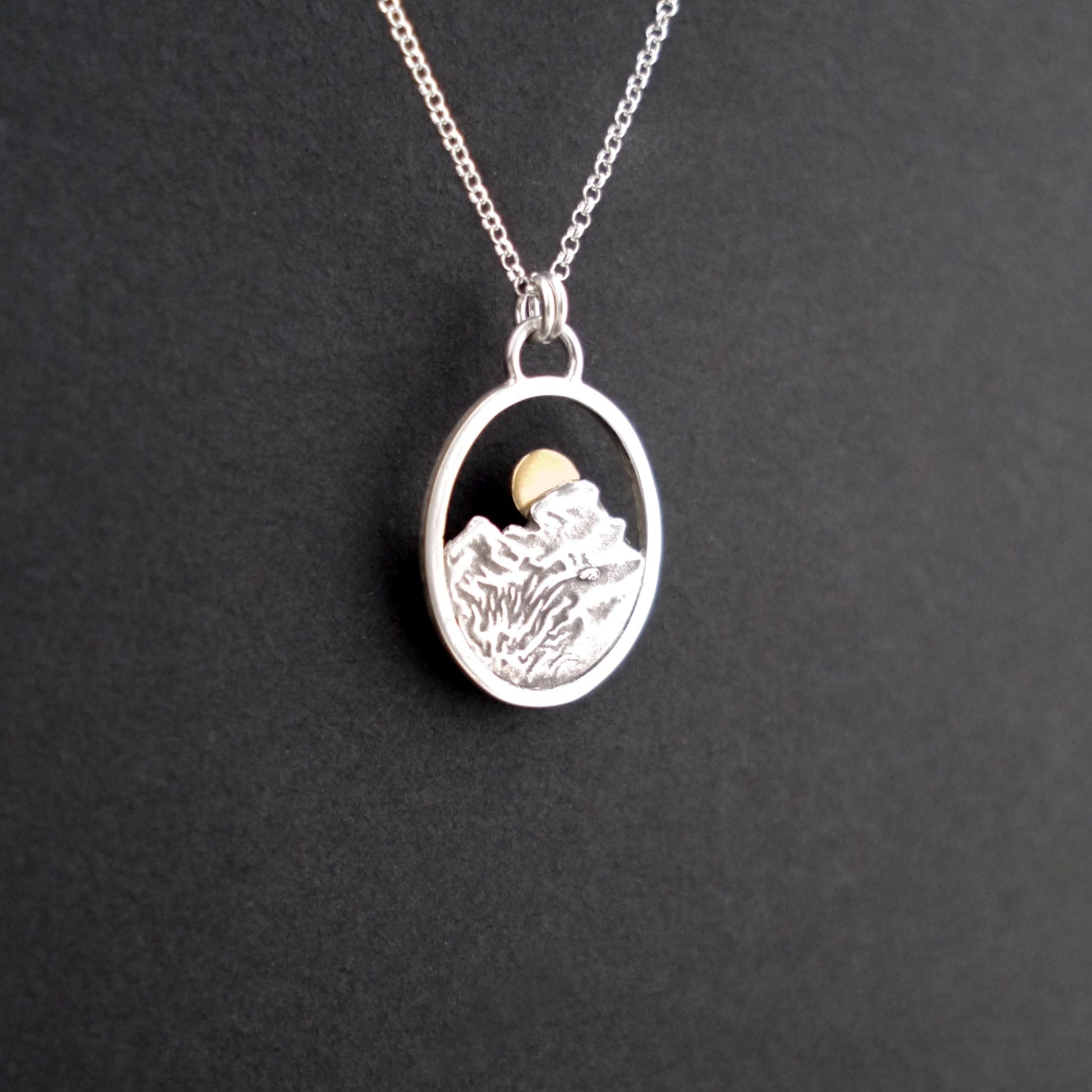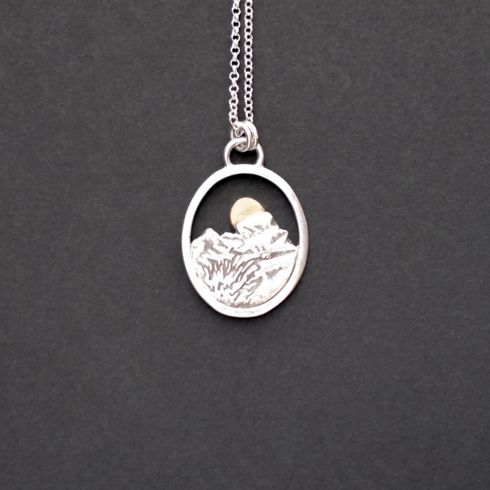 Capture the serene beauty of mountain landscapes with our Small Oval Mountain Pendants. Each pendant features a meticulously crafted scene made from sterling silver or a combination of sterling silver and recycled copper, depicting rugged peaks under a gleaming brass moon. These small, elegant ovals frame nature’s majesty in a wearable work of art, perfect for those who carry a love for the outdoors close to their heart. Whether worn solo or layered, these pendants bring a touch of the wild into your everyday style.