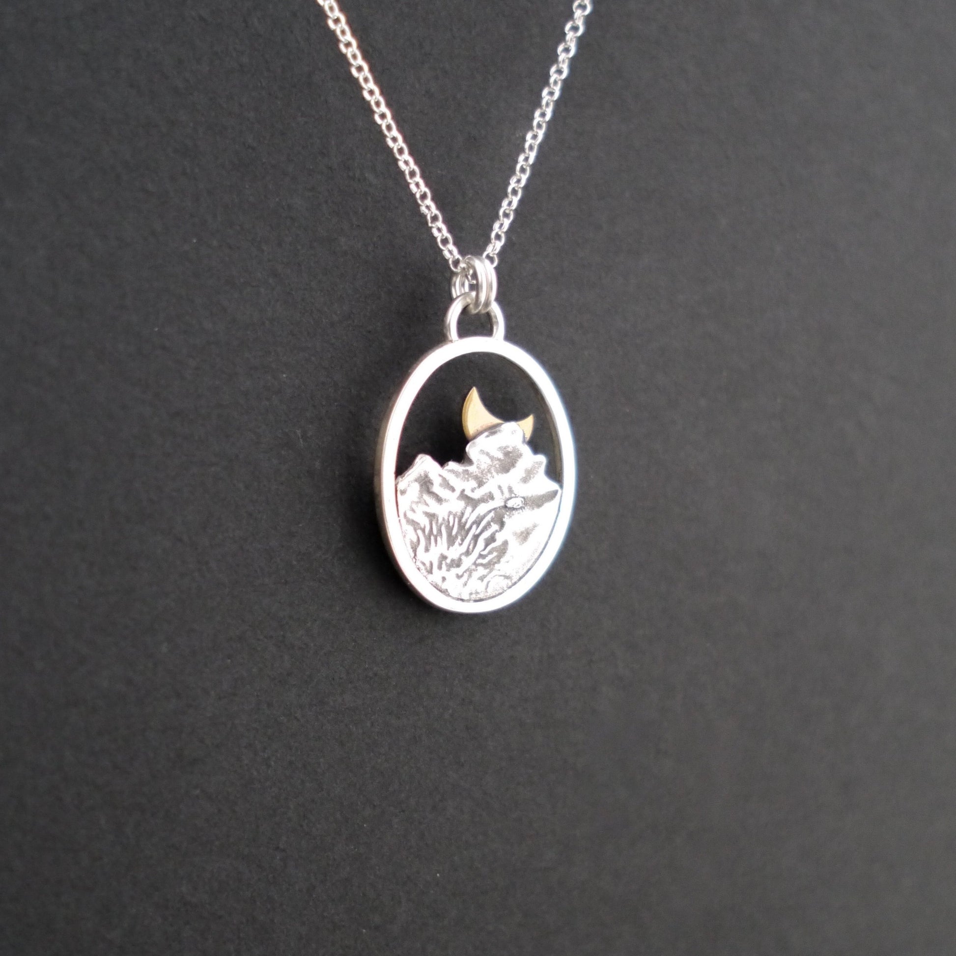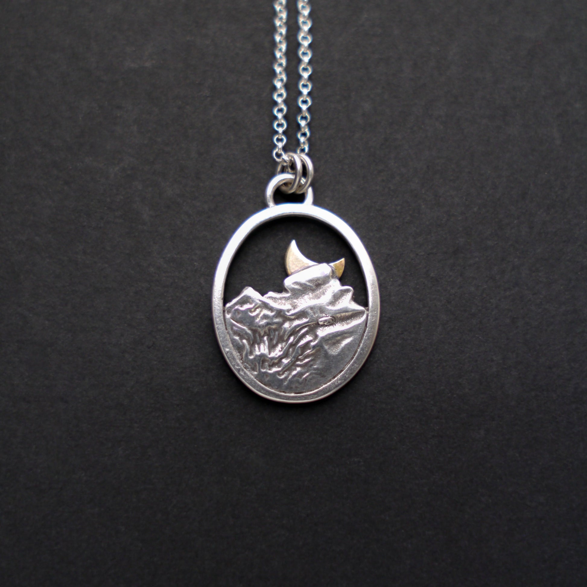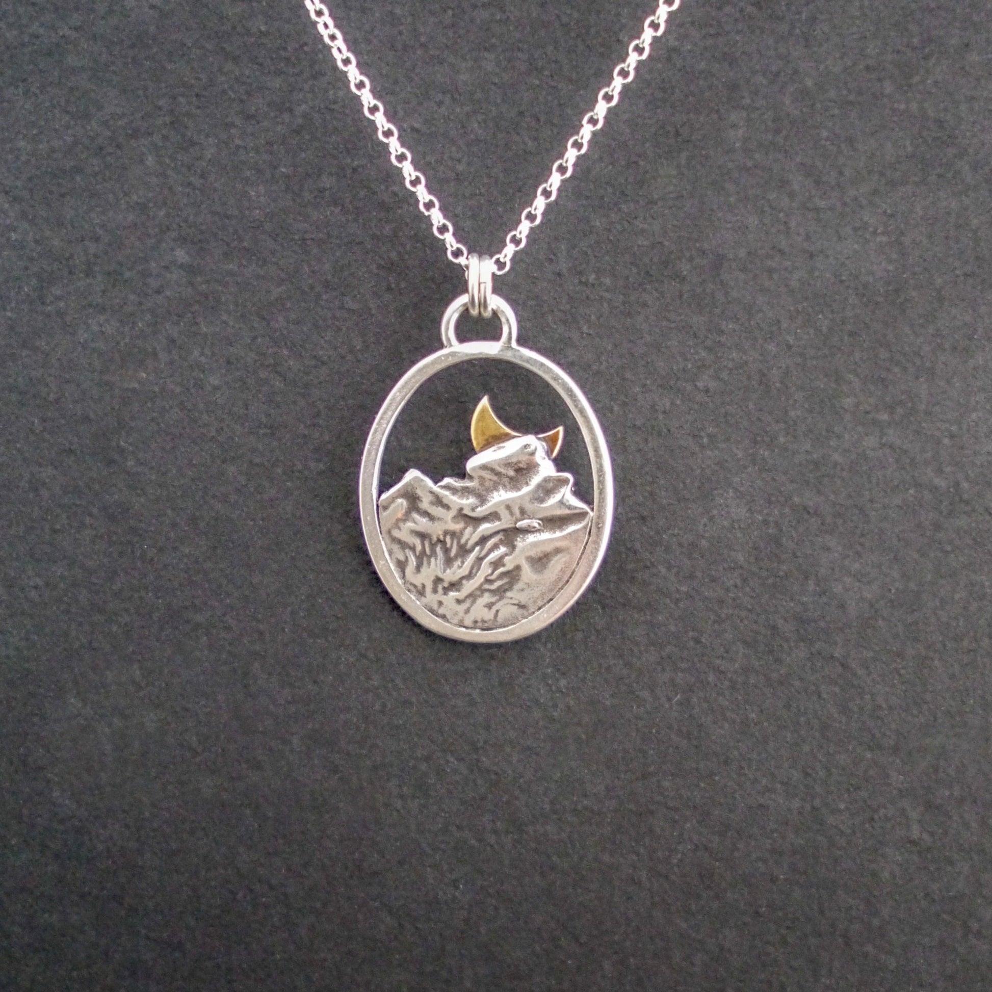 Capture the serene beauty of mountain landscapes with our Small Oval Mountain Pendants. Each pendant features a meticulously crafted scene made from sterling silver or a combination of sterling silver and recycled copper, depicting rugged peaks under a gleaming brass moon. These small, elegant ovals frame nature’s majesty in a wearable work of art, perfect for those who carry a love for the outdoors close to their heart. Whether worn solo or layered, these pendants bring a touch of the wild into your everyday style.