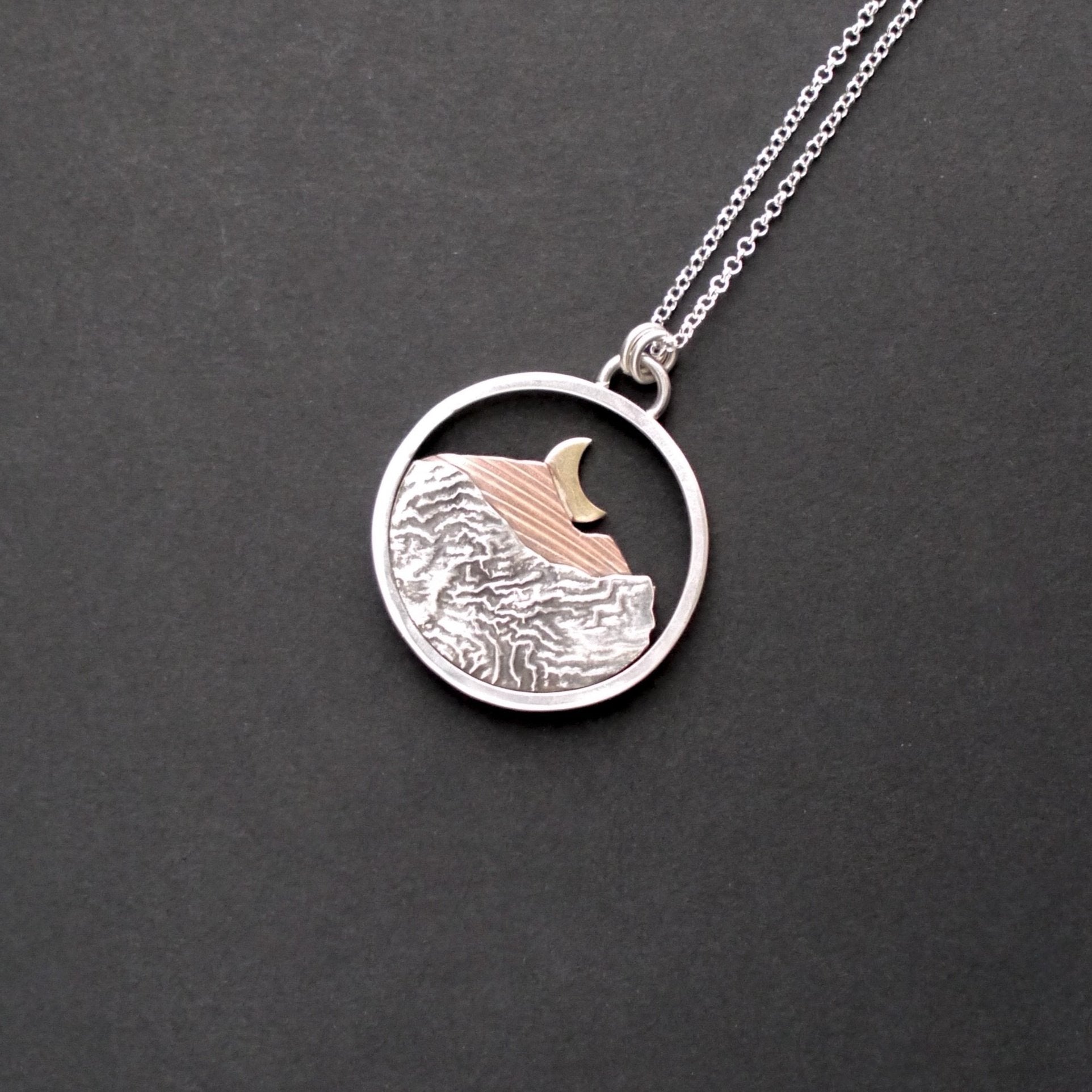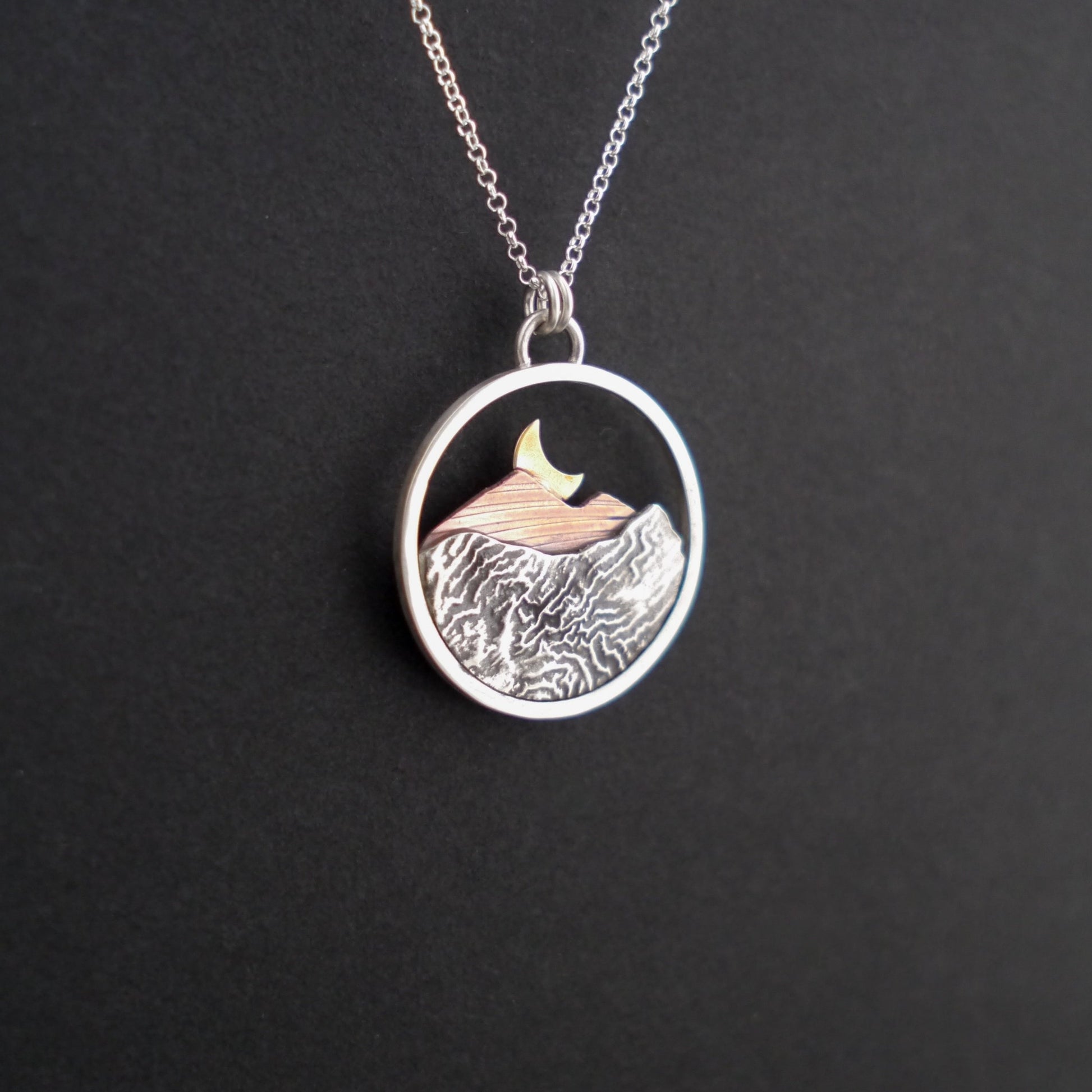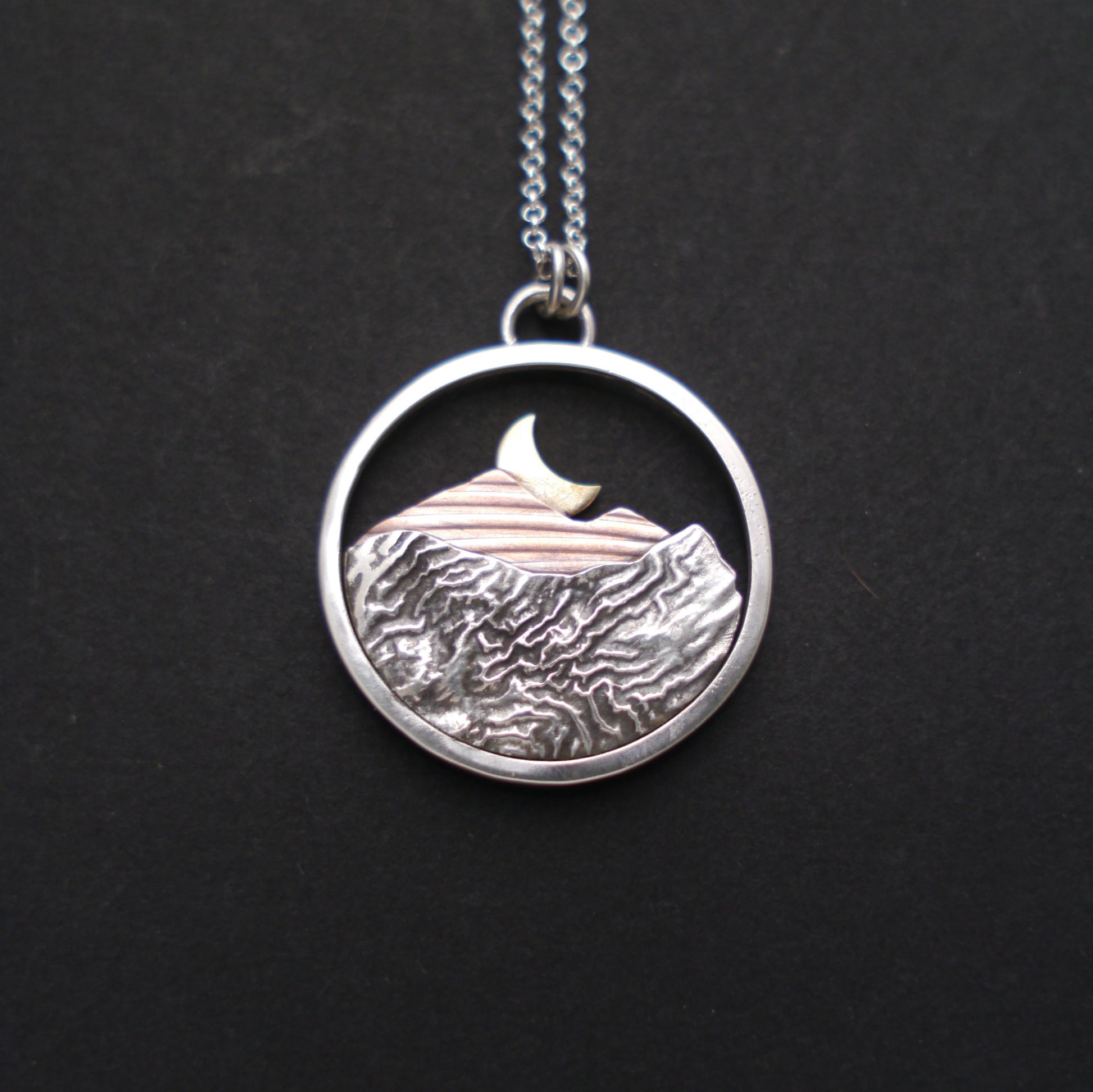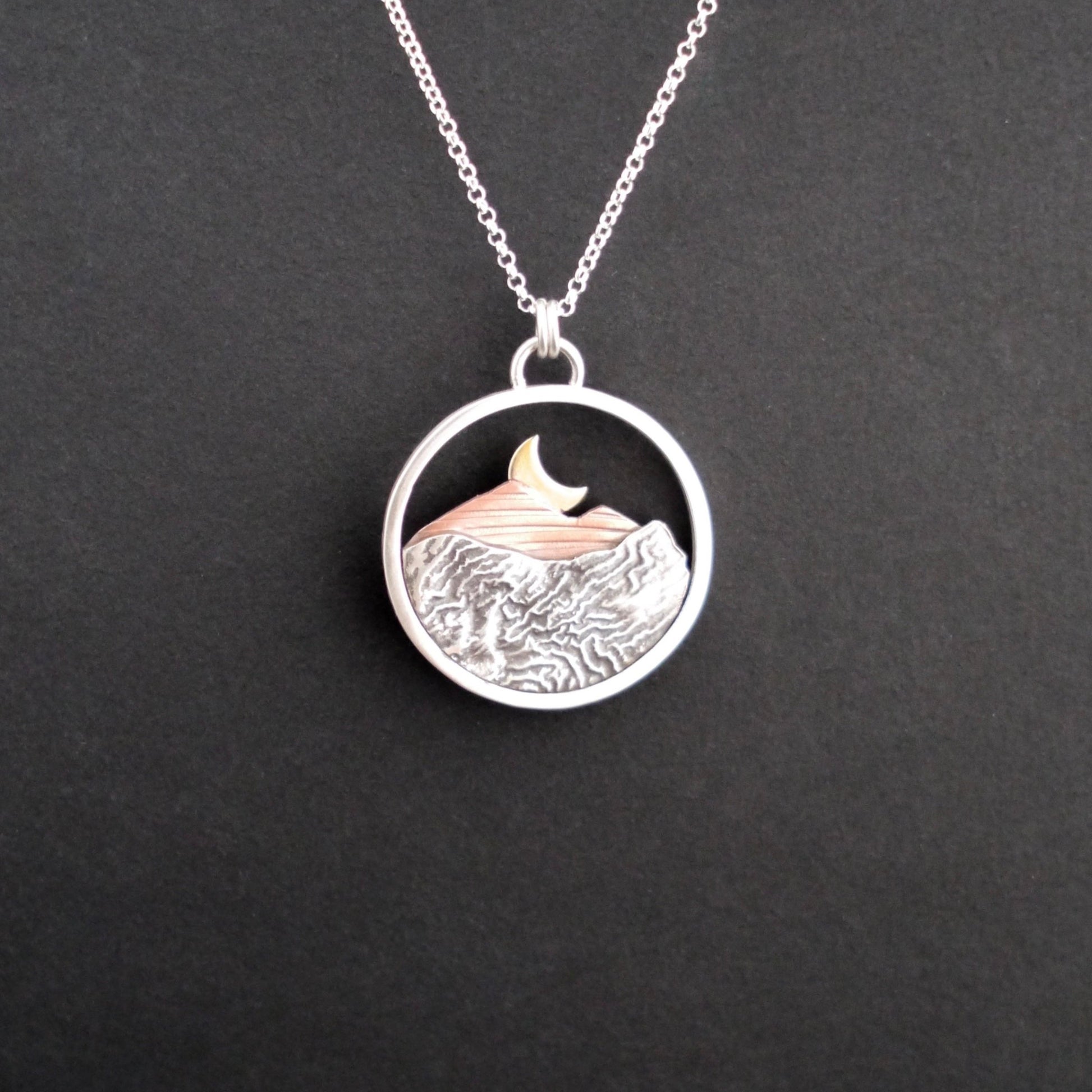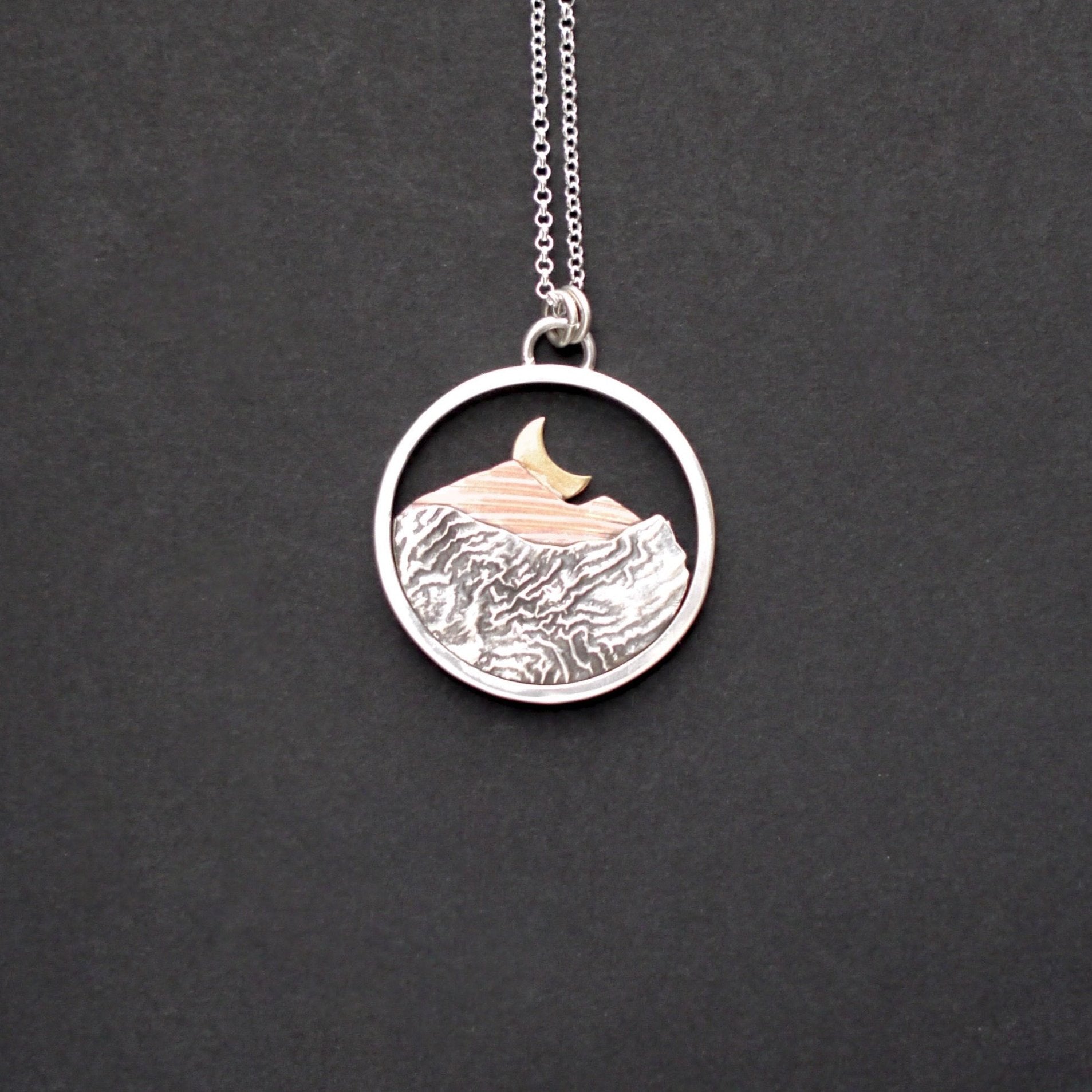 Embrace the raw beauty of the outdoors with our round Rocky Mountain Vista Pendants. Crafted from a harmonious blend of sterling silver and recycled copper, these pendants feature reticulated silver mountains that capture the rugged texture and timeless appeal of nature’s peaks. The circular design frames these dynamic landscapes, creating a striking piece of jewelry that echoes the untamed wilderness. Perfect for nature lovers and adventurers, these pendants bring a touch of the mountains to your everyday journey.