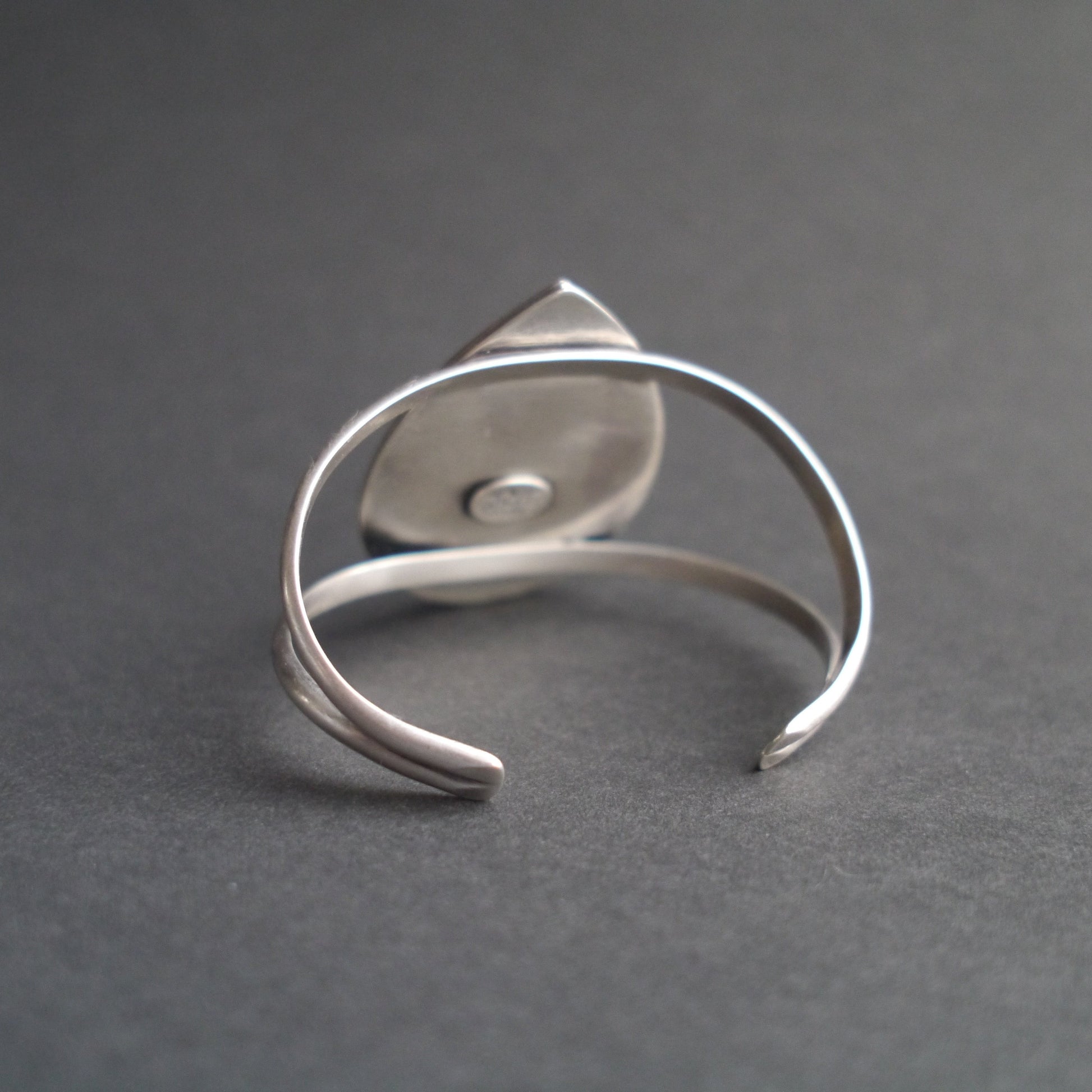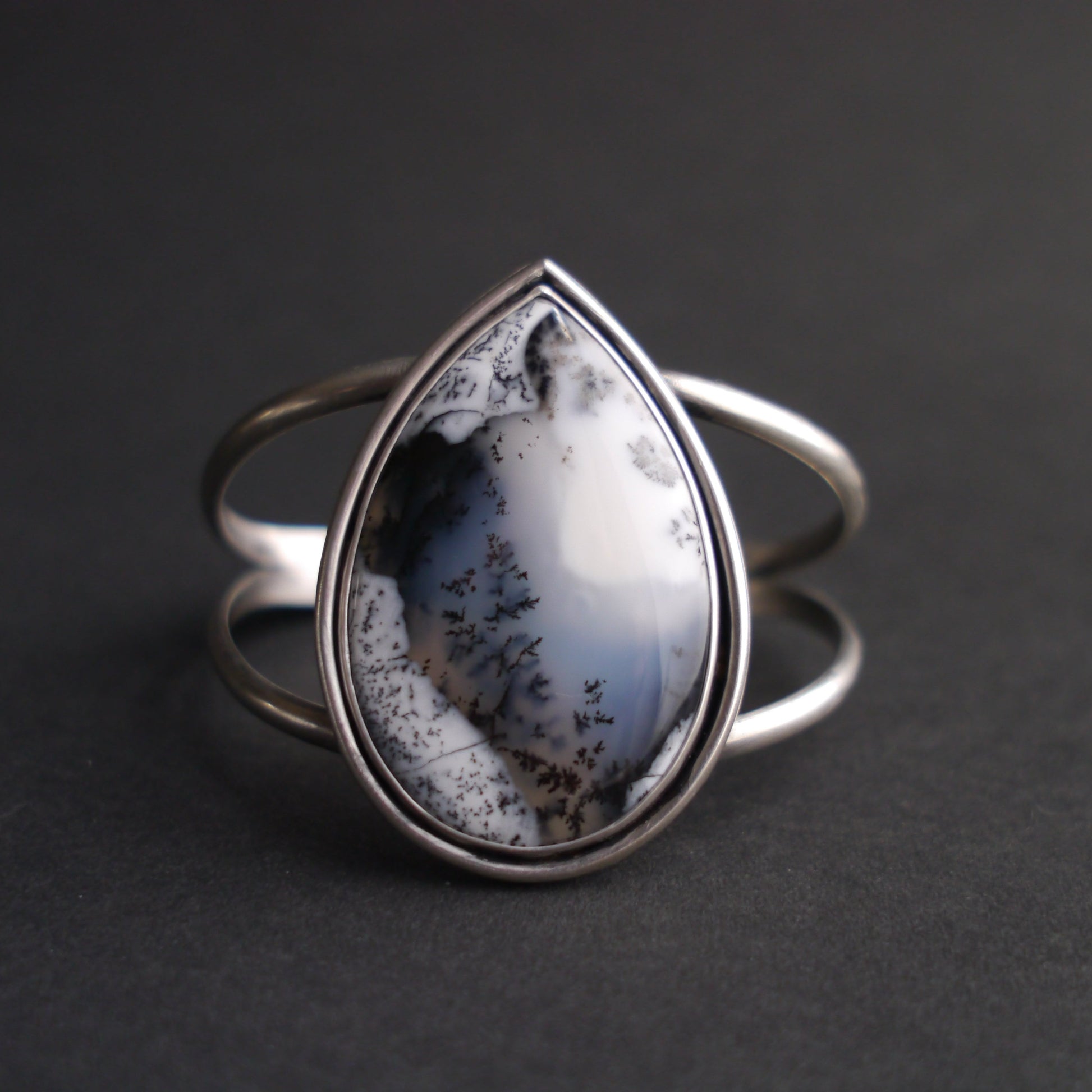 The Dendritic Opal Cuff Bracelet captures the serene beauty of winter in its elegant design. Featuring dendritic agate stones, each with a milky white hue and a deep grey-blue translucent luster, this piece evokes the imagery of ice-covered waters and snow-dusted tree branches. The stones are carefully set in fine silver bezels, resting atop a sleek sterling silver cuff, creating a striking contrast between the natural beauty of the stone and the polished metal.