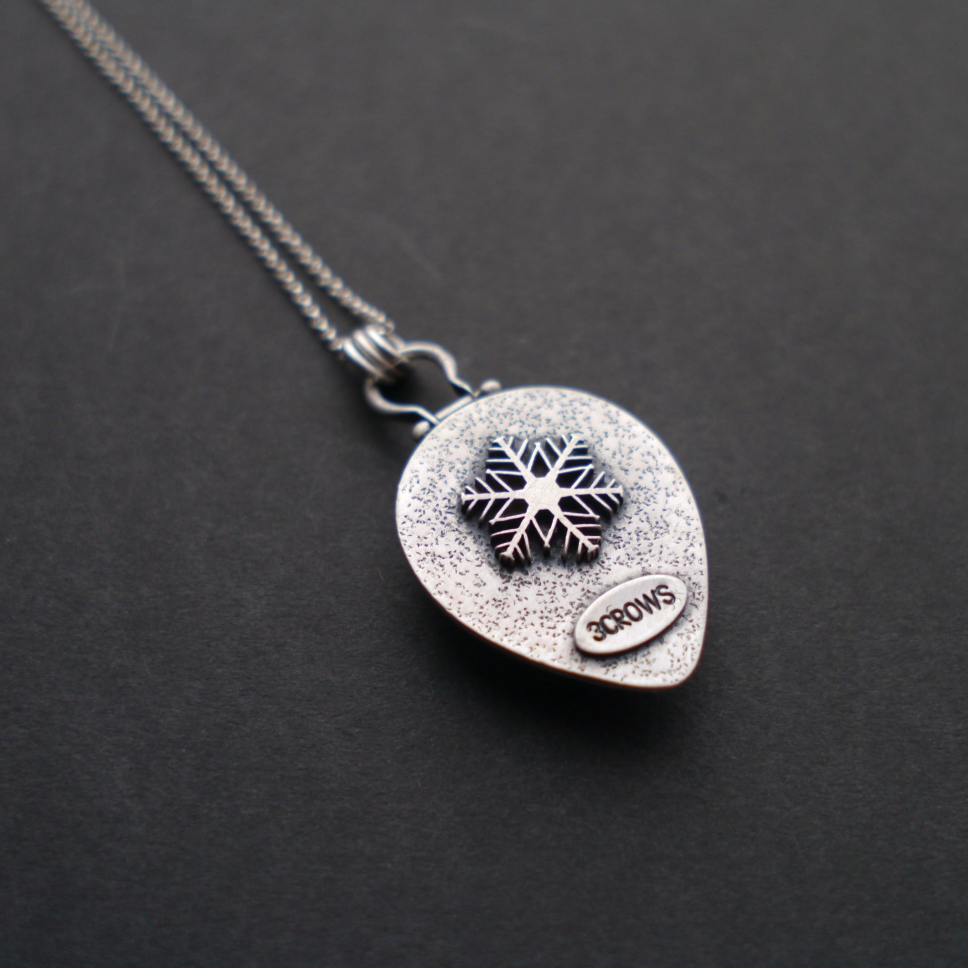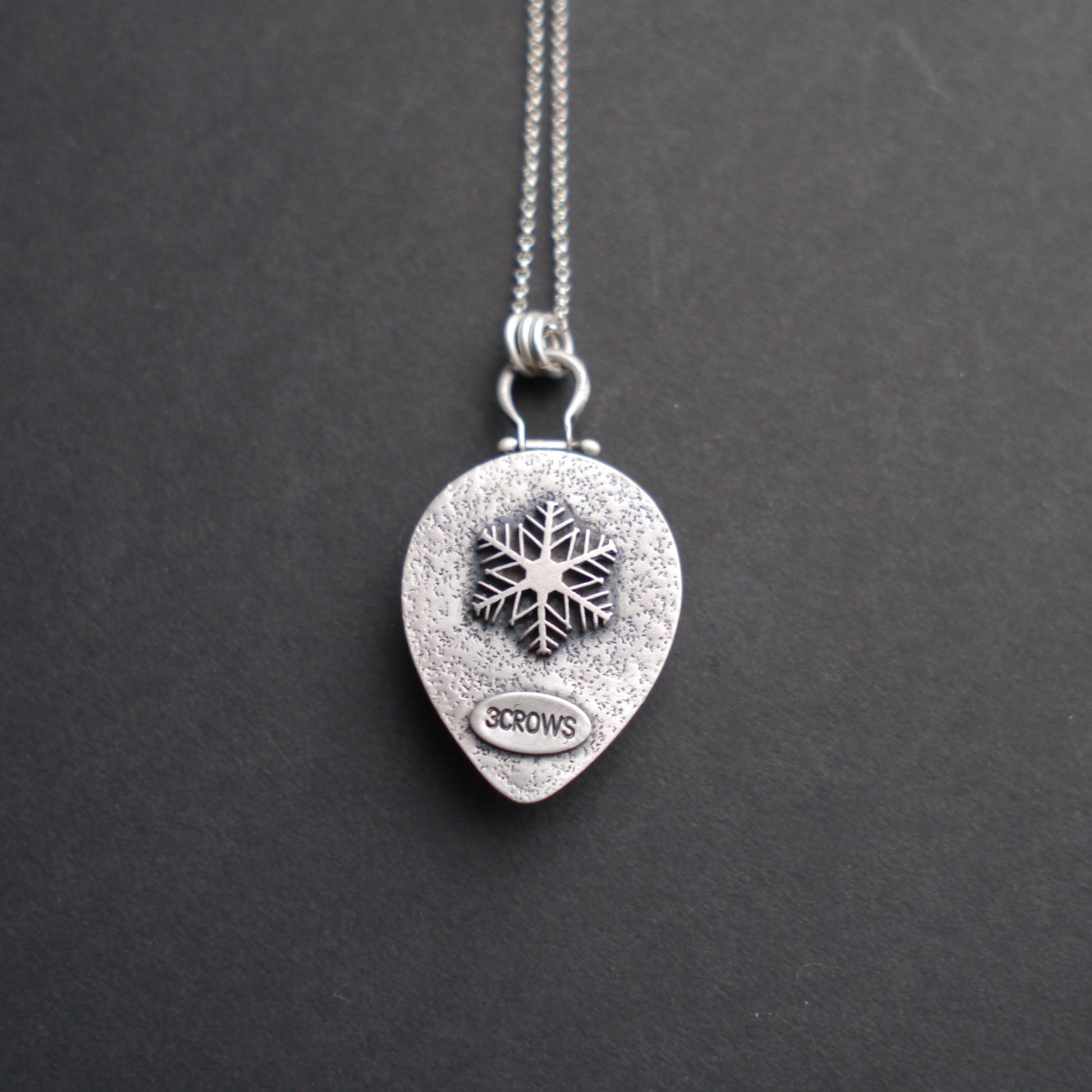 Each pendant is adorned with a decorative handcrafted hinge bail and a silver snowflake embellishment on the back, adding a touch of winter magic. The pendant is sold on an 18-inch chain, with custom chain options available through this link for a personalized fit.