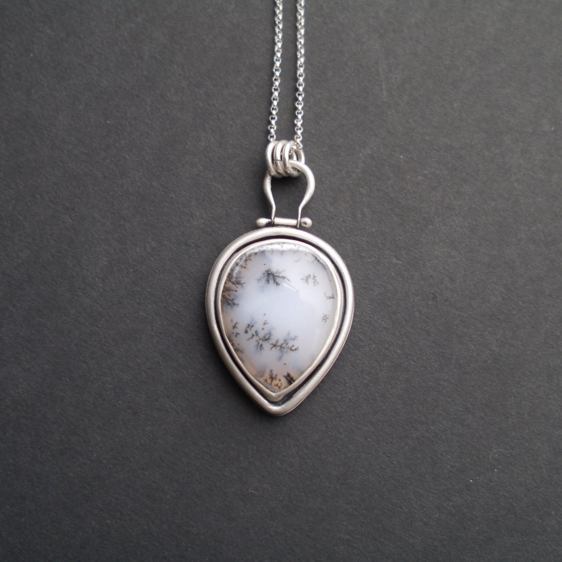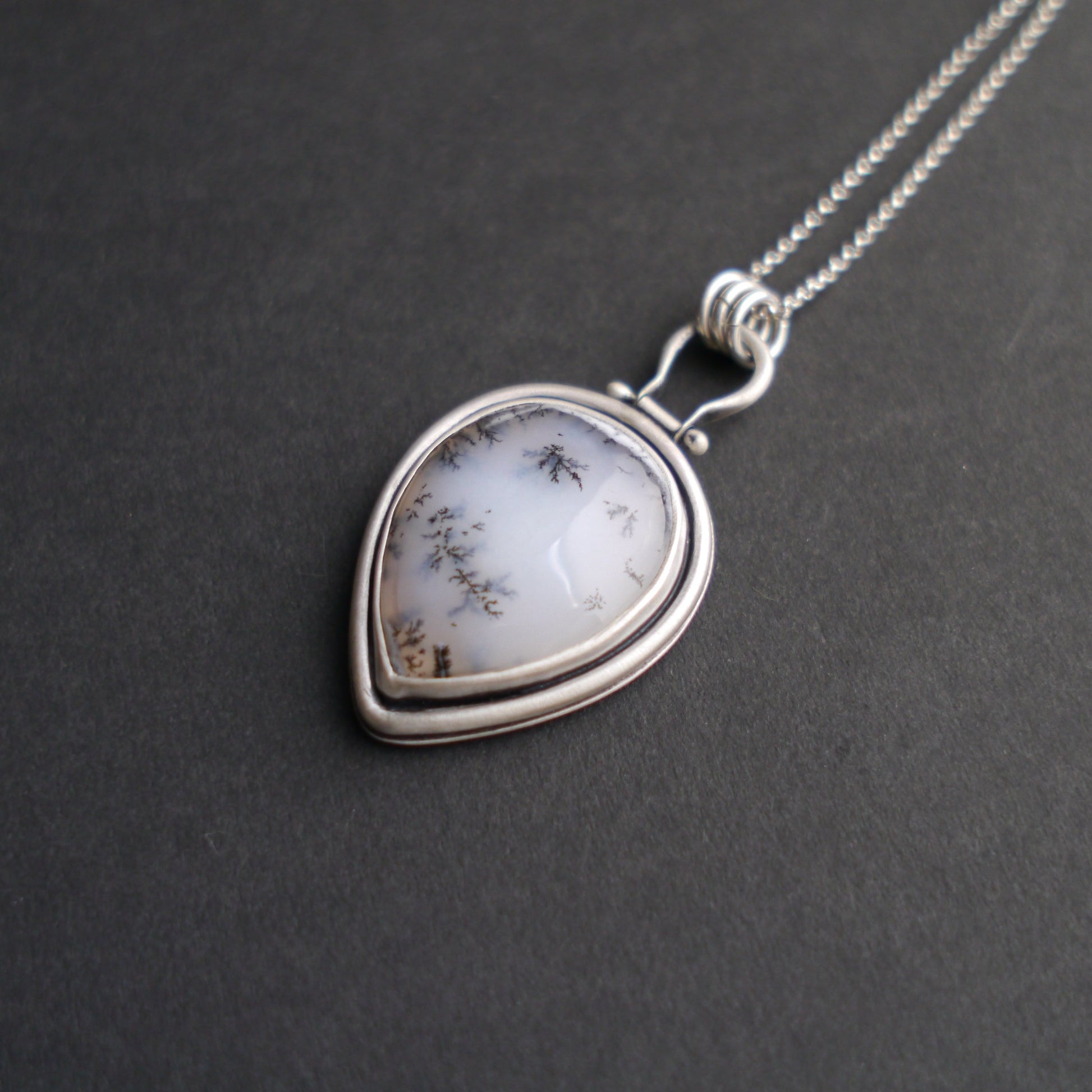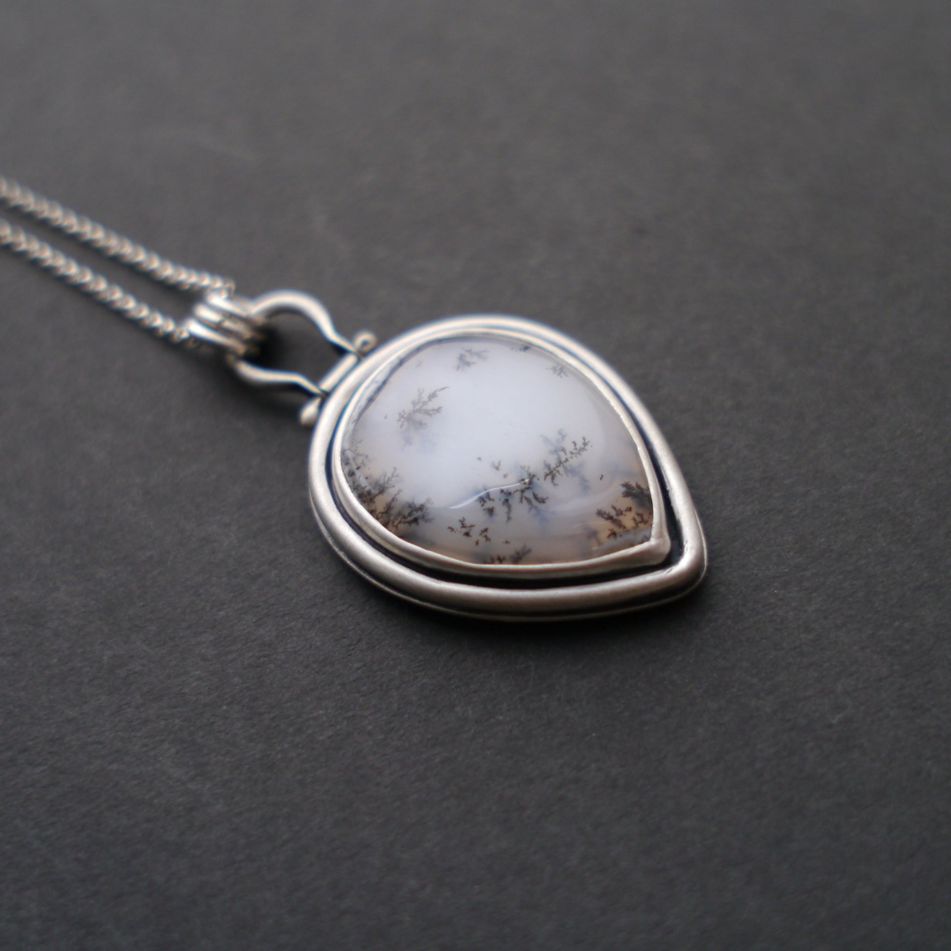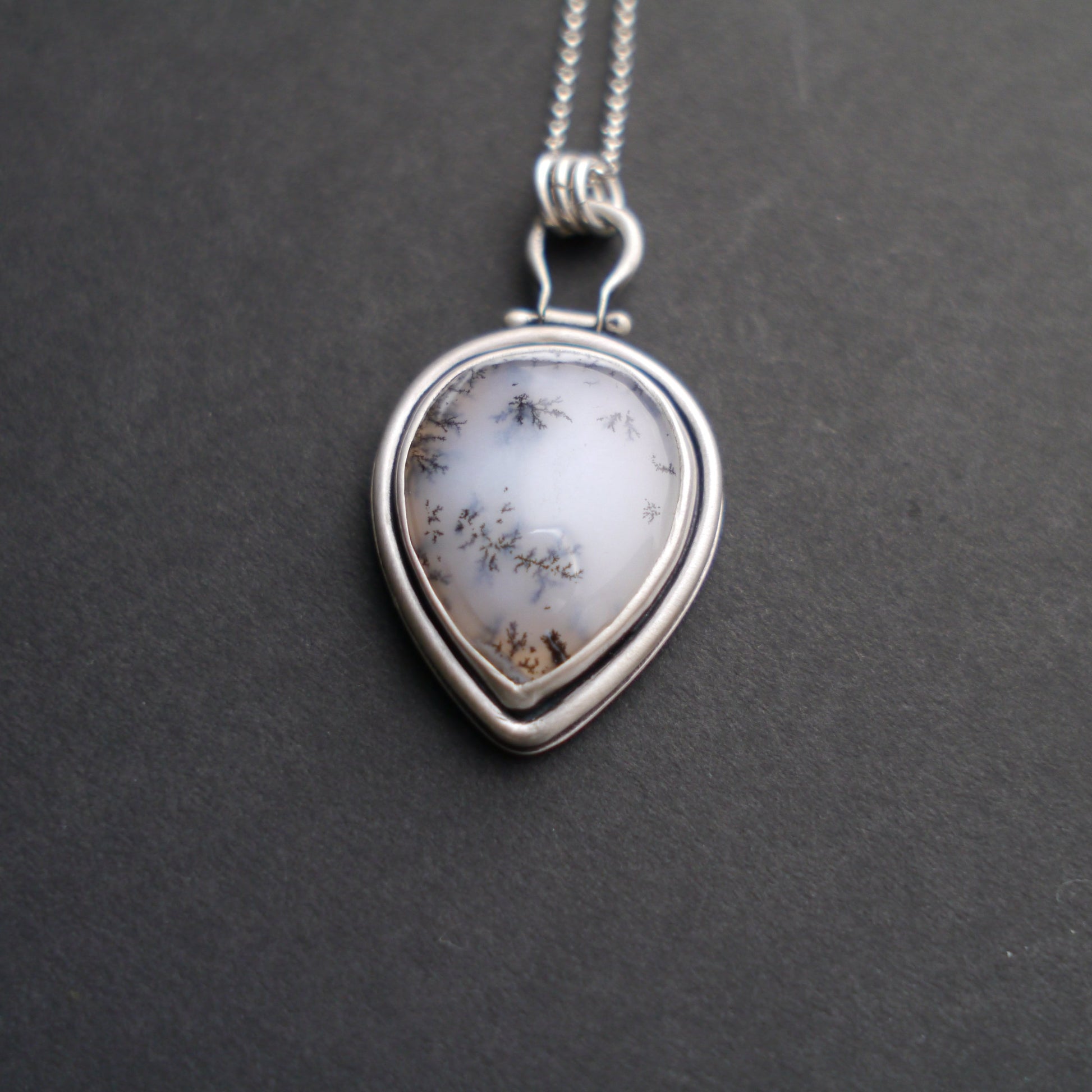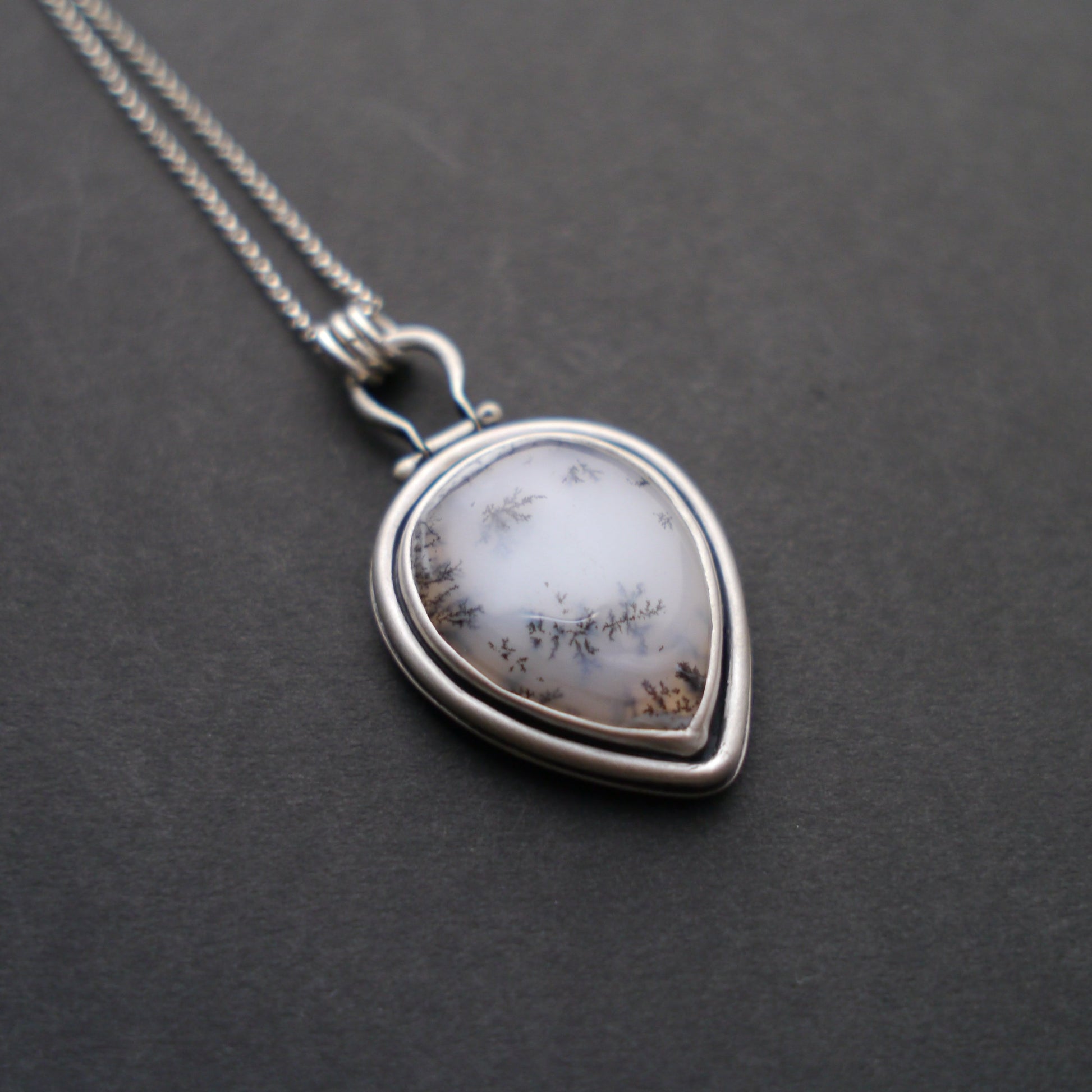 Embrace the quiet calm of winter with the Serene Snowfall Dendritic Opal Pendant, a limited-edition piece from our Winter 2024 collection. Handcrafted with care, this pendant features dendritic opal, showcasing its cool white hues and delicate grey-blue patterns, reminiscent of snow-covered landscapes and icy branches. The stone is set in sterling silver, creating a striking contrast against the pendant's antiqued frame.