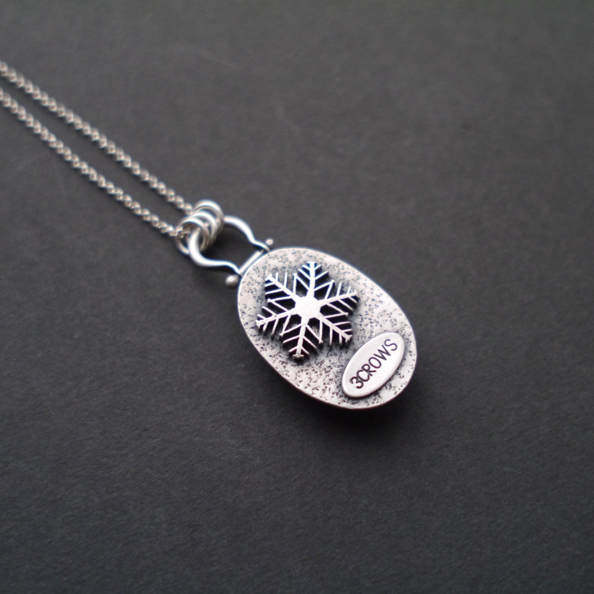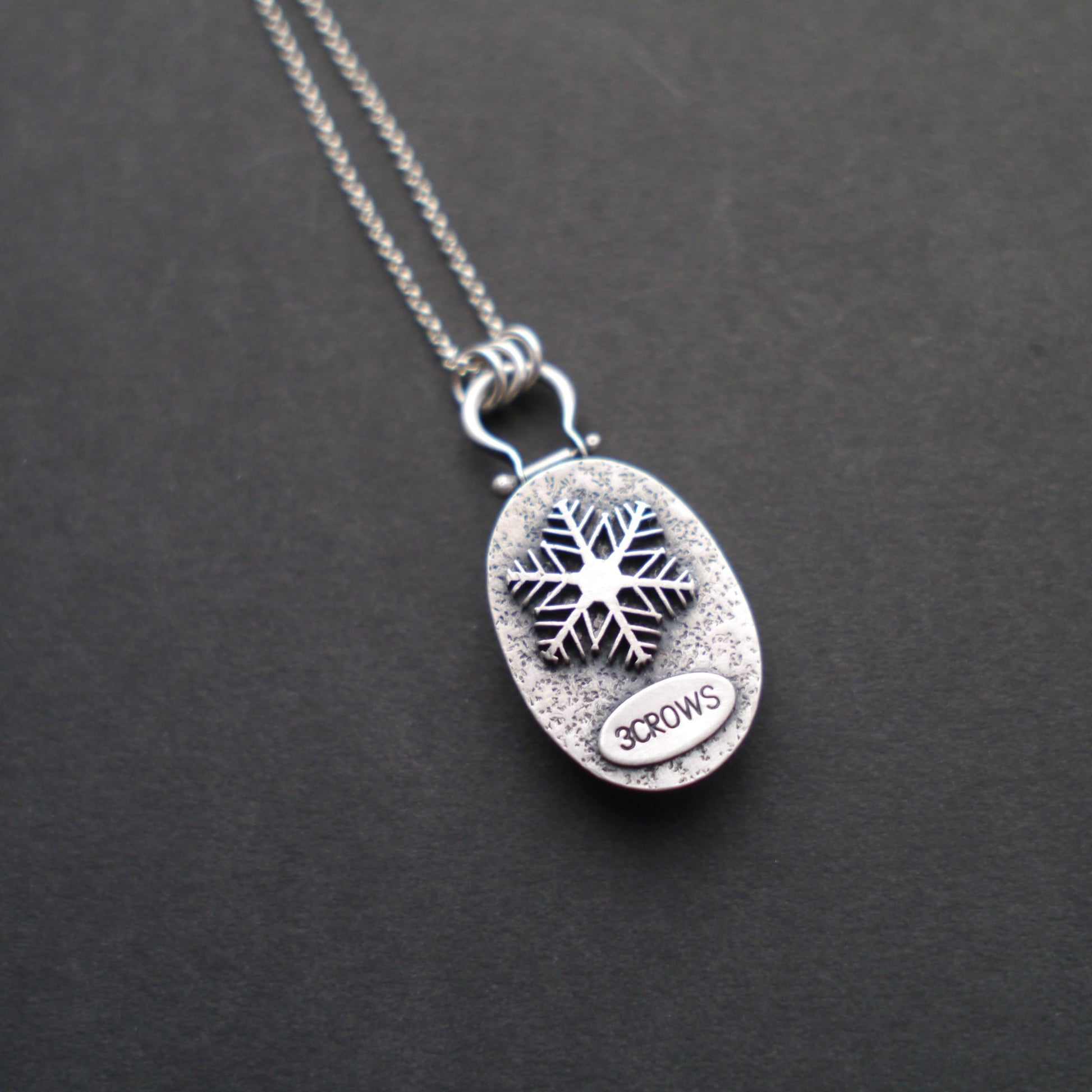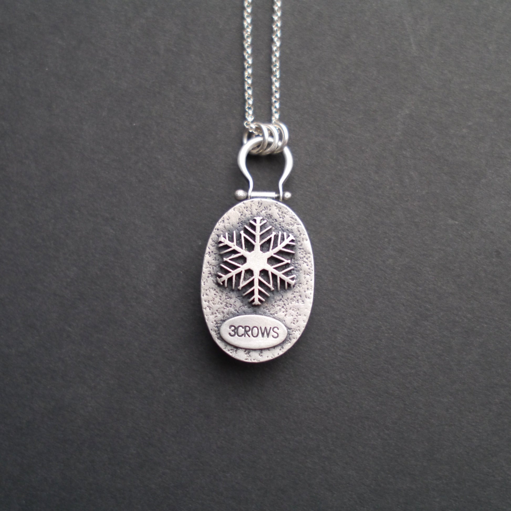 Each pendant is adorned with a decorative handcrafted hinge bail and a silver snowflake embellishment on the back, adding a touch of winter magic. The pendant is sold on an 18-inch chain, with custom chain options available through this link for a personalized fit.