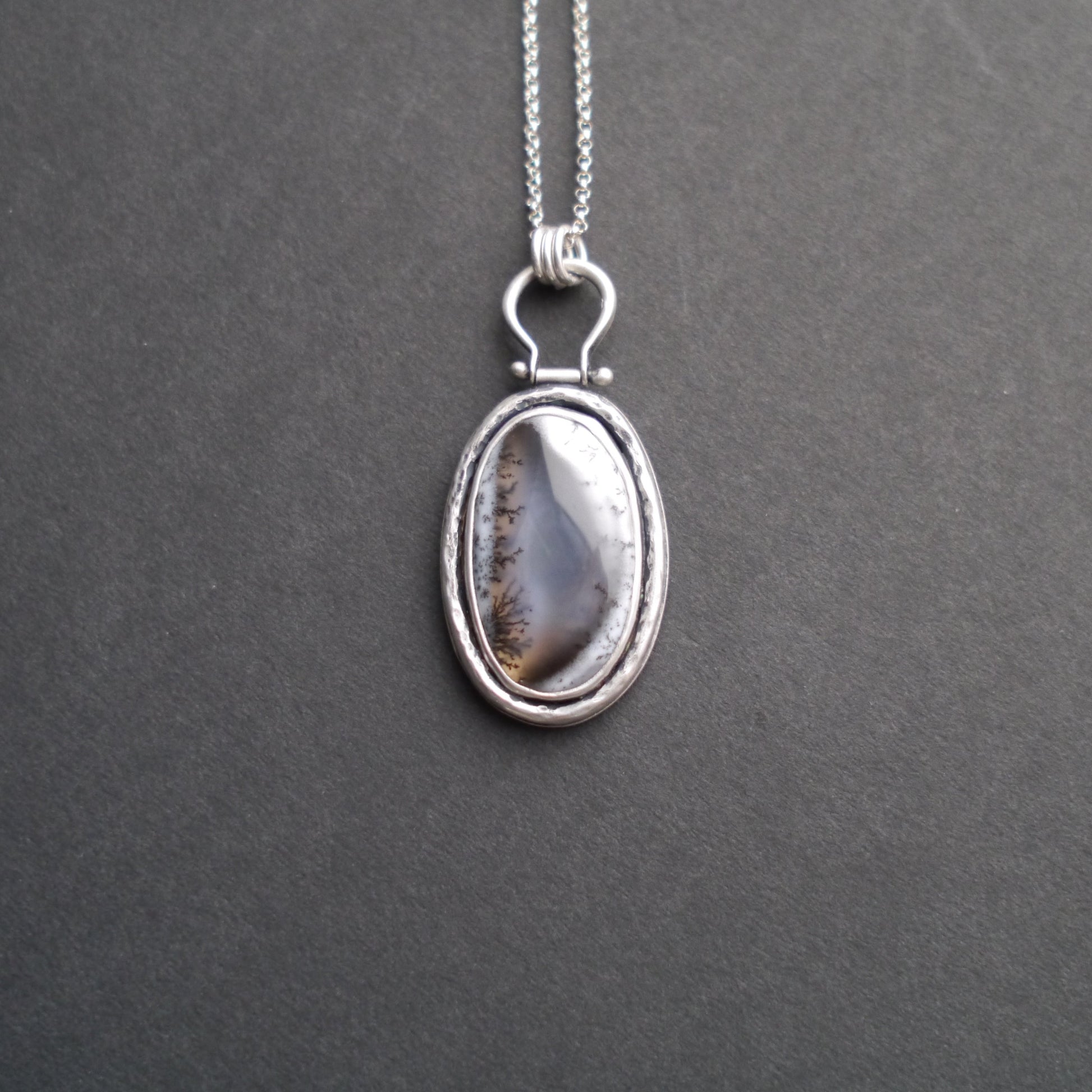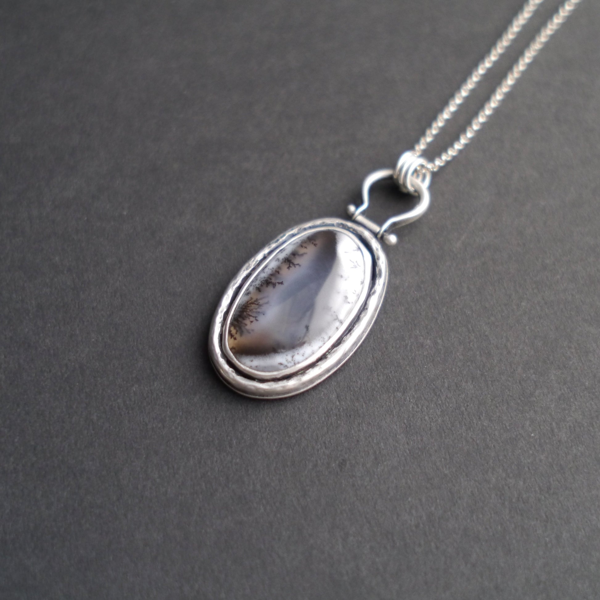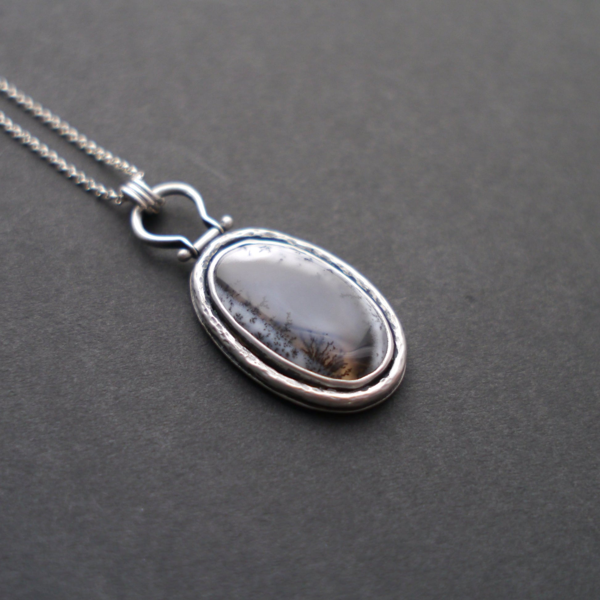 Embrace the quiet calm of winter with the Serene Snowfall Dendritic Opal Pendant, a limited-edition piece from our Winter 2024 collection. Handcrafted with care, this pendant features dendritic opal, showcasing its cool white hues and delicate grey-blue patterns, reminiscent of snow-covered landscapes and icy branches. The stone is set in sterling silver, creating a striking contrast against the pendant's antiqued frame.