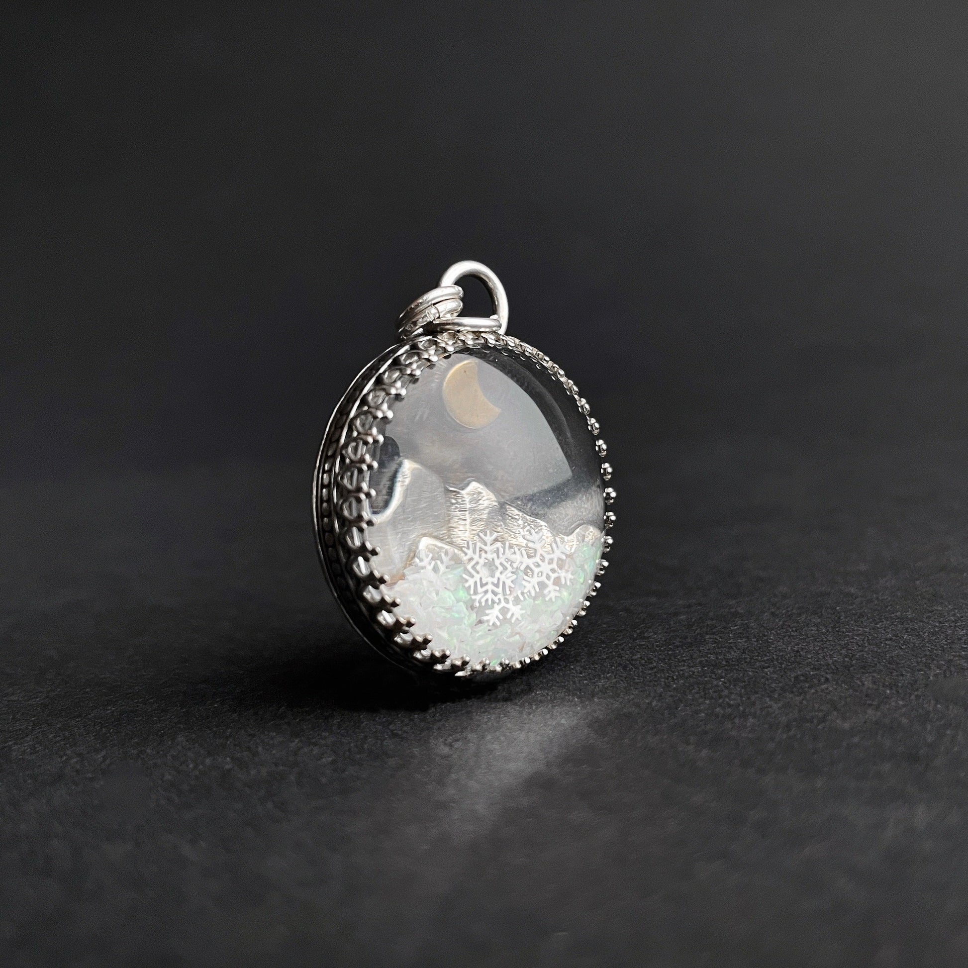 Step into a world of wonder with our Winter Solstice Snow Globe Pendant—a handcrafted masterpiece that echoes the charm of a snow globe and captures the serene beauty of a snowy mountain landscape.
