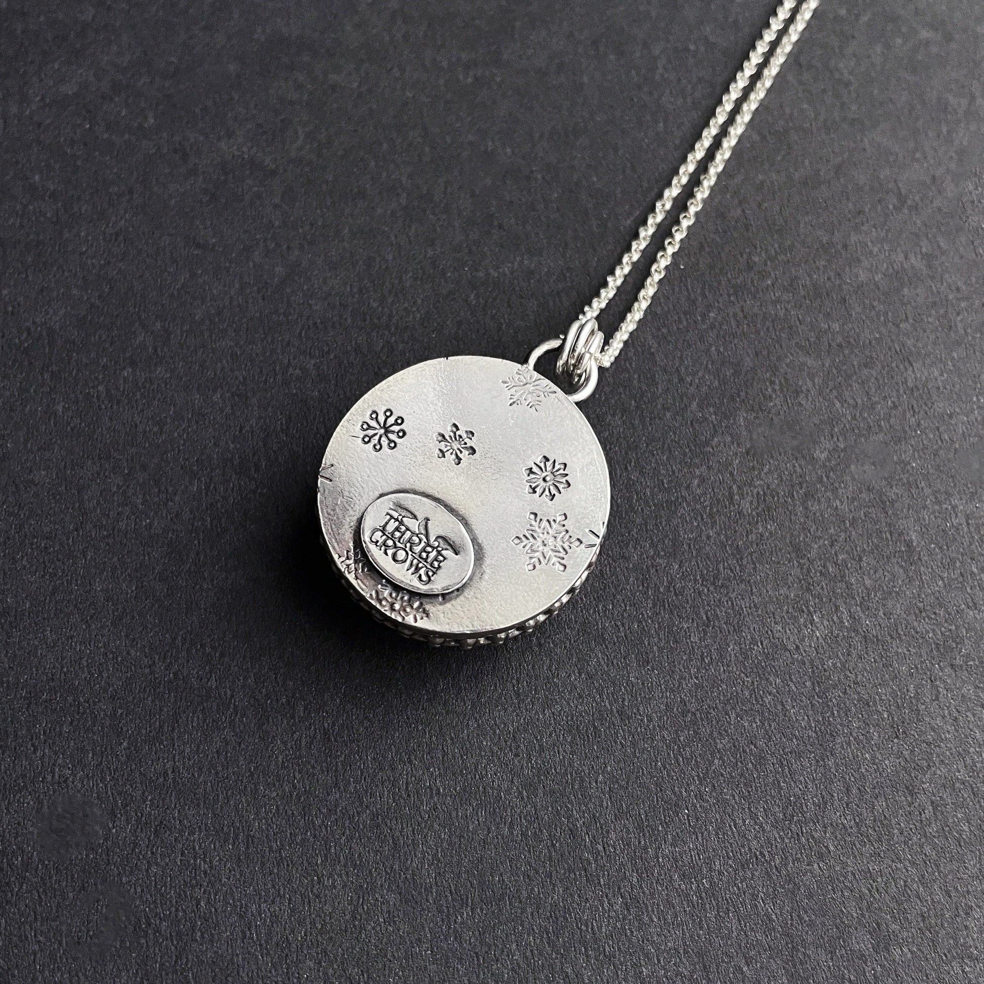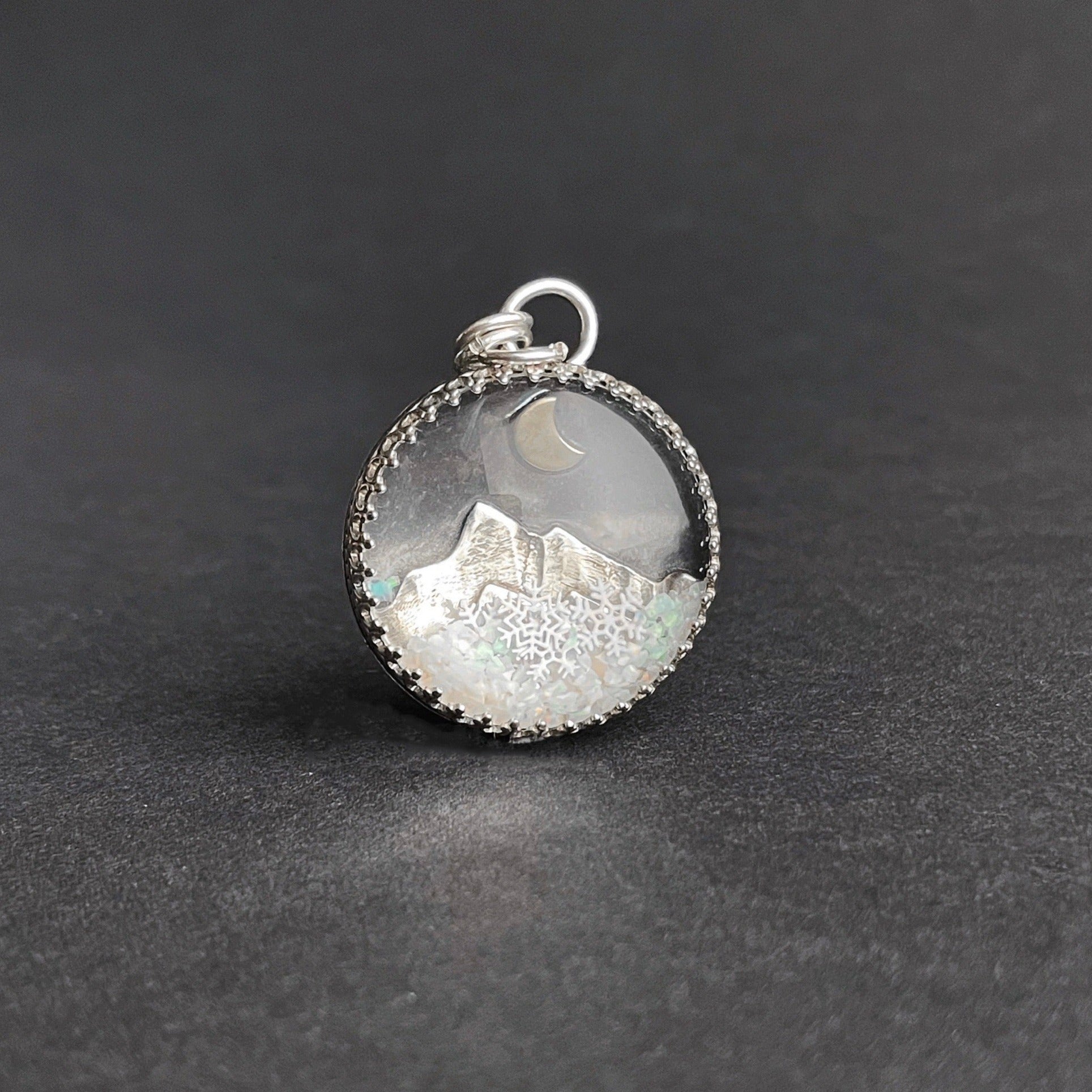 Crafted from sterling silver, this pendant is a wearable work of art, intricately designed to evoke the magic of a winter's night. The pendant is filled with crushed opal, creating a mesmerizing snowfall effect. This crushed opal imparts a captivating iridescence, shimmering with the subtle colors of a winter twilight.