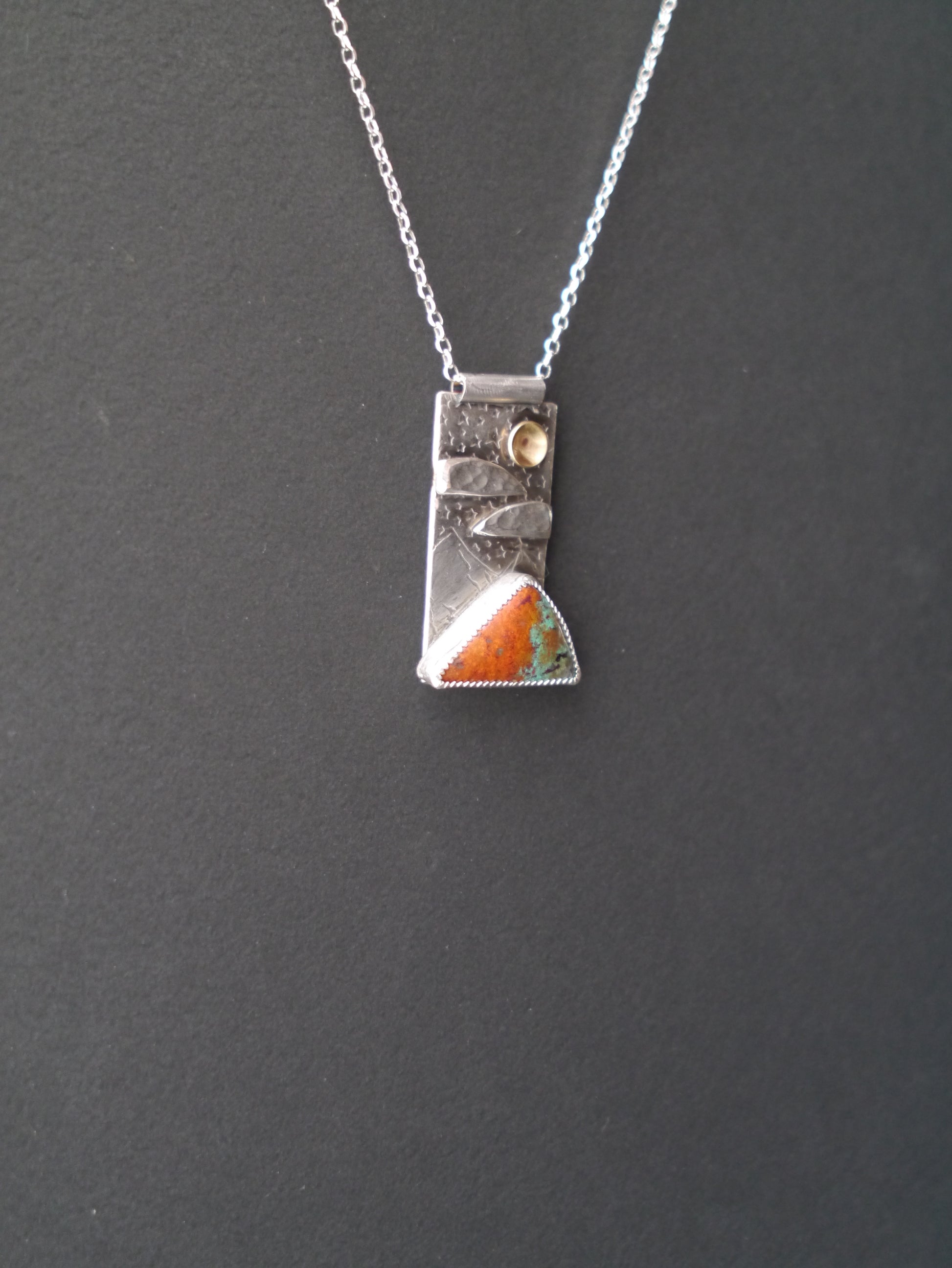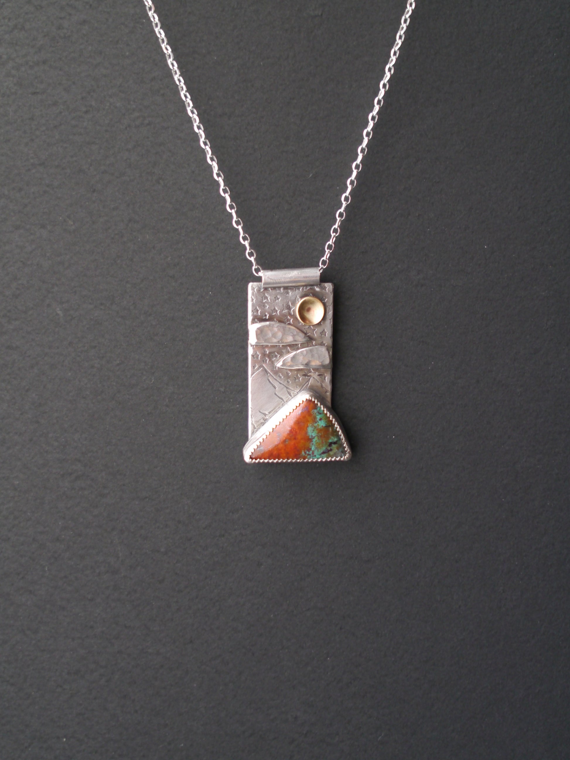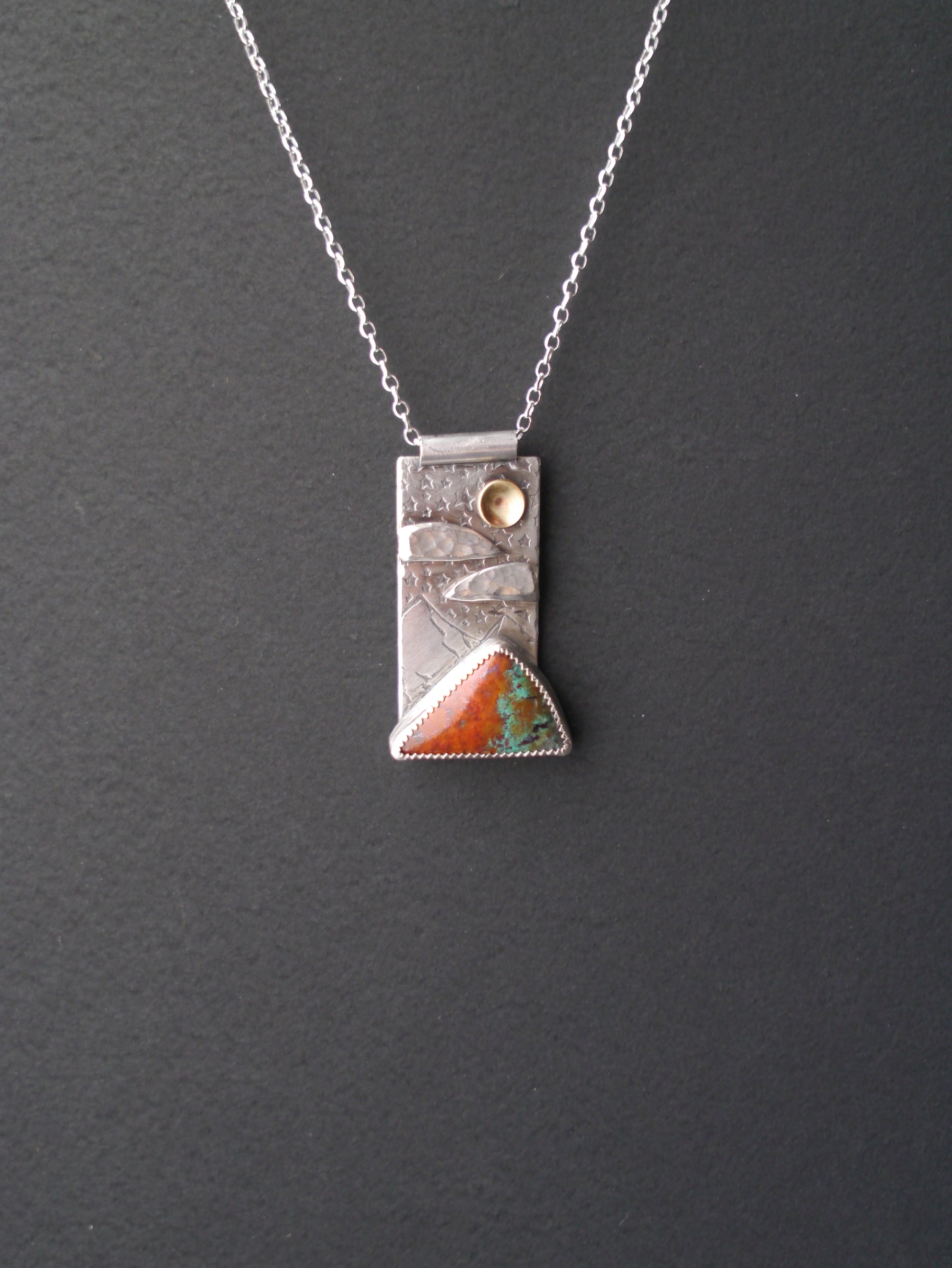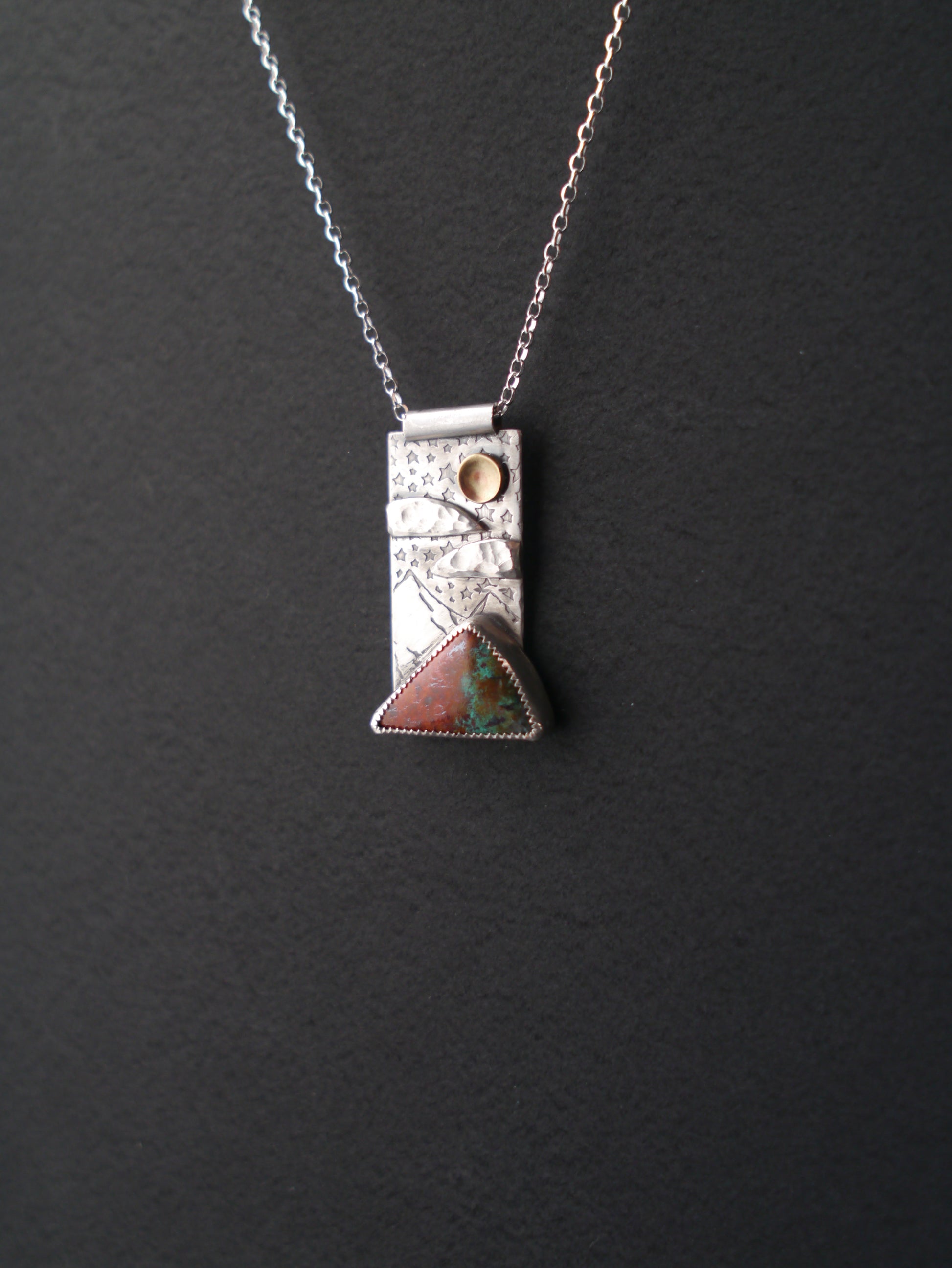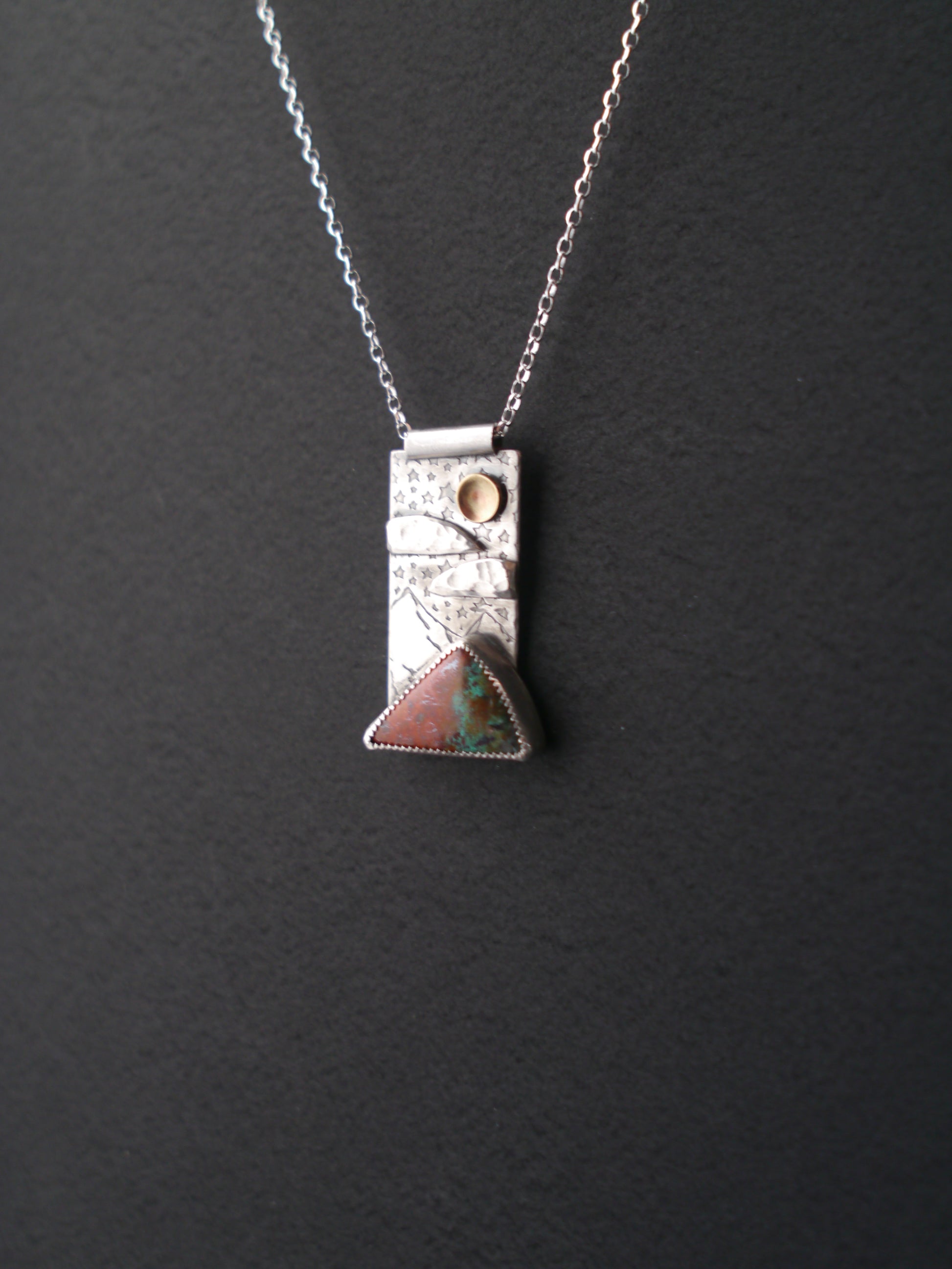 This handcrafted pendant from the Sonora Skies Collection layers texture and color to echo the quiet of the desert. At its center is a triangular Sonora Sunrise stone, hand-cut to highlight its deep red tones and soft touches of turquoise. Behind it, an embossed mountain range rises from the sterling silver backplate, framed by sculpted clouds and a glowing brass moon—adding depth and movement to the scene.