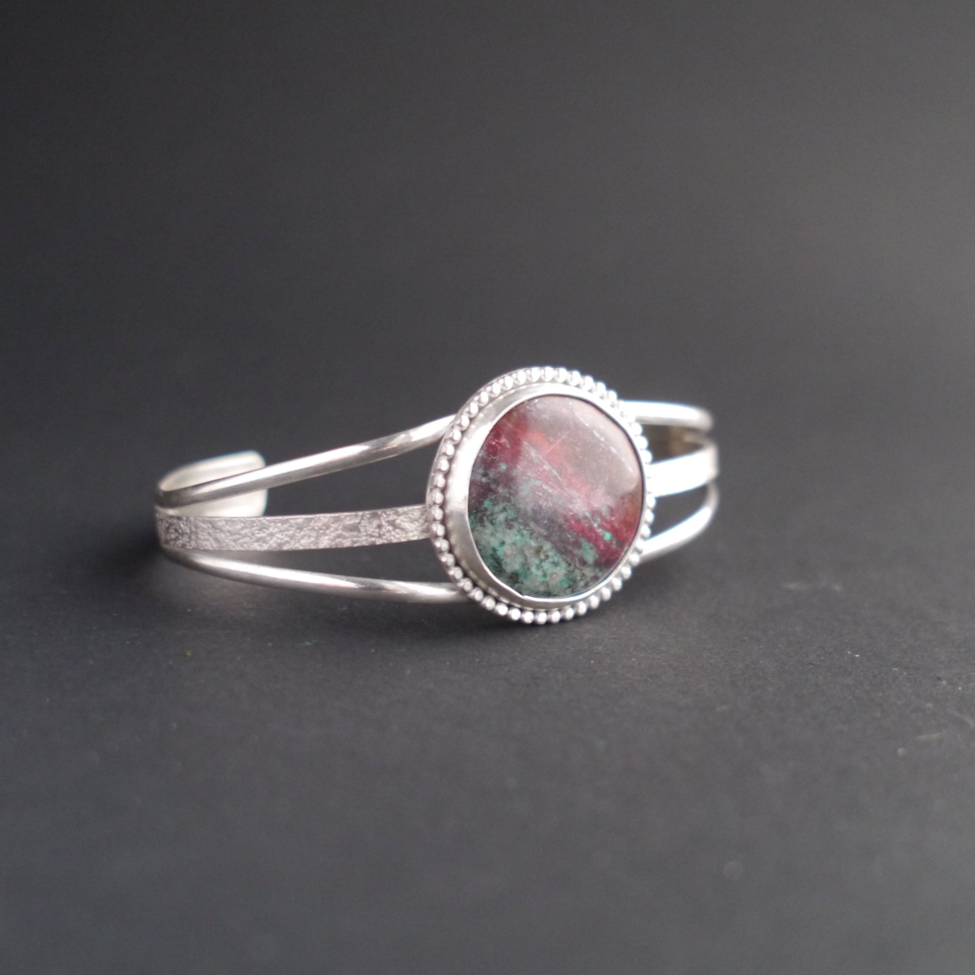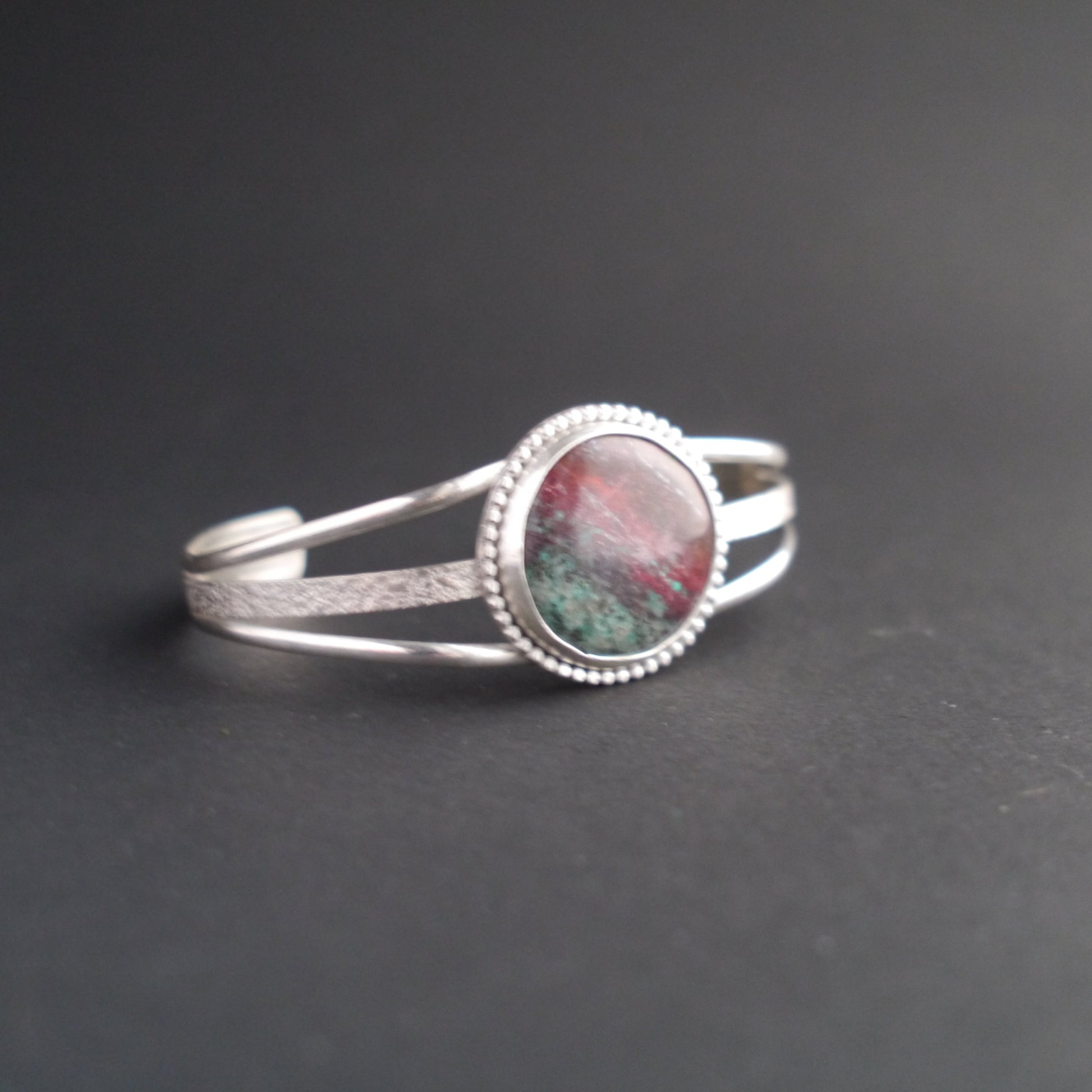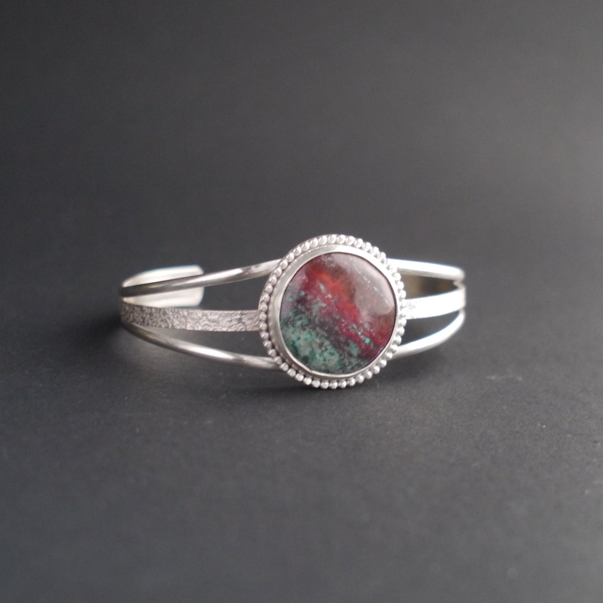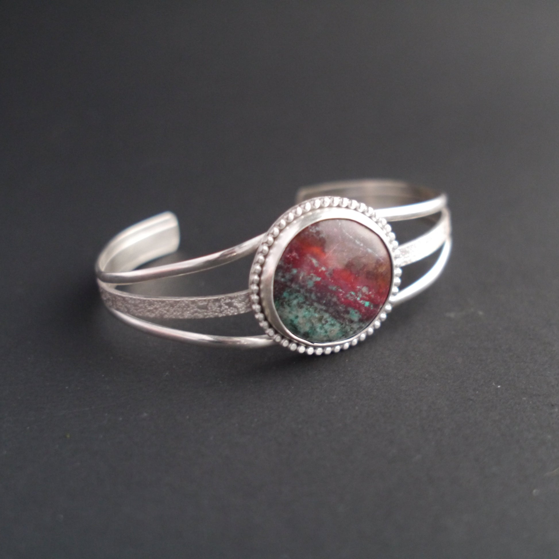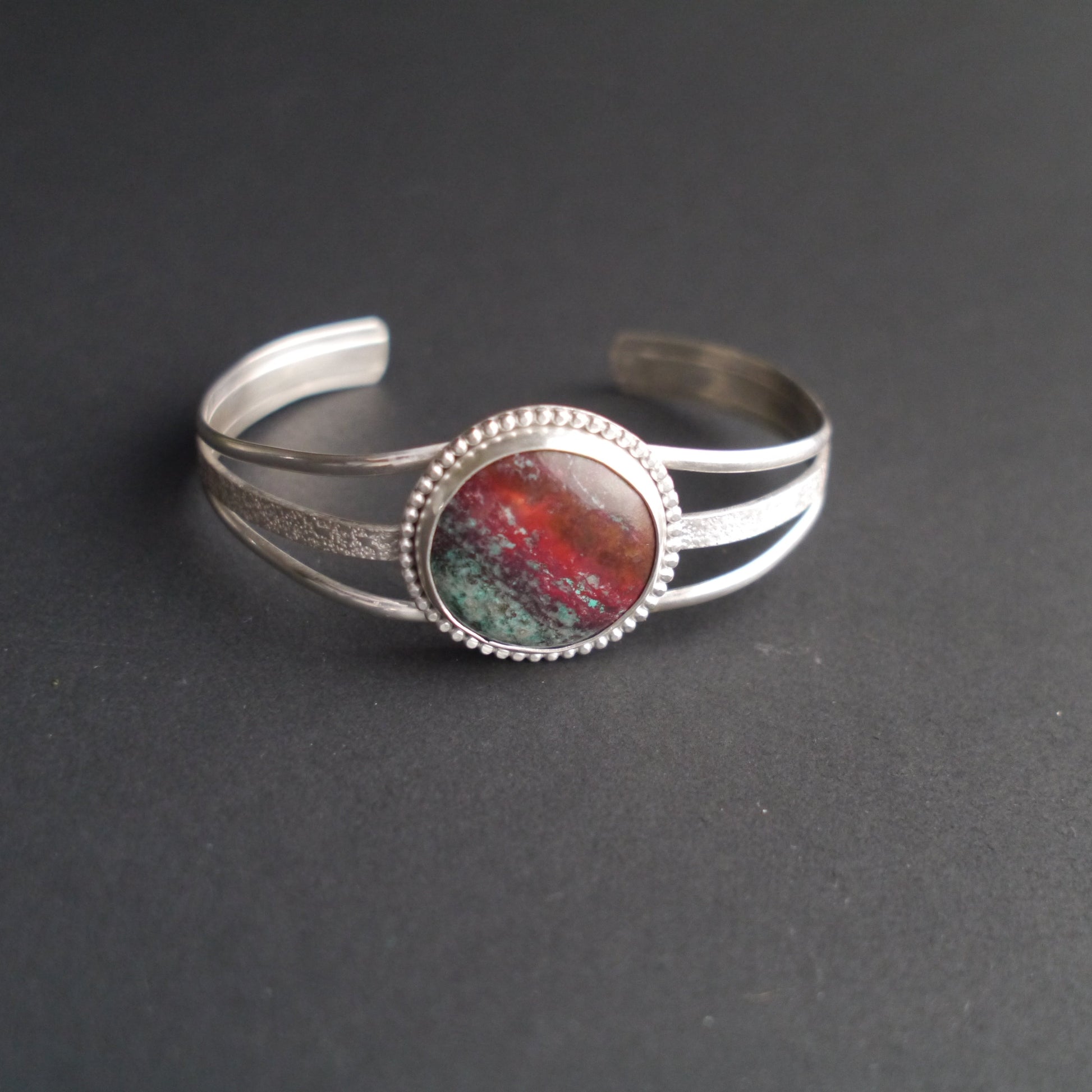 This handcrafted cuff from the Sonora Skies Collection captures the serene, poetic beauty of the desert. At its heart lies a round Sonora Sunrise stone, with deep red tones that gradually fade into calming turquoise greens—like the sun setting over canyon walls, casting shadows over desert pools.