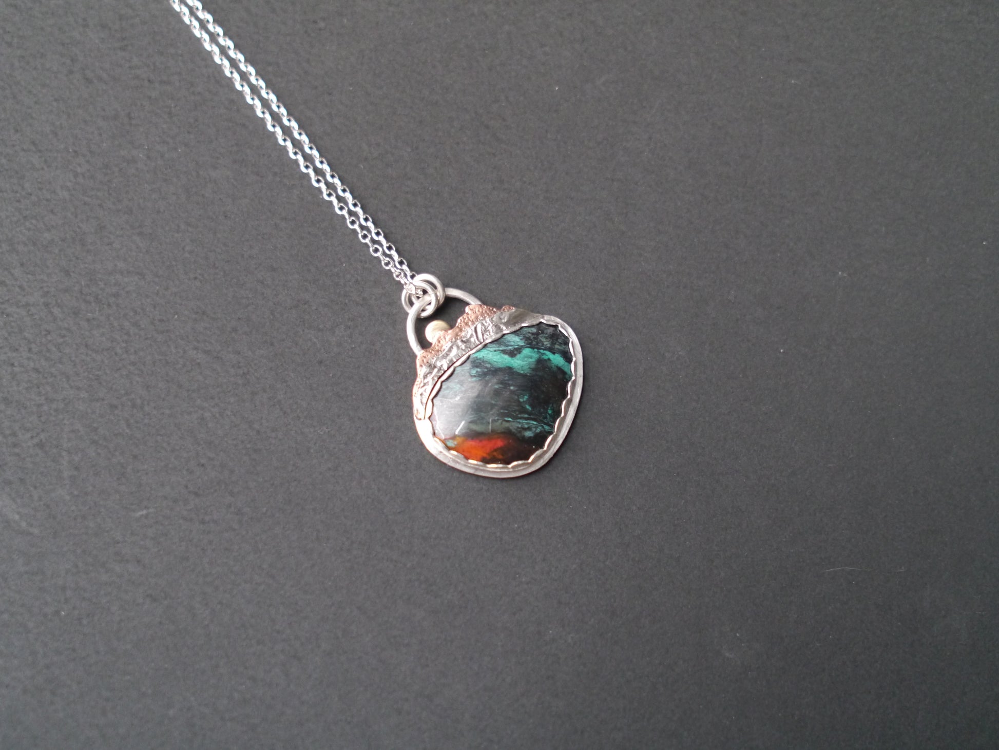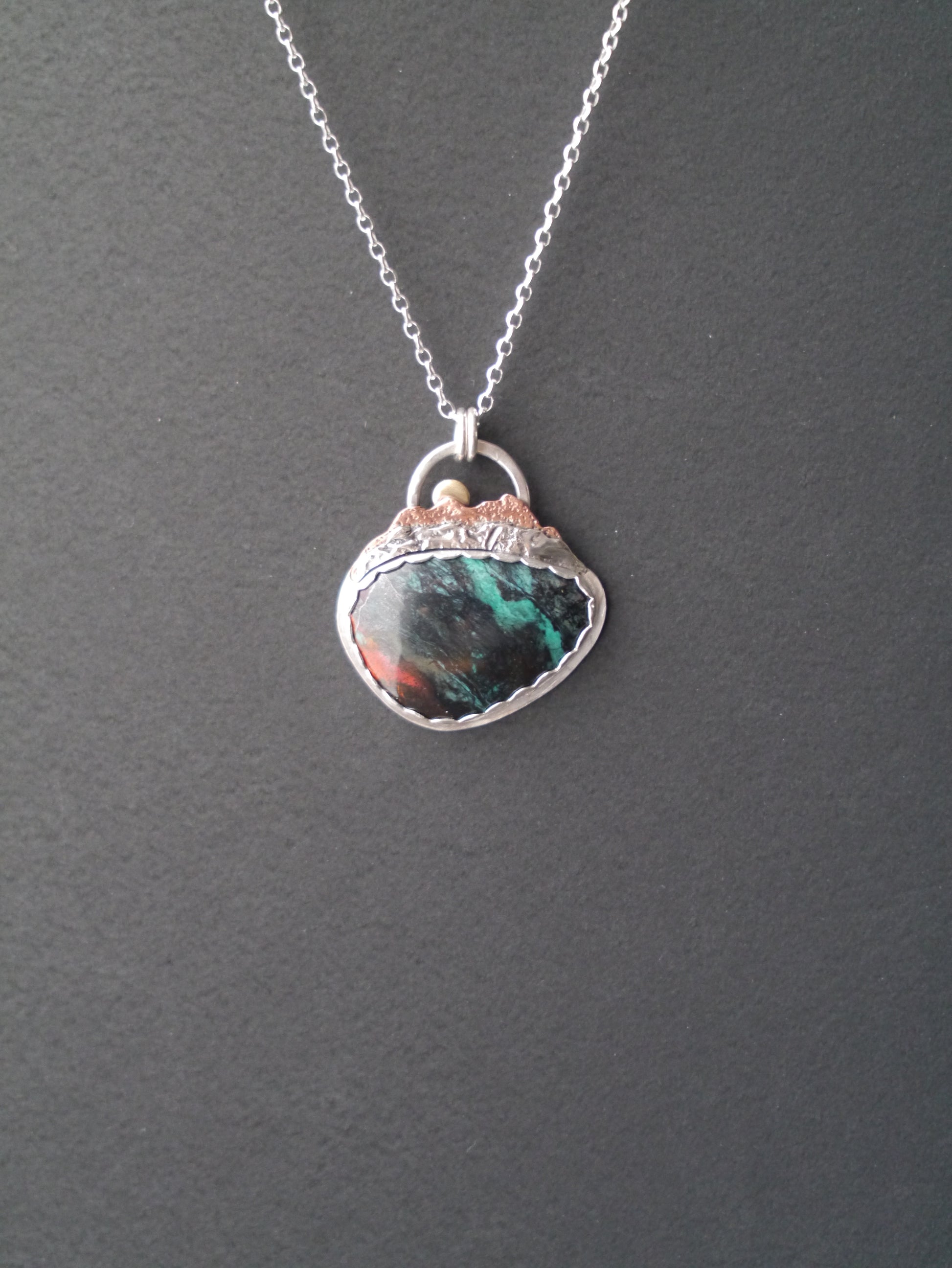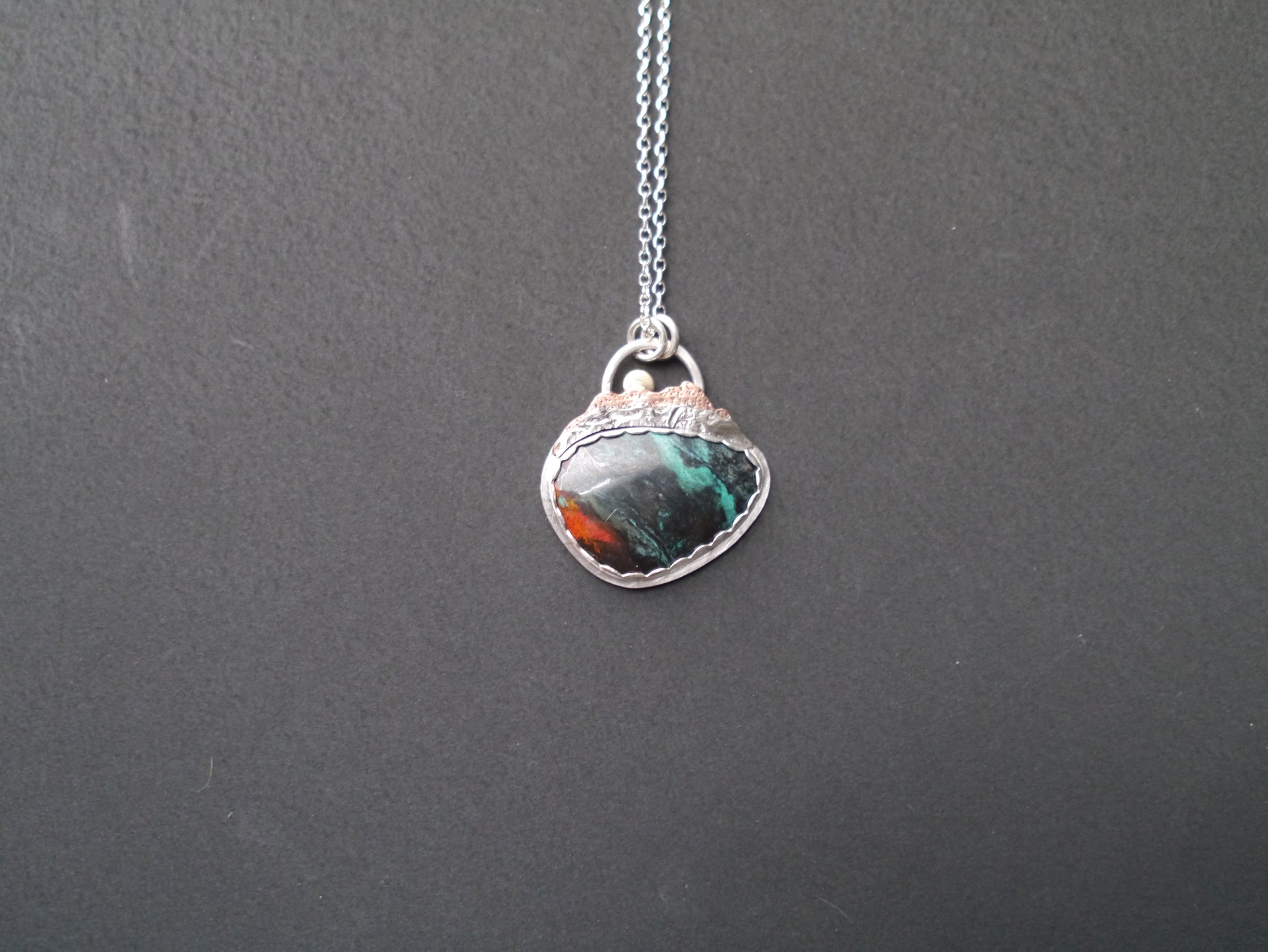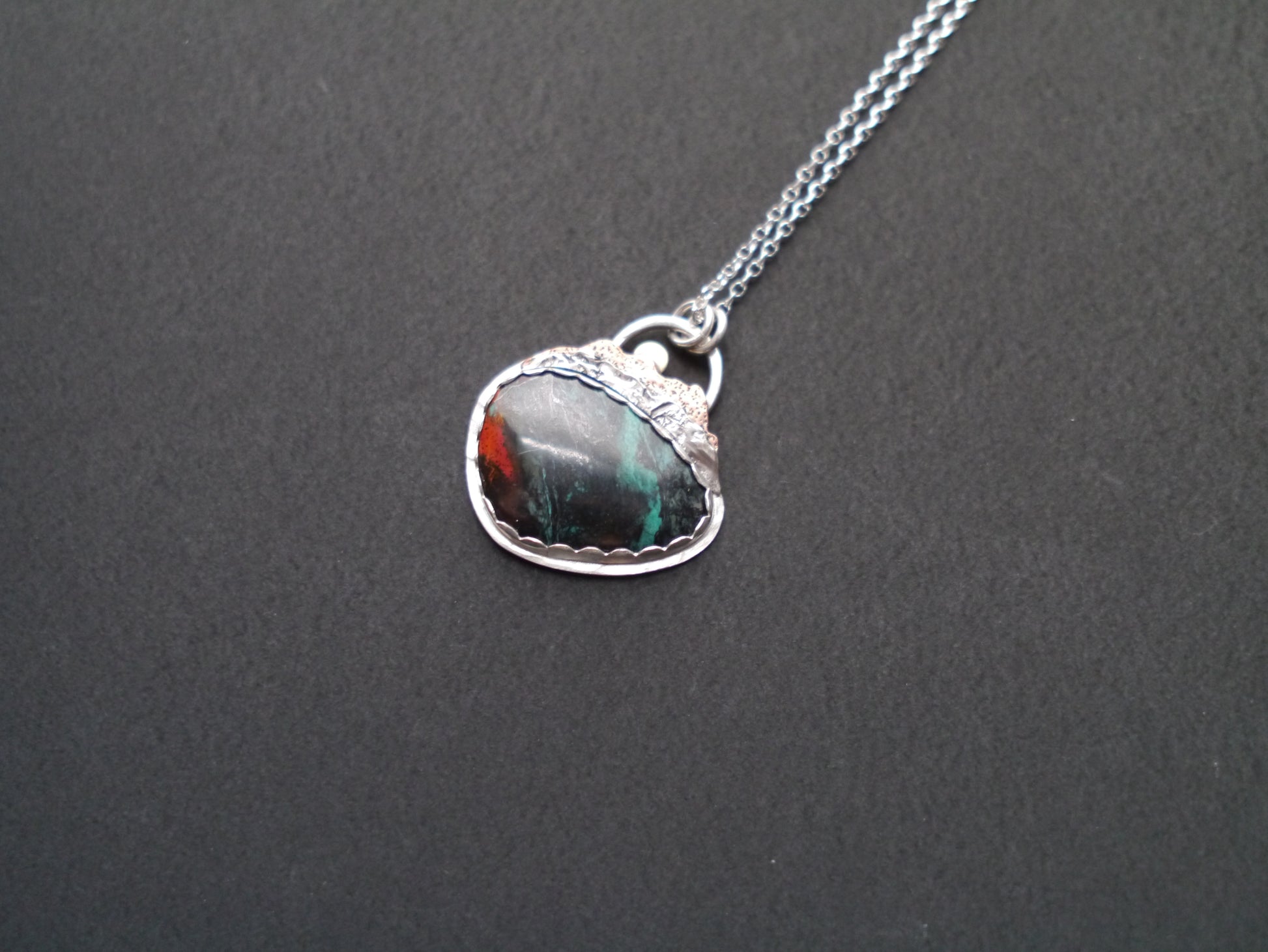 This handcrafted organic-shaped pendant from the Sonora Skies Collection is a tribute to the raw, untamed beauty of the high desert. At its center is a Sonora Sunrise stone, glowing with deep crimson and soft teal speckles—like a desert horizon shaped by wind, time, and ancient earth.