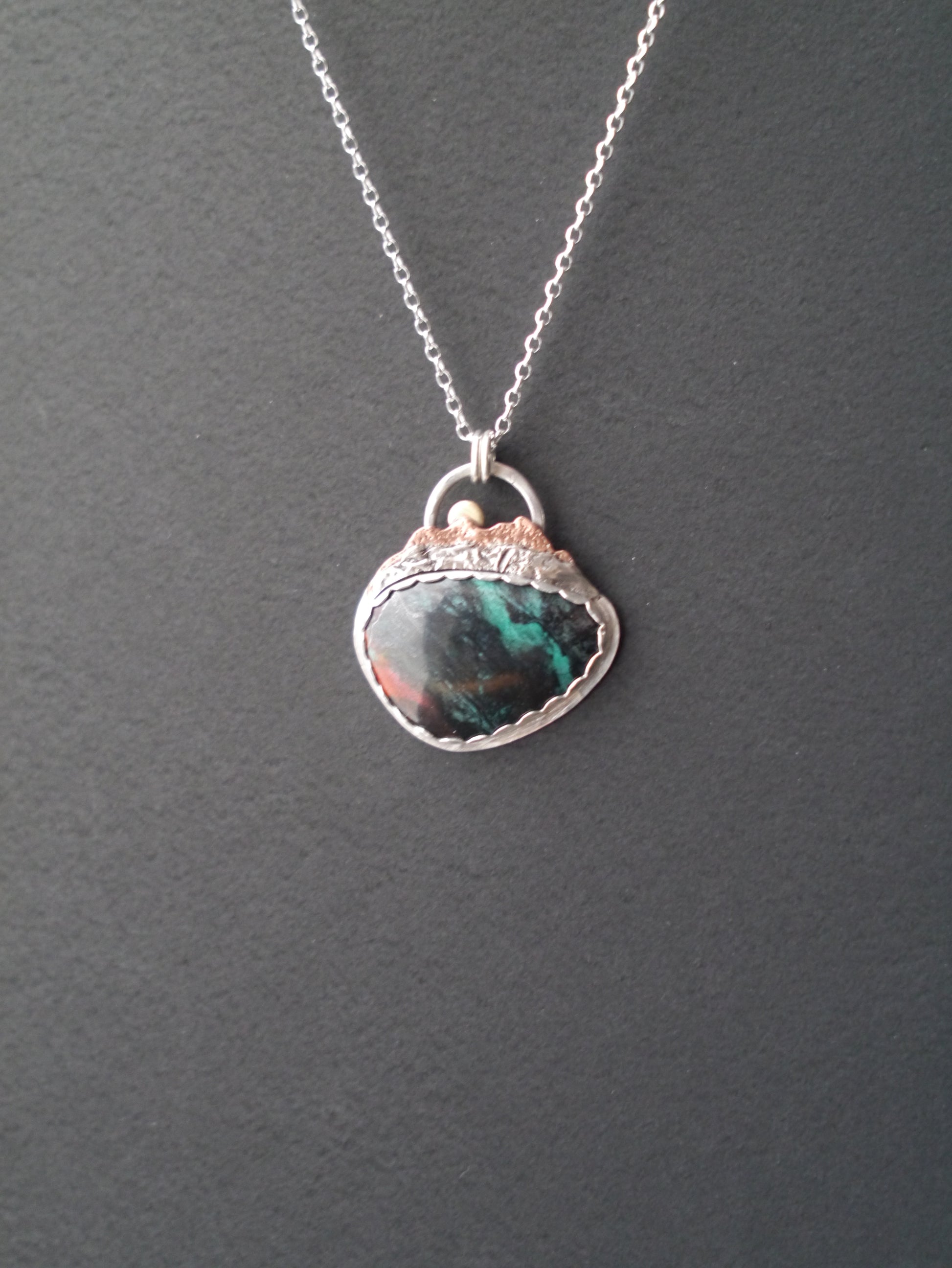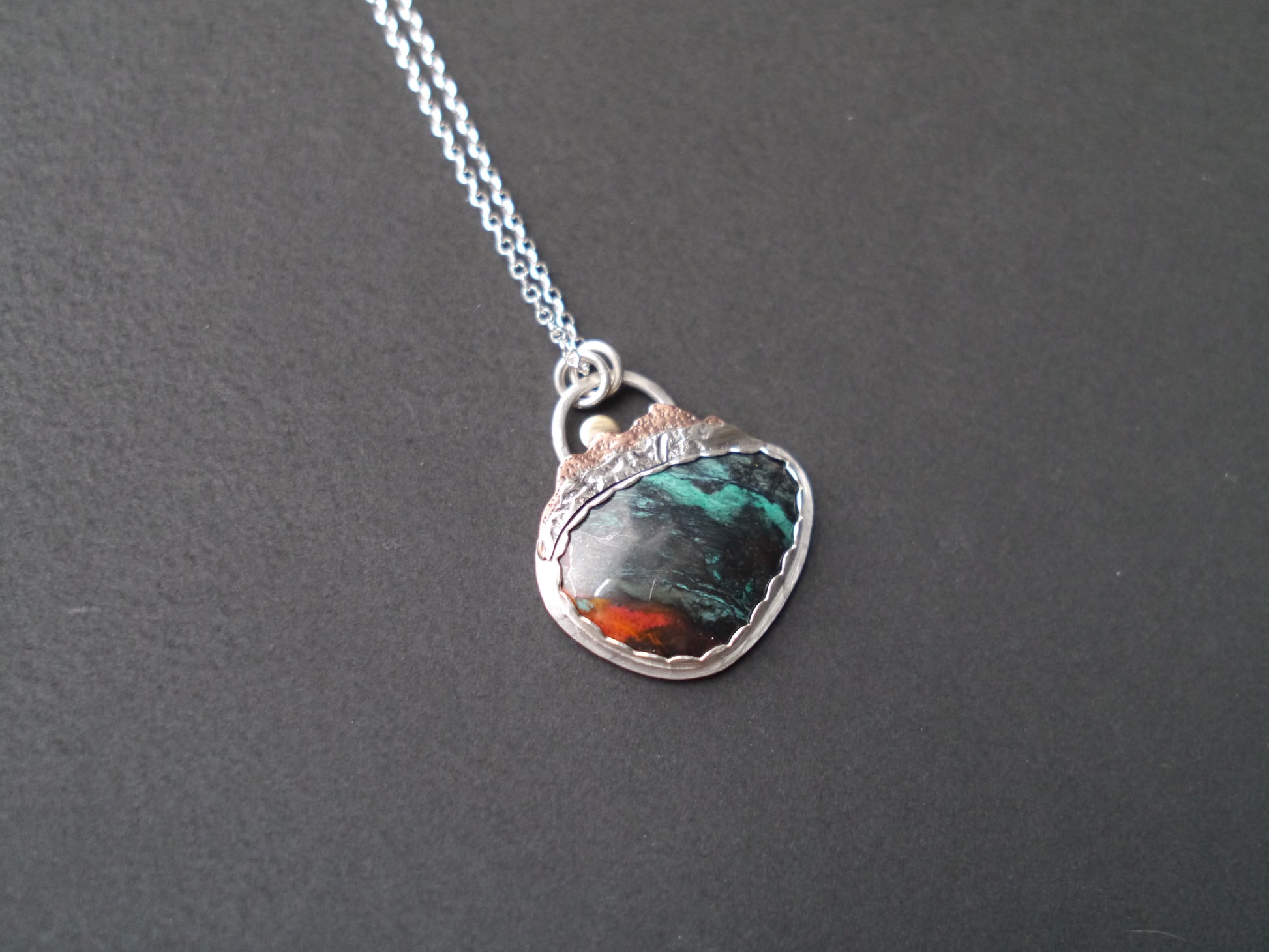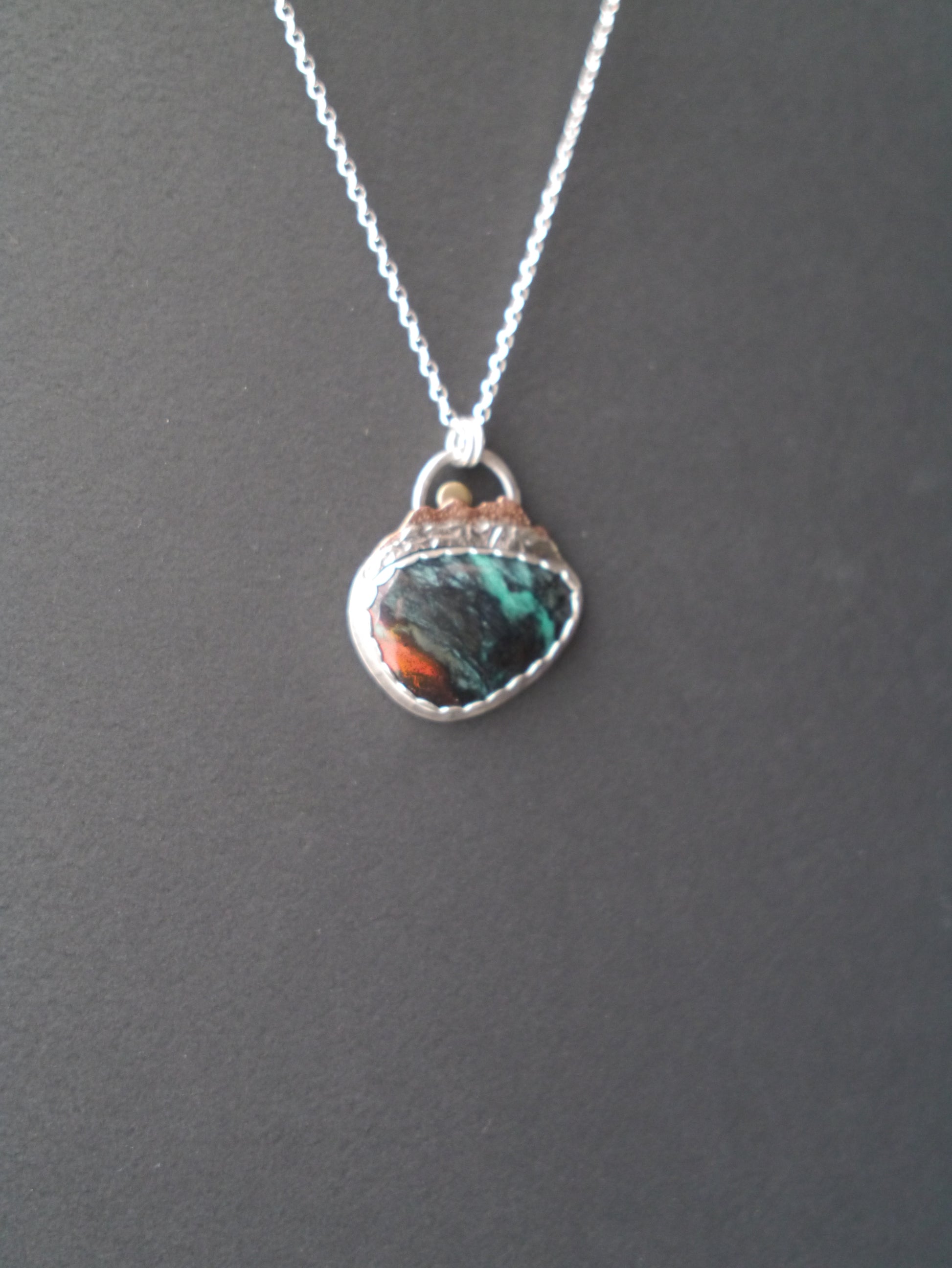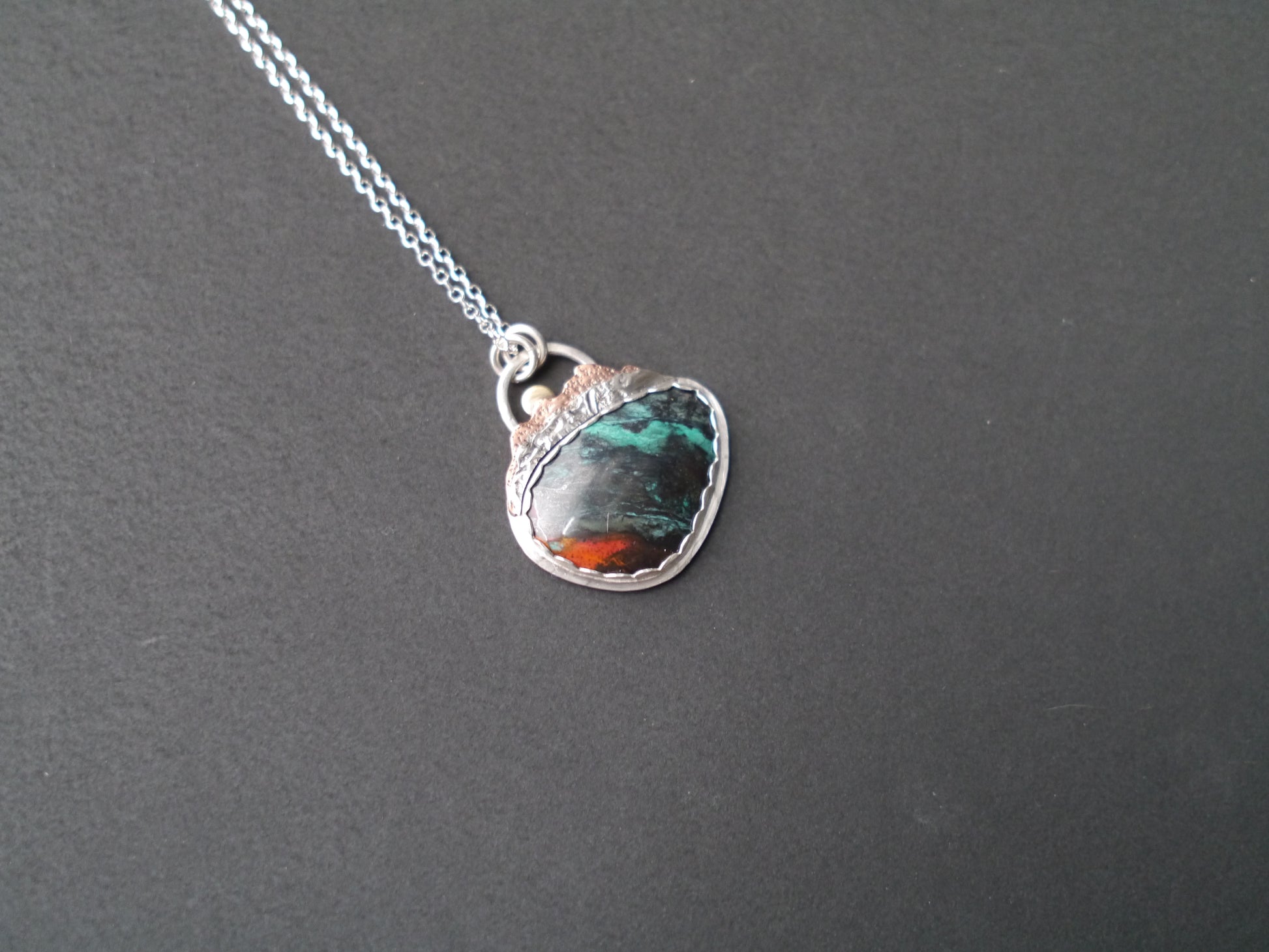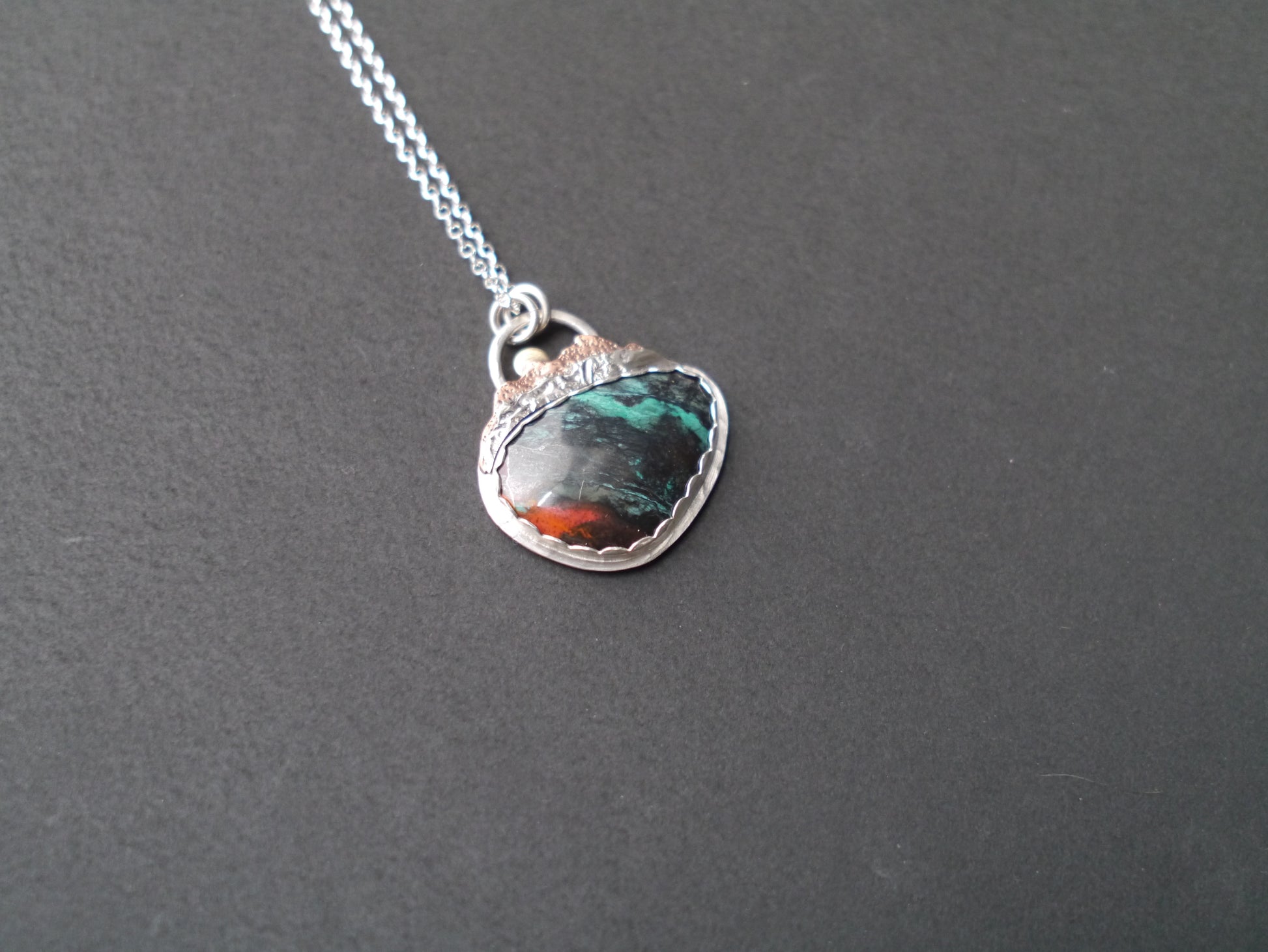 This handcrafted organic-shaped pendant from the Sonora Skies Collection is a tribute to the raw, untamed beauty of the high desert. At its center is a Sonora Sunrise stone, glowing with deep crimson and soft teal speckles—like a desert horizon shaped by wind, time, and ancient earth.