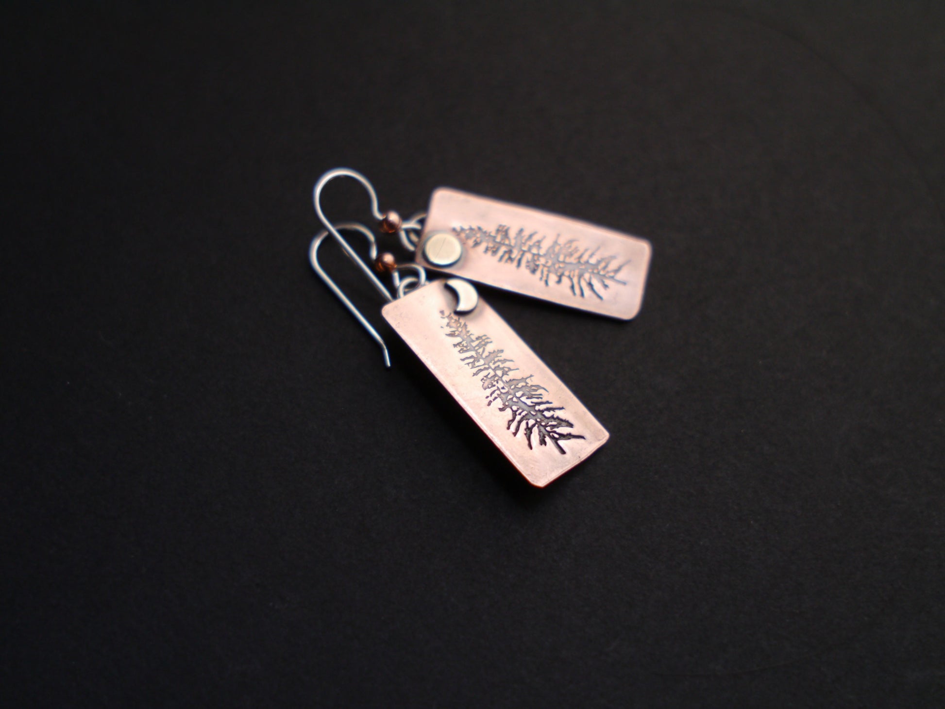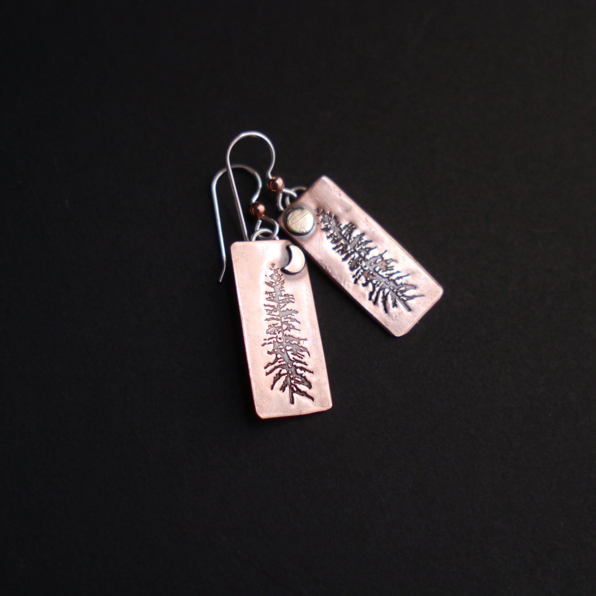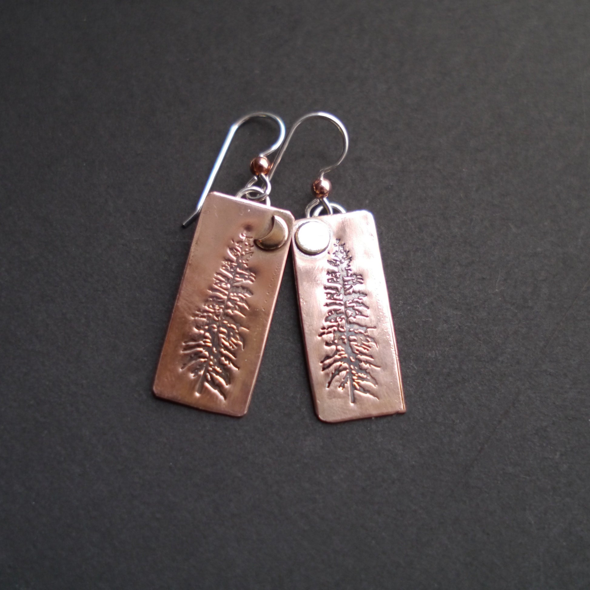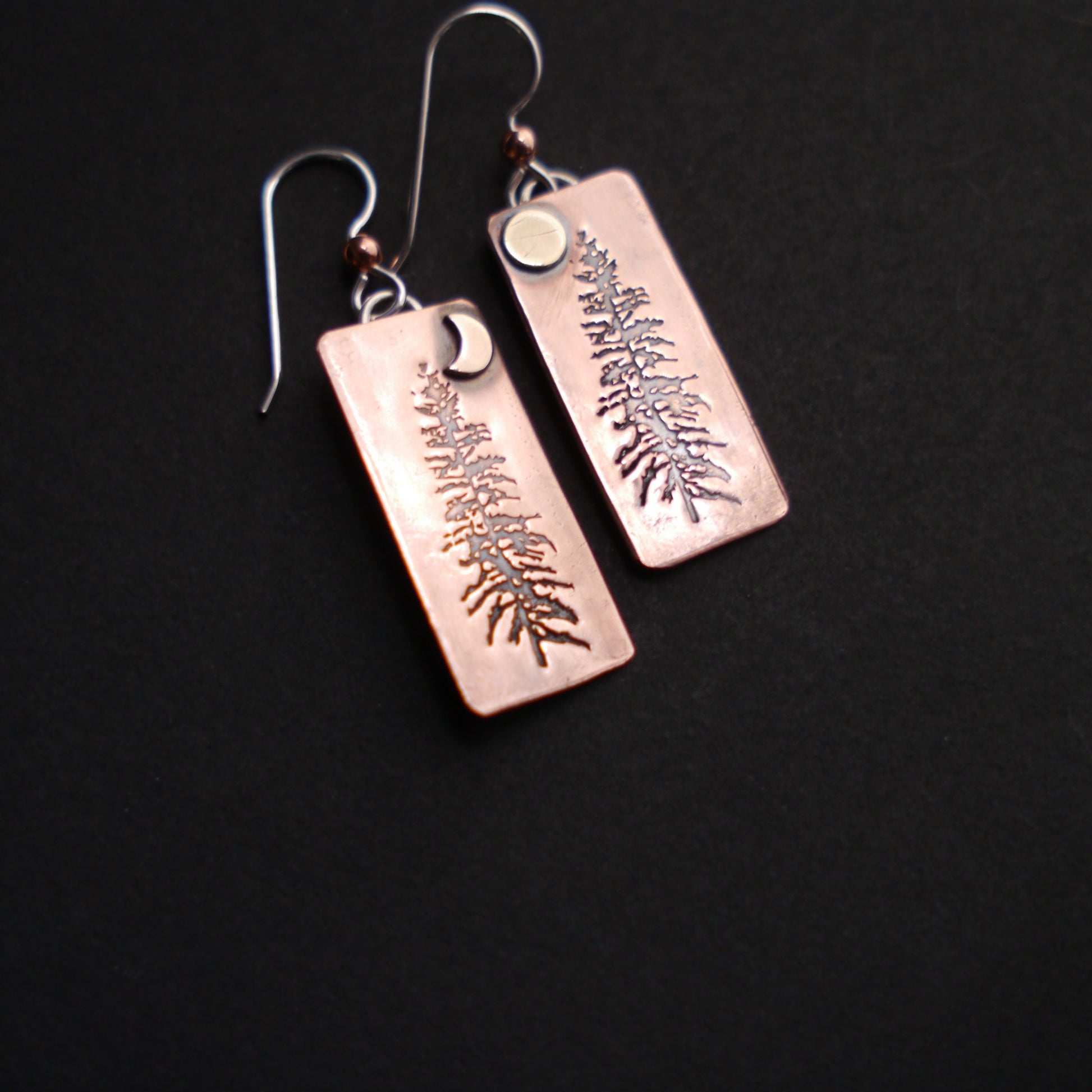 Majestic Tamarack pines are silhouetted against the glow of raw copper in these rustic and beautiful earrings. They are handcrafted from recycled copper and hang from sterling silver ear wires.