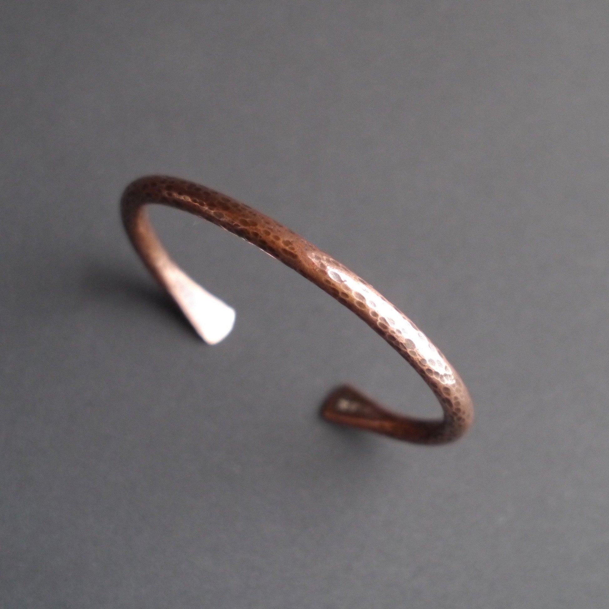 These thick rustic cuff bracelets are handcrafted to be comfortable and stylish for any gender. They are hand-forged from heavy 4 gauge recycled copper wire, measuring approximately 5mm in diameter, and will adjust slightly to achieve the perfect fit. Each cuff is finished with a hammered texture which is accentuated with an antique patina. The warm glow of copper compliments any style and combines with our other copper cuff styles or stacking!