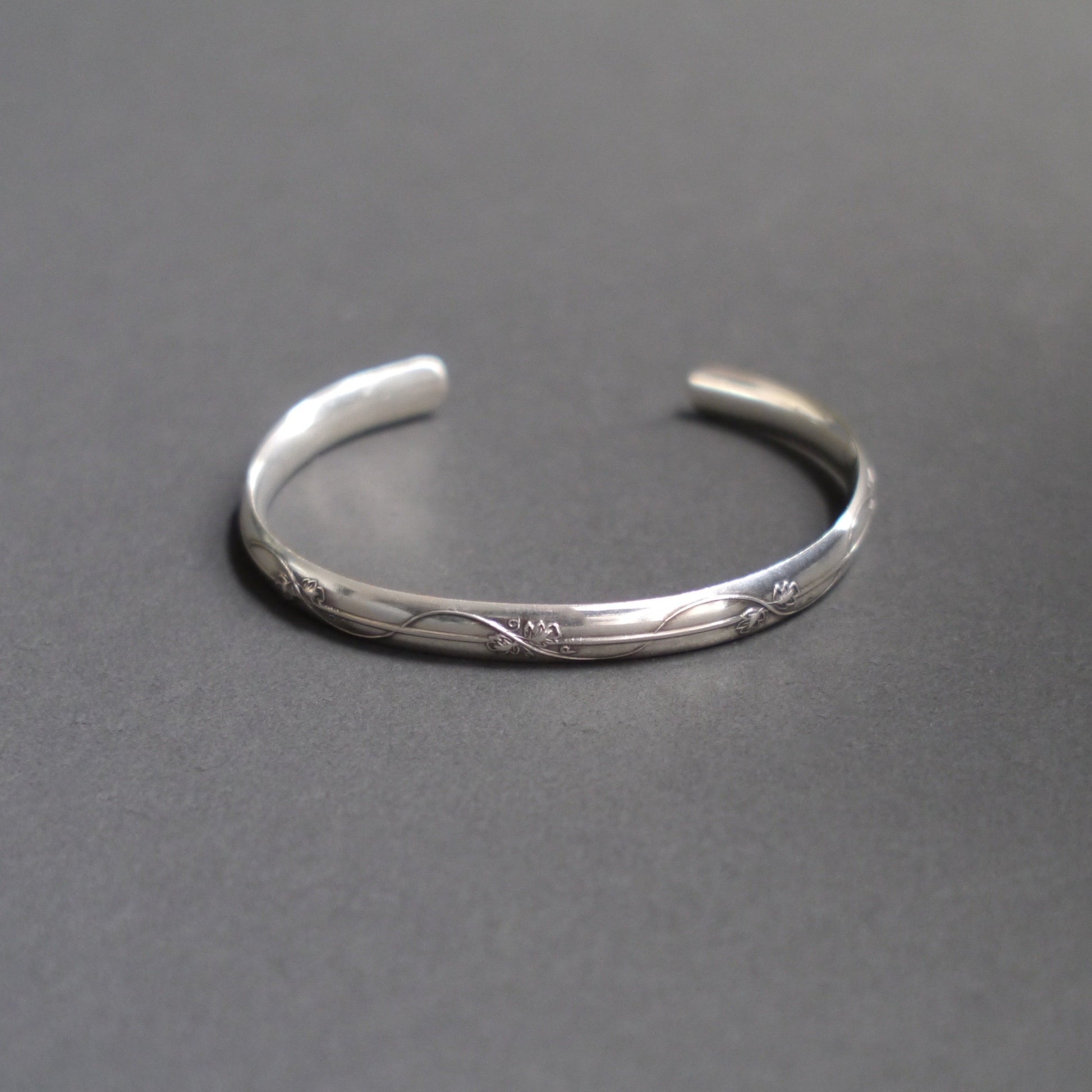 This timeless sterling silver cuff is embellished with a delicate floral vine pattern and lightly antiqued to emphasize the pattern. This thick cuff has a slightly curved interior, making it extremely comfortable. It is handcrafted from recycled sterling silver, measuring 6mm wide and 3mm thick. Cuffs are mildly adjustable and can be tightened slightly to fit comfortably.