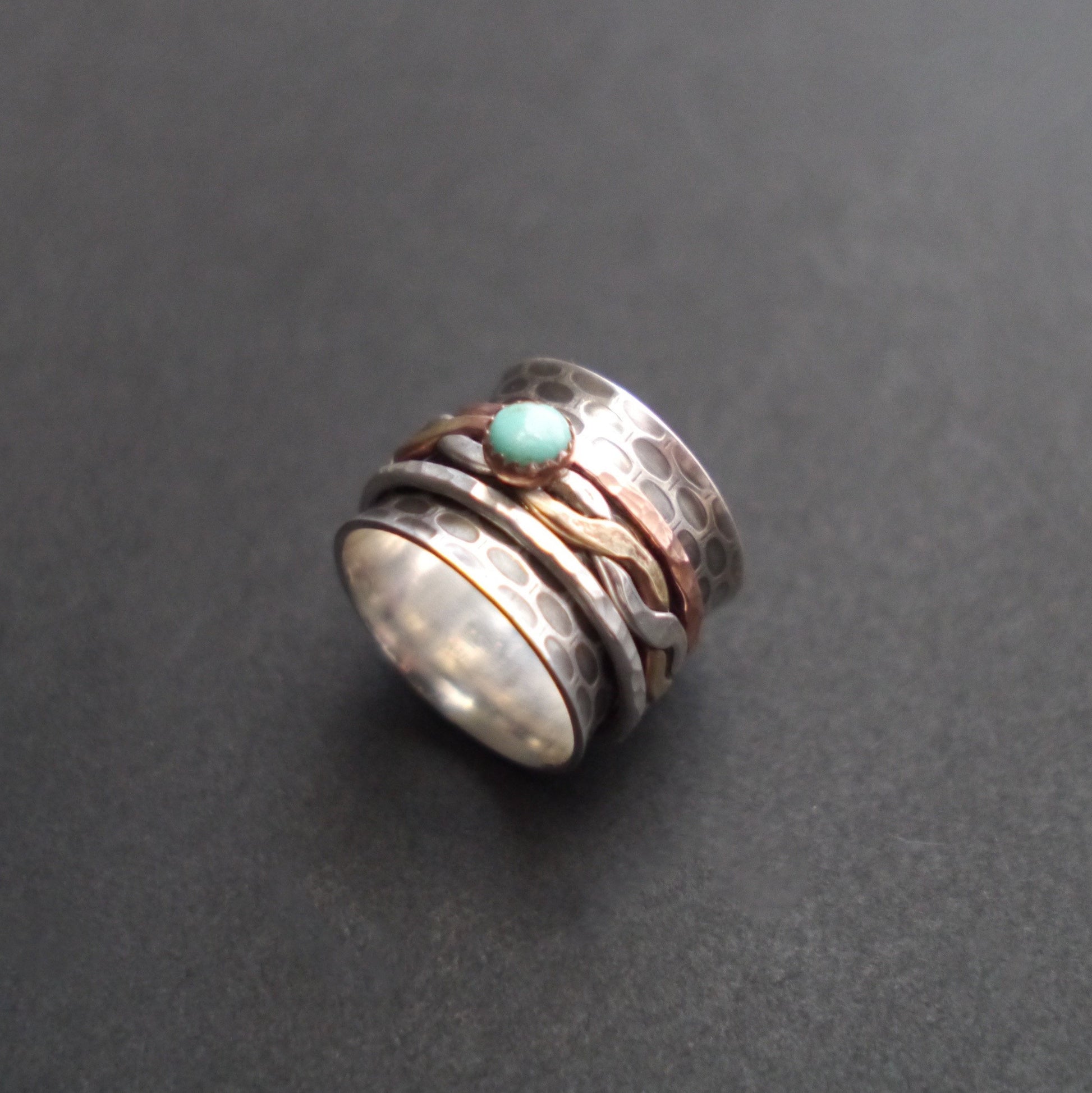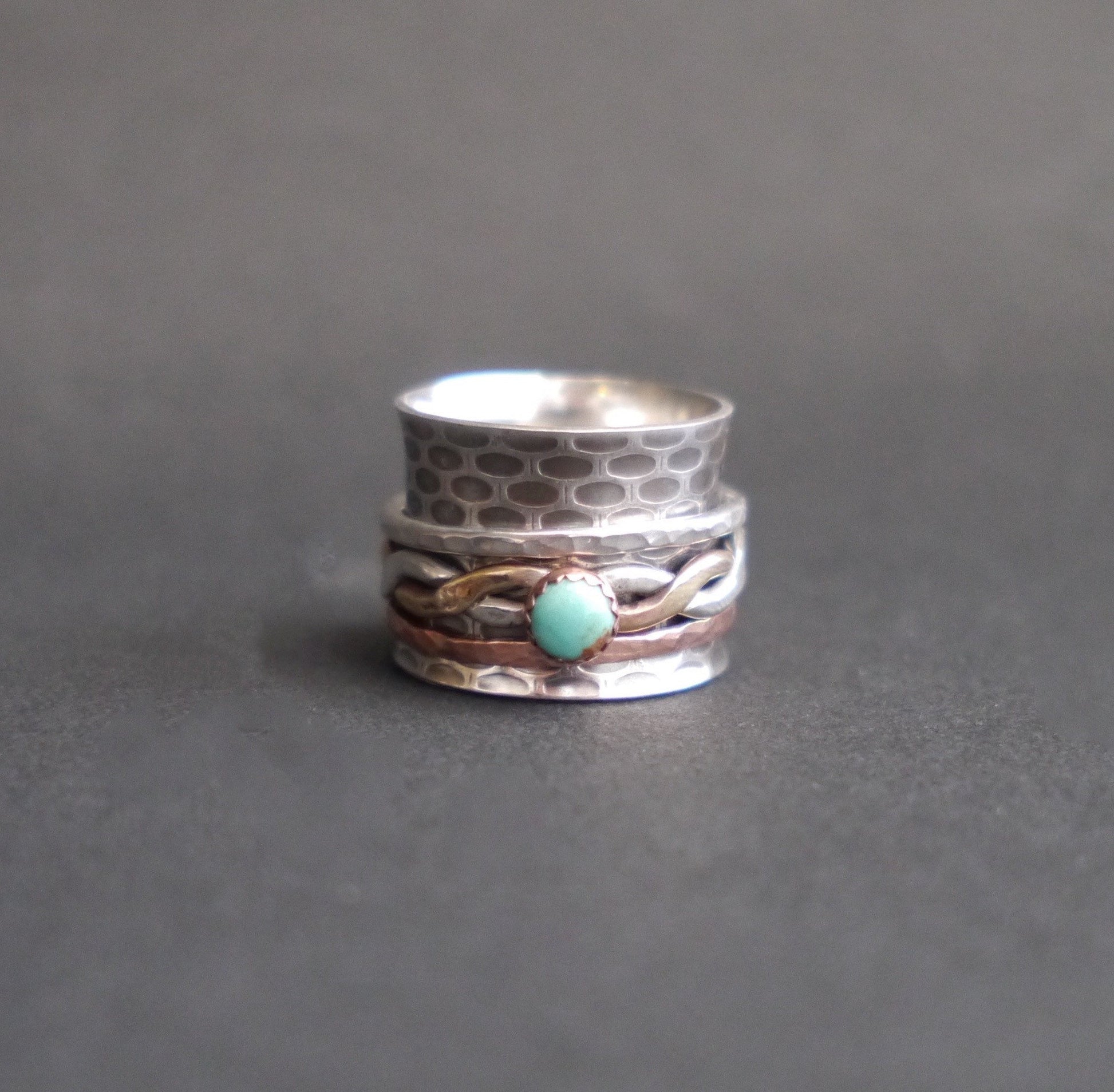 In this handcrafted mixed metal spinner ring, two 1mm hammered rings, one sterling and one copper flank a 4mm band of twisted sterling silver and jeweler’s brass. These rings spin upon a spooled band of mill textured sterling silver. The 16mm wide band bears a geometric texture and the twisted ring is embellished with a 4mm turquoise stone. This ring is size 7.
