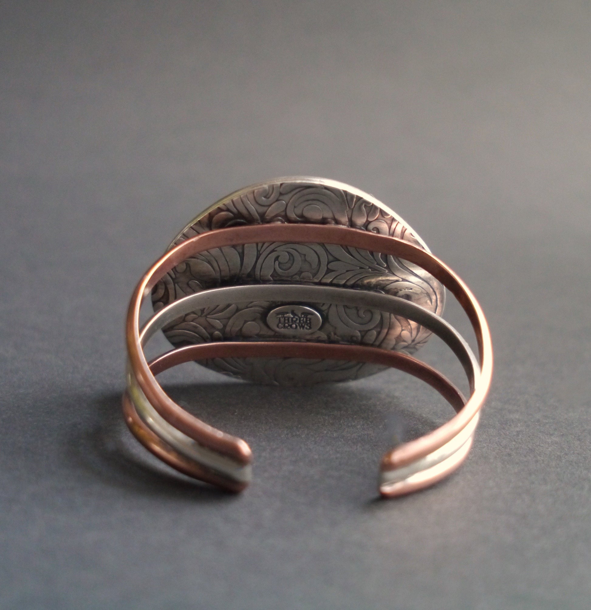 This handcrafted bracelet from the Wanderer Collection features a beautiful large Cripple Creek picture jasper landscape. Like windows into other worlds, these naturally occurring jaspers form layers resembling painted desert and mountain scenes. The stone was mined and cut in the U.S., then is set in fine silver, framed with a decorative recycled sterling silver beaded border and antiqued to emphasize the details. The recycled sterling backplate features a small logo mark.