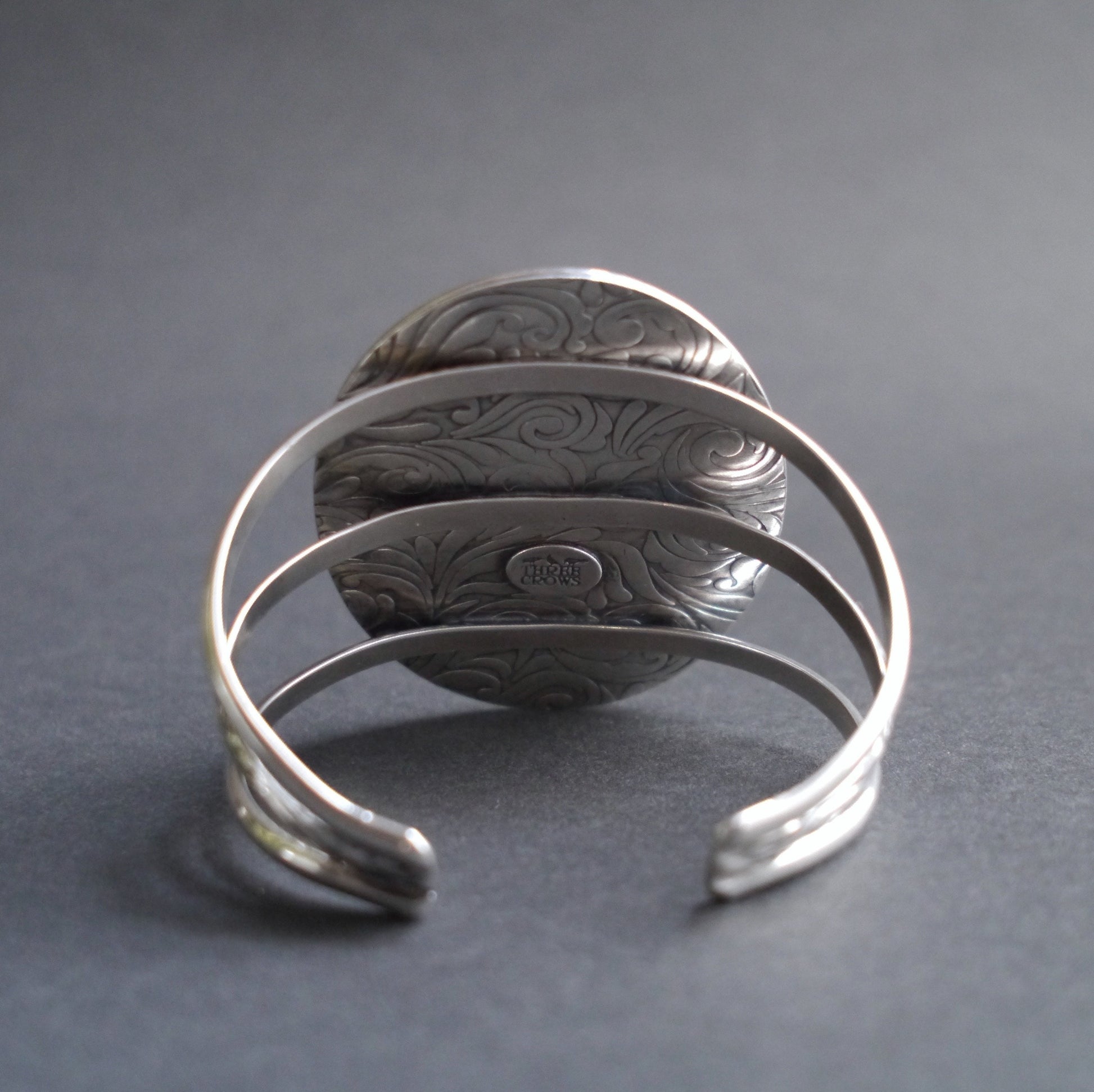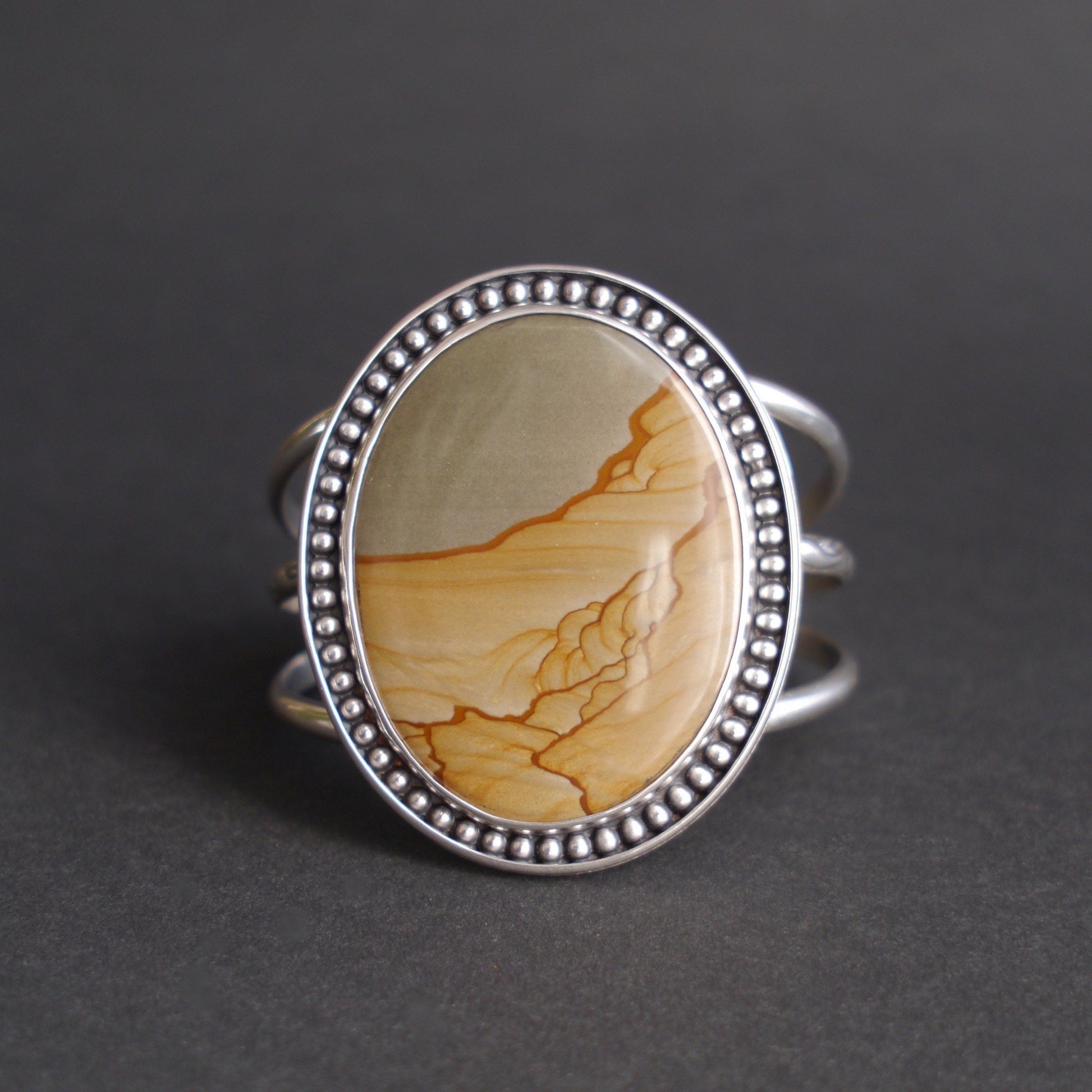 This handcrafted bracelet from the Wanderer Collection features a beautiful large Cripple Creek picture jasper landscape. Like windows into other worlds, these naturally occurring jaspers form layers resembling painted desert and mountain scenes. The stone was mined and cut in the U.S., then is set in fine silver, framed with a decorative recycled sterling silver beaded border and antiqued to emphasize the details. The recycled sterling backplate features a small logo mark.