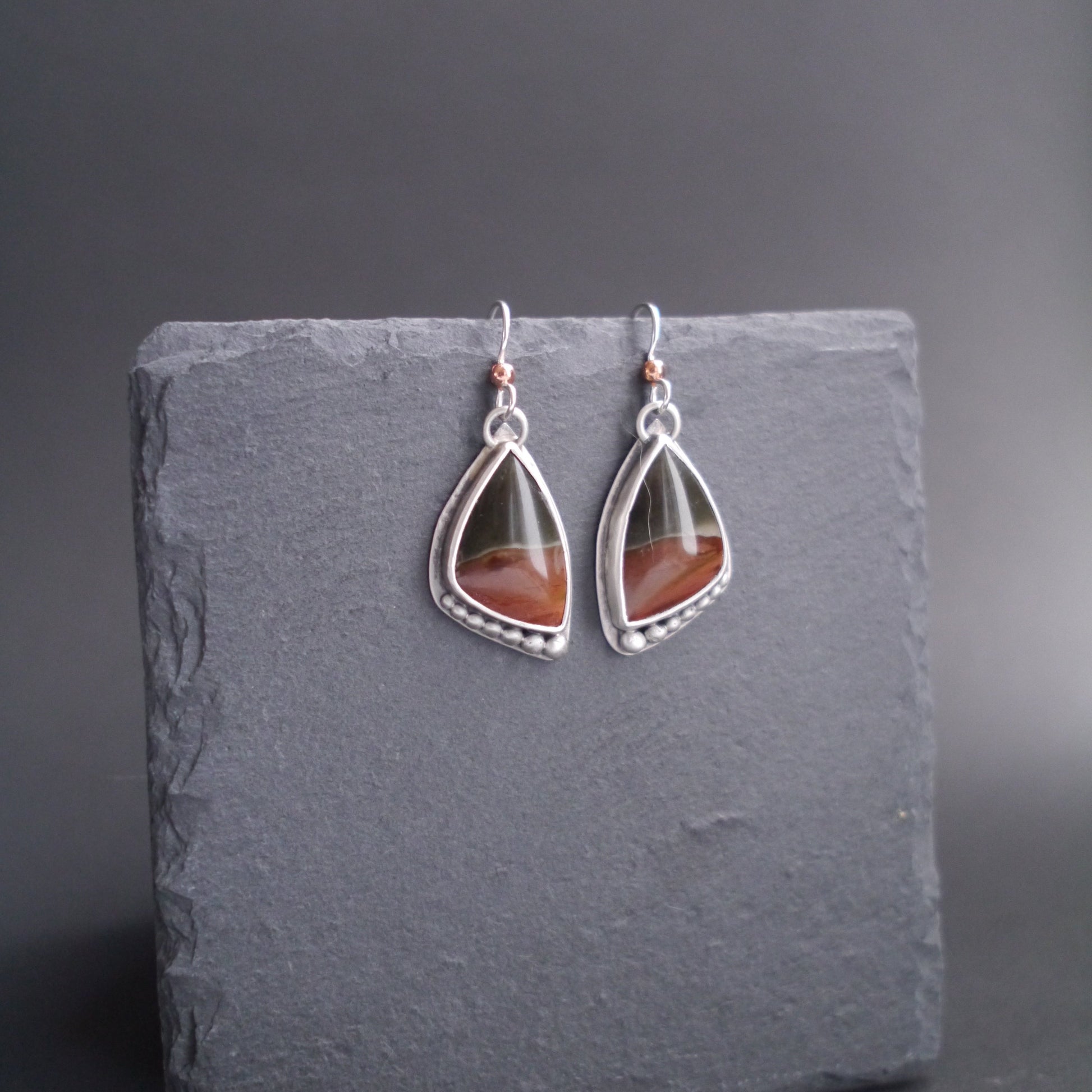 At the heart of these earrings is a matched set of polychrome jasper gemstones. These natural stones form stunning layers that resemble painted desert and mountain scenes, each telling a story of the earth's artistry. Our polychrome jasper is ethically sourced from Madagascar and hand cut by local lapidaries.