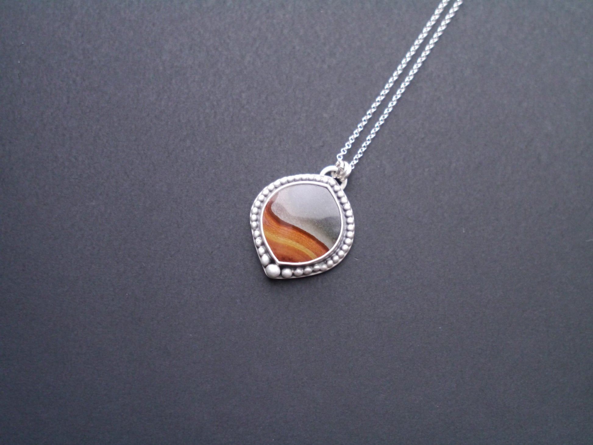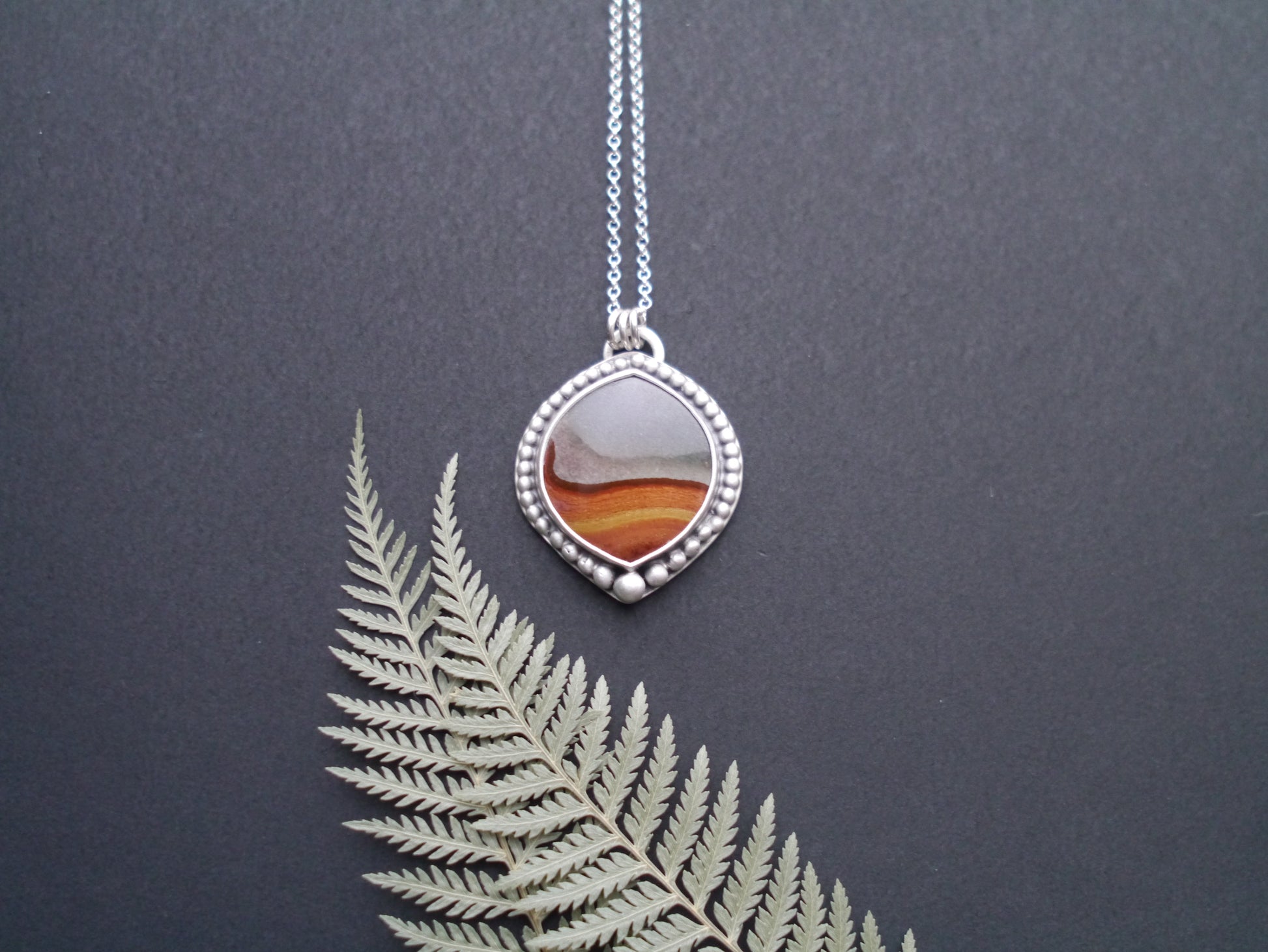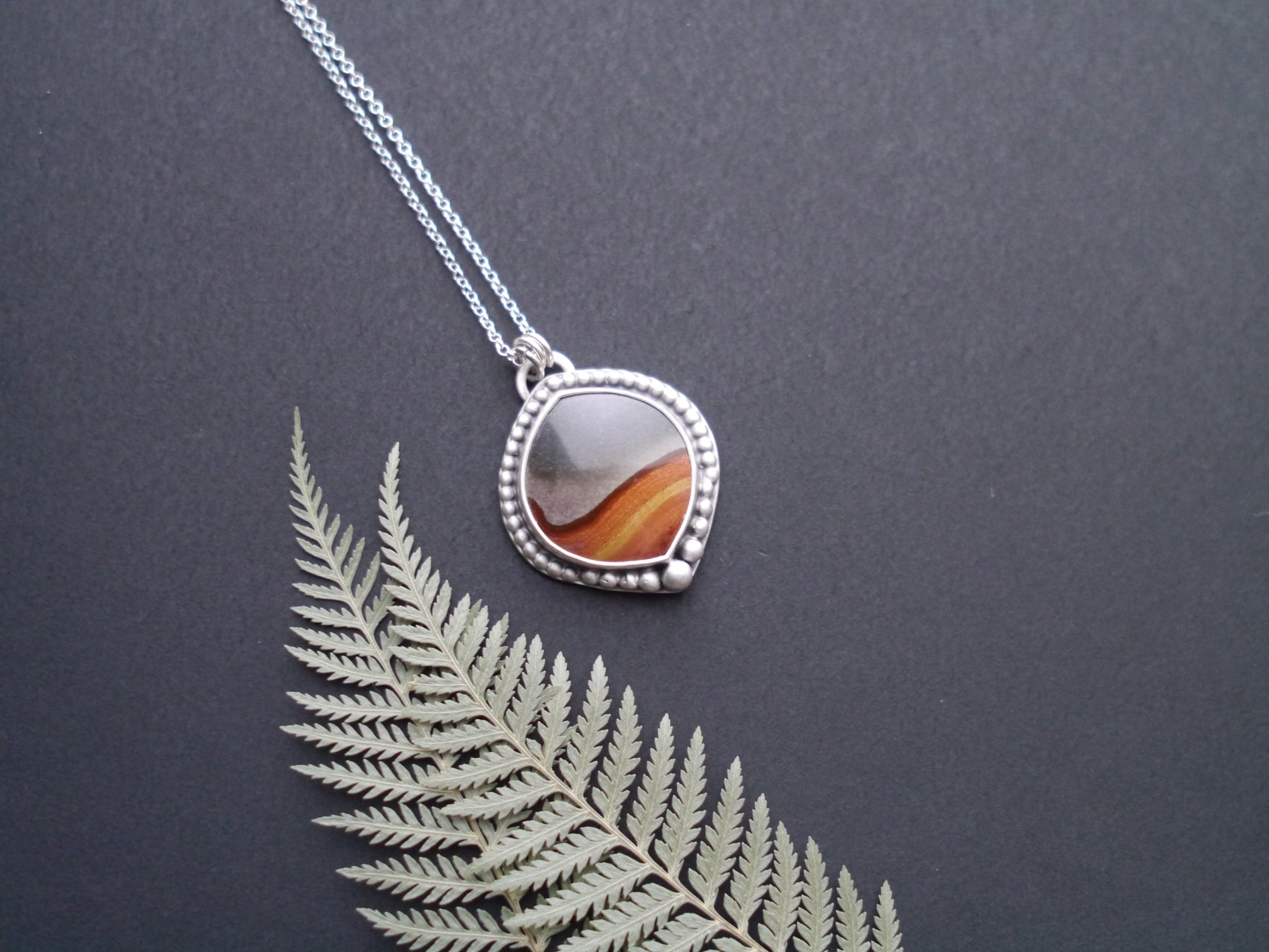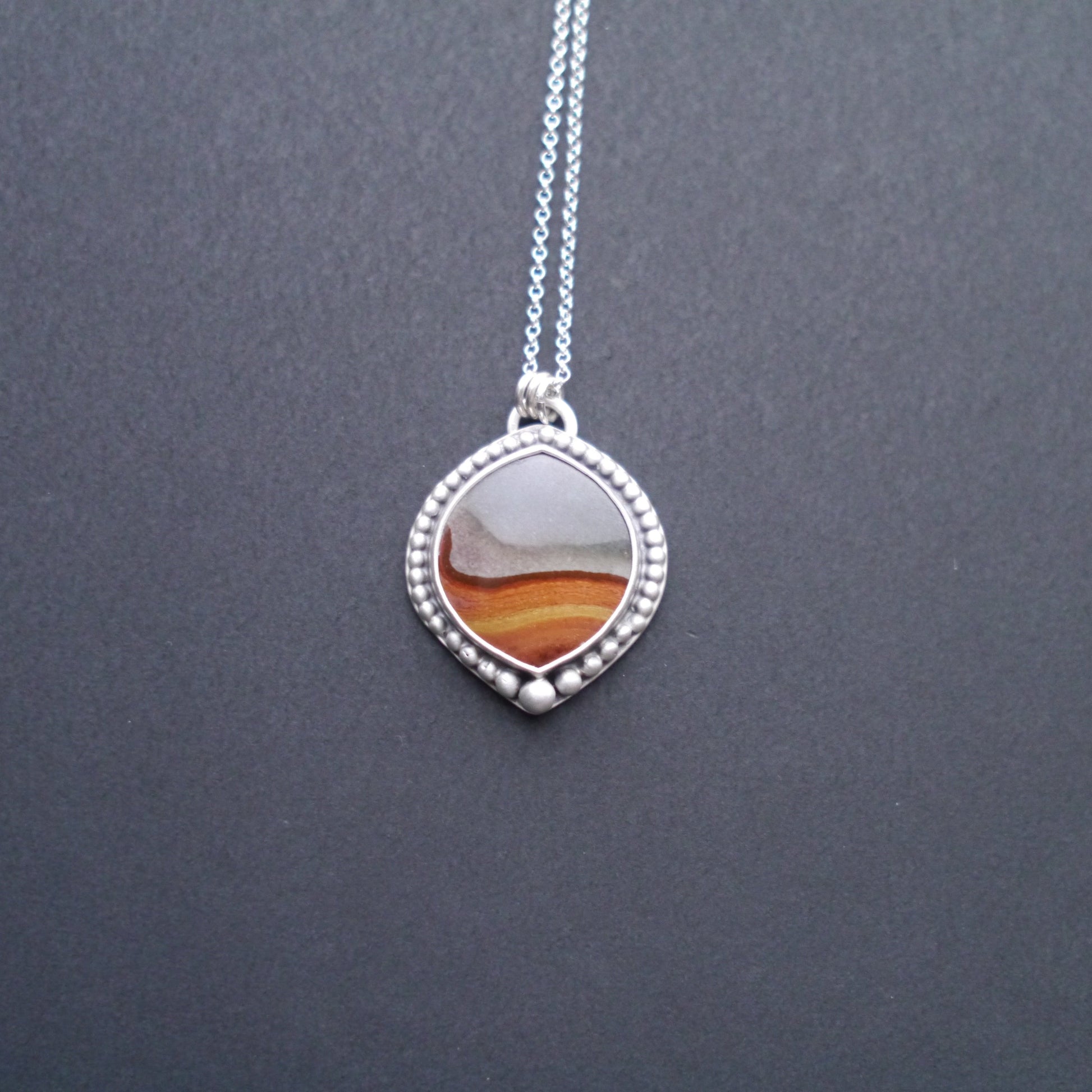 At the heart of each pendant is a unique polychrome jasper gemstone. These natural stones form stunning layers that resemble painted desert and mountain scenes, each telling a story of the earth's artistry. Our polychrome jasper is ethically sourced from Madagascar and hand cut by local lapidaries.