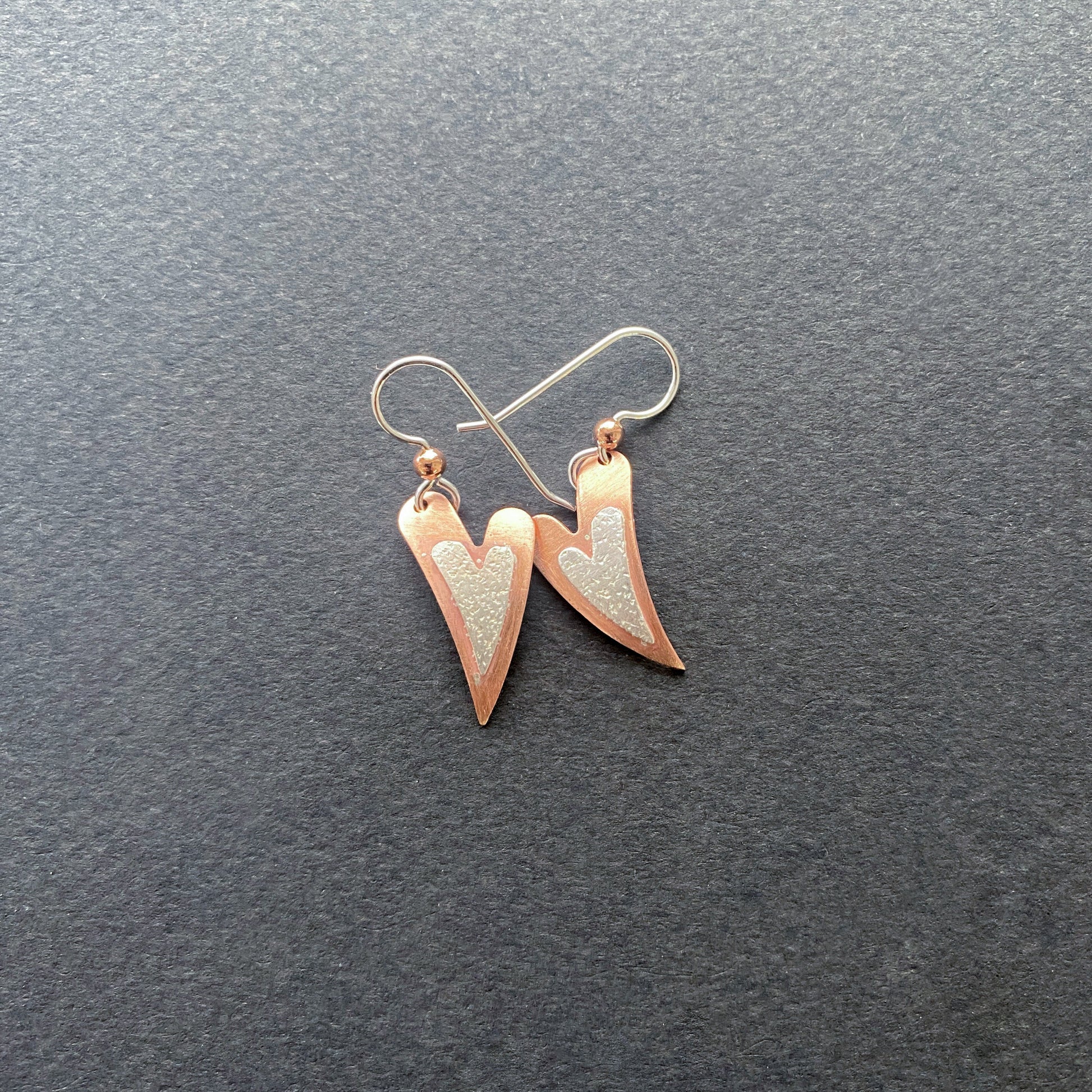 For the free spirits and the wild at heart. The Wildheart Earrings blend the warmth of recycled copper with the timeless beauty of sterling silver, creating a rich, earthy contrast. Handcrafted with care, each earring features textured layers of copper and sterling silver hearts, symbolizing strength, passion, and connection to nature.