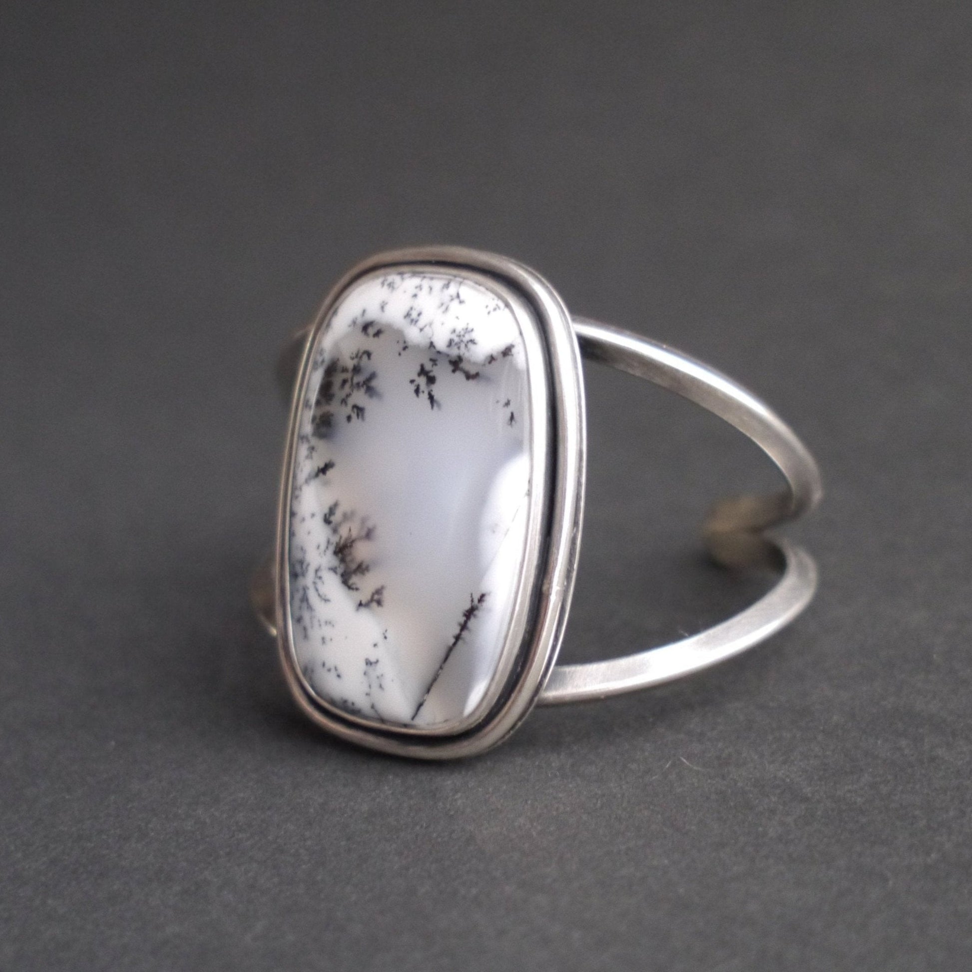 The Dendritic Opal Cuff Bracelet captures the serene beauty of winter in its elegant design. Featuring dendritic agate stones, each with a milky white hue and a deep grey-blue translucent luster, this piece evokes the imagery of ice-covered waters and snow-dusted tree branches. The stones are carefully set in fine silver bezels, resting atop a sleek sterling silver cuff, creating a striking contrast between the natural beauty of the stone and the polished metal.